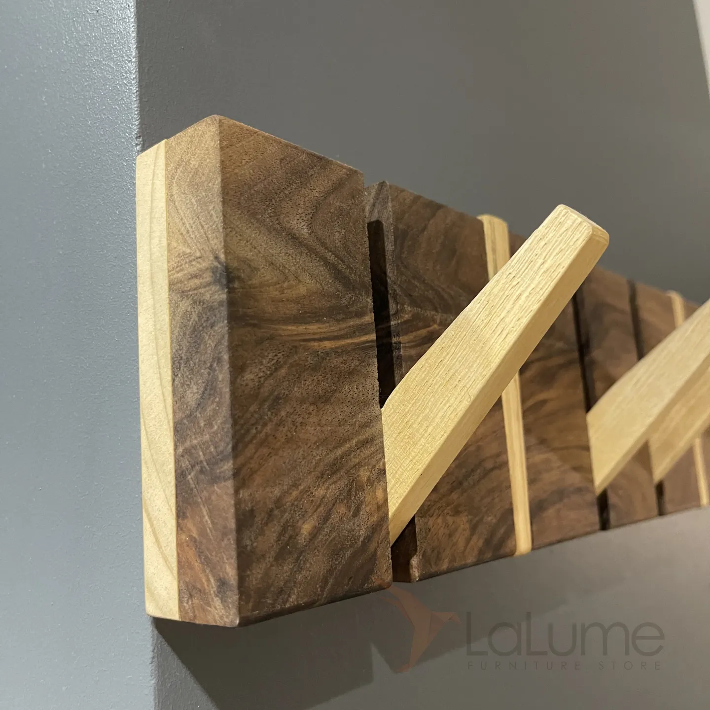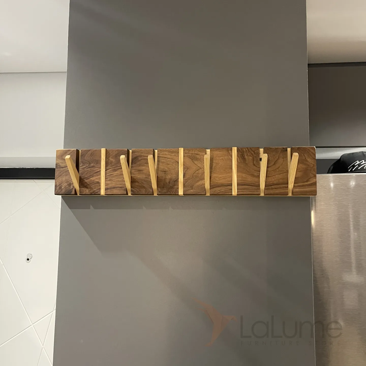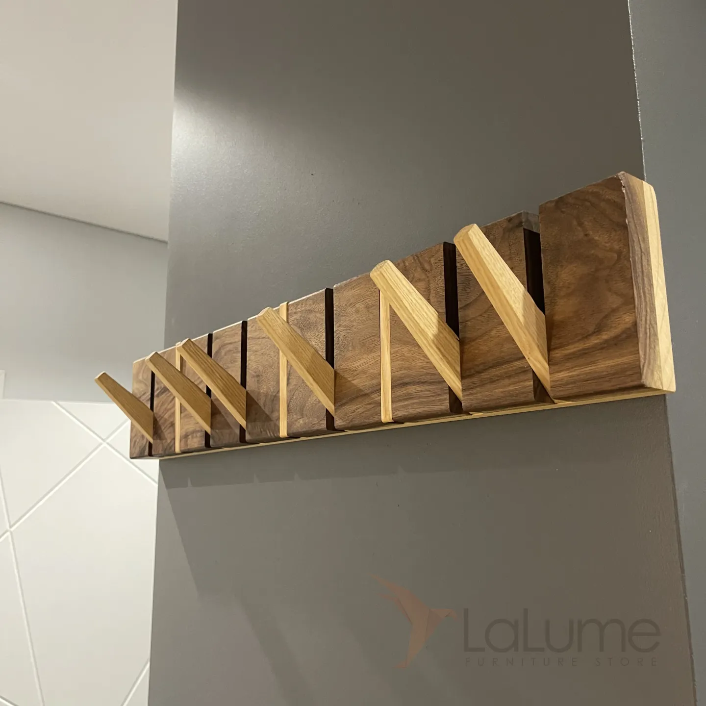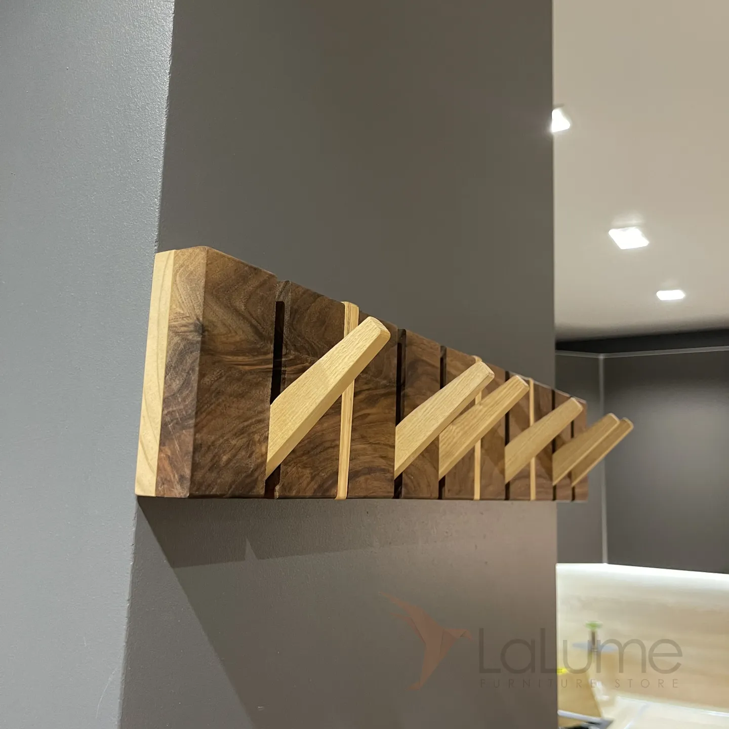 Возможные цвета дерева вы можете увидеть на фото в карточке товара. Доступно два размера: на 9 вешалок длиной 59 см и на 6 вешалок длиной на 41 см. Высота у обоих вариантов 13 см, толщина 4 см. Практичная, стильная и минималистичная. Удивите гостей необычным дизайнерским решением.