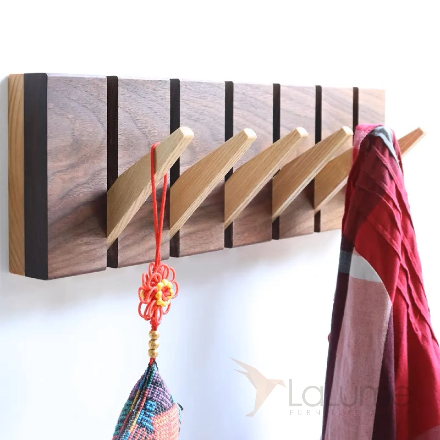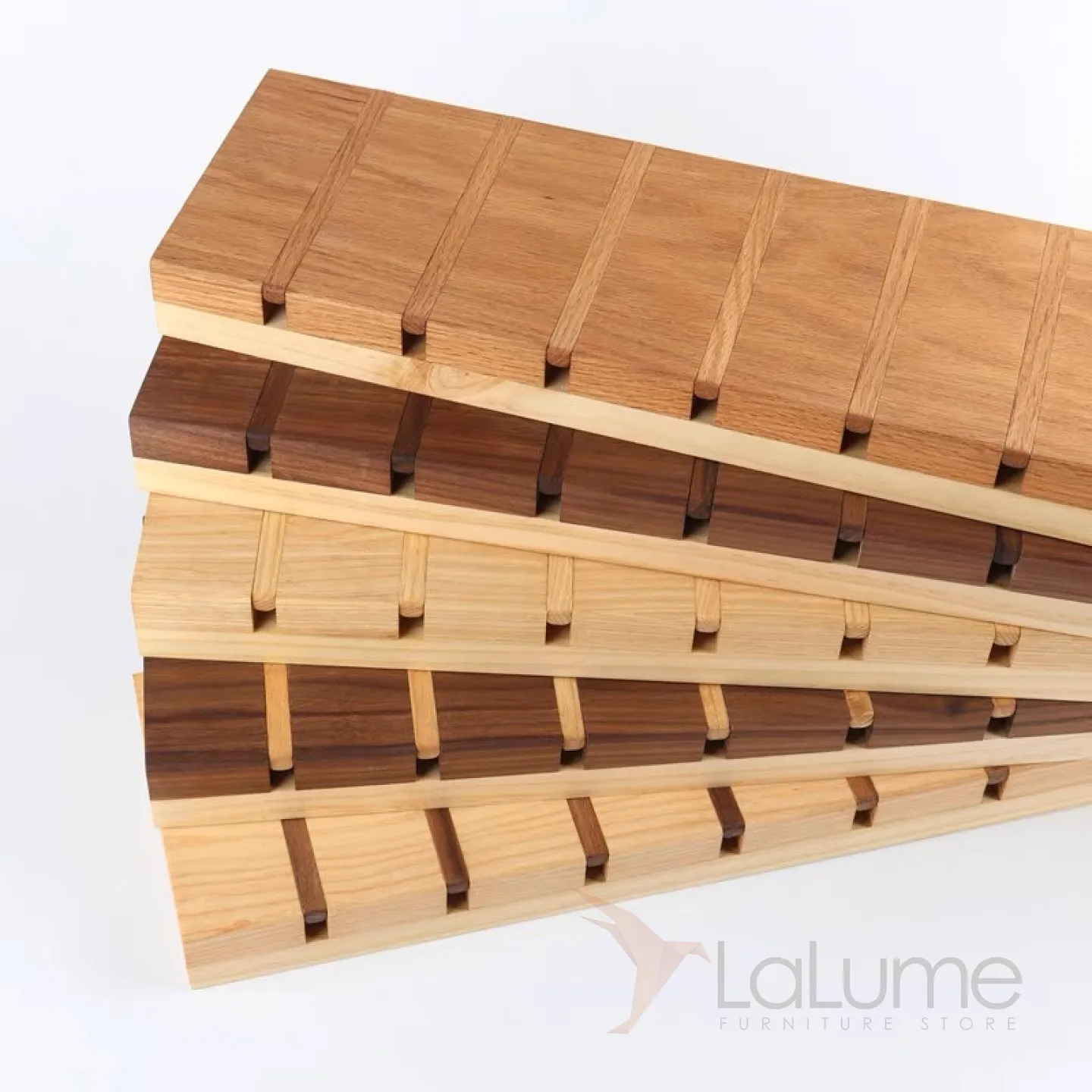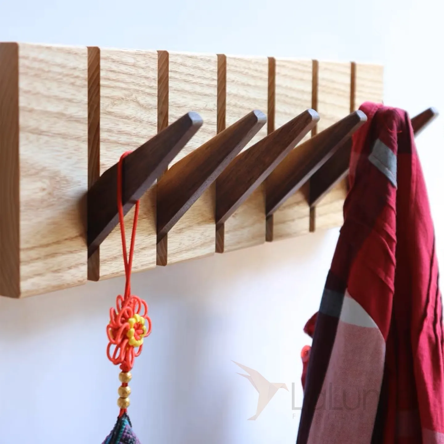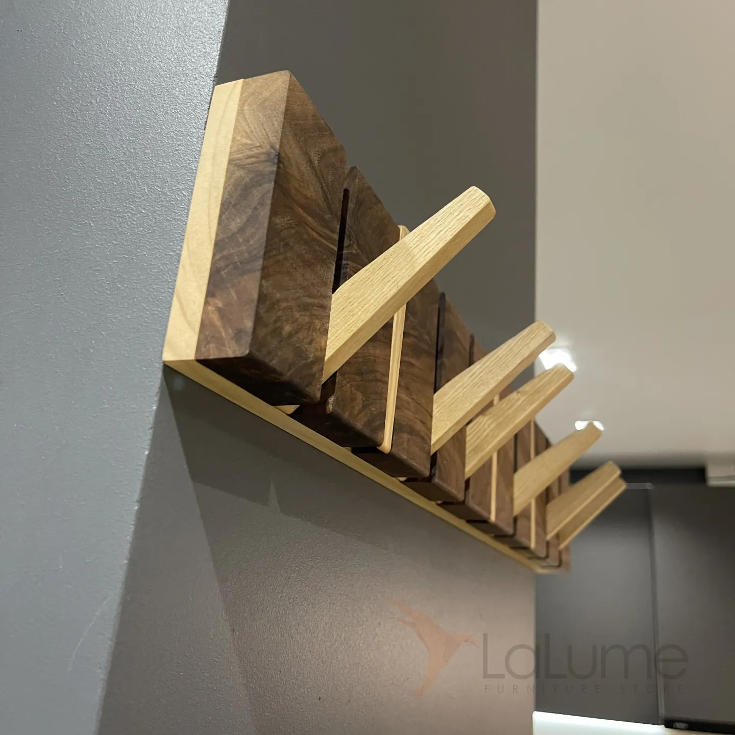 Возможные цвета дерева вы можете увидеть на фото в карточке товара. Доступно два размера: на 9 вешалок длиной 59 см и на 6 вешалок длиной на 41 см. Высота у обоих вариантов 13 см, толщина 4 см. Практичная, стильная и минималистичная. Удивите гостей необычным дизайнерским решением.