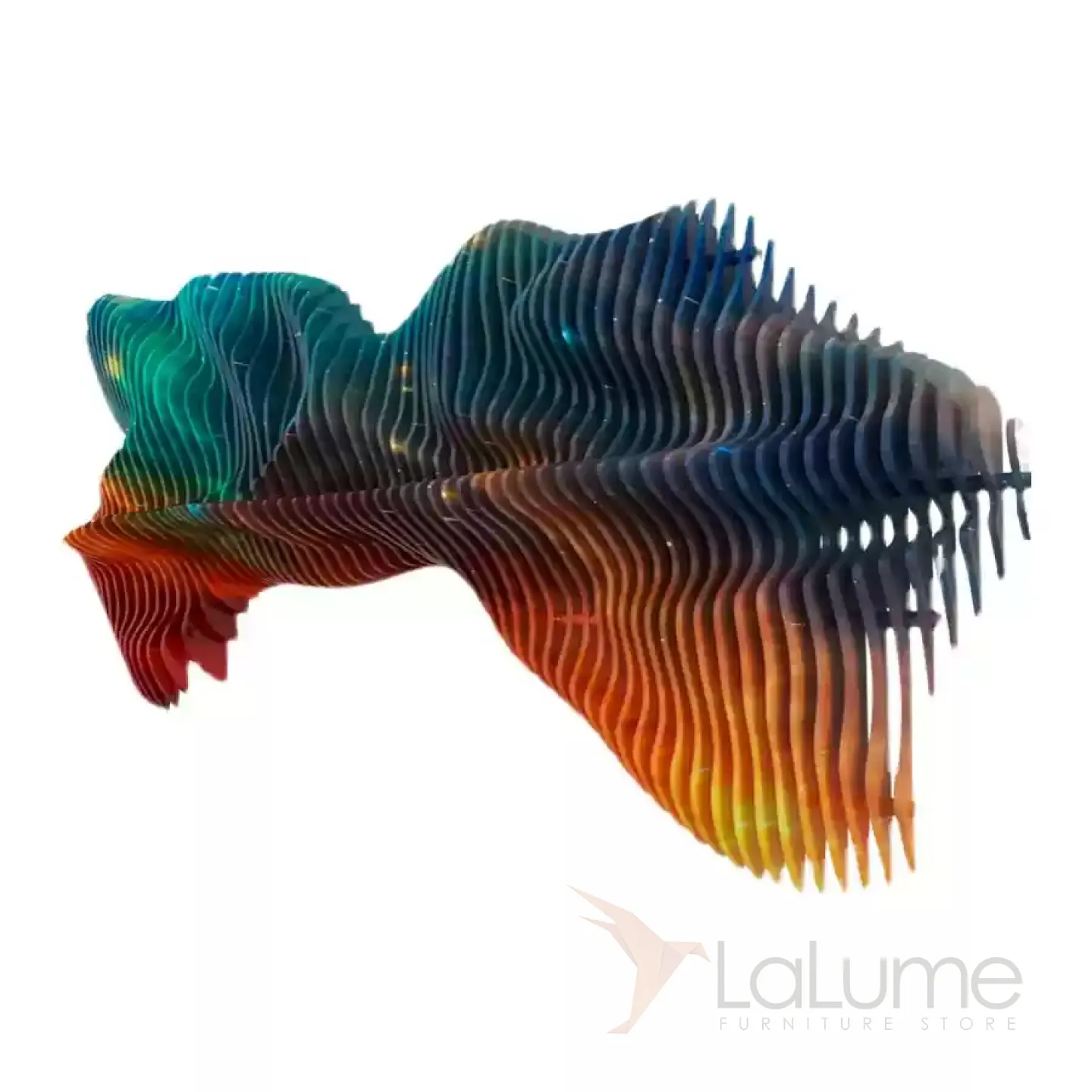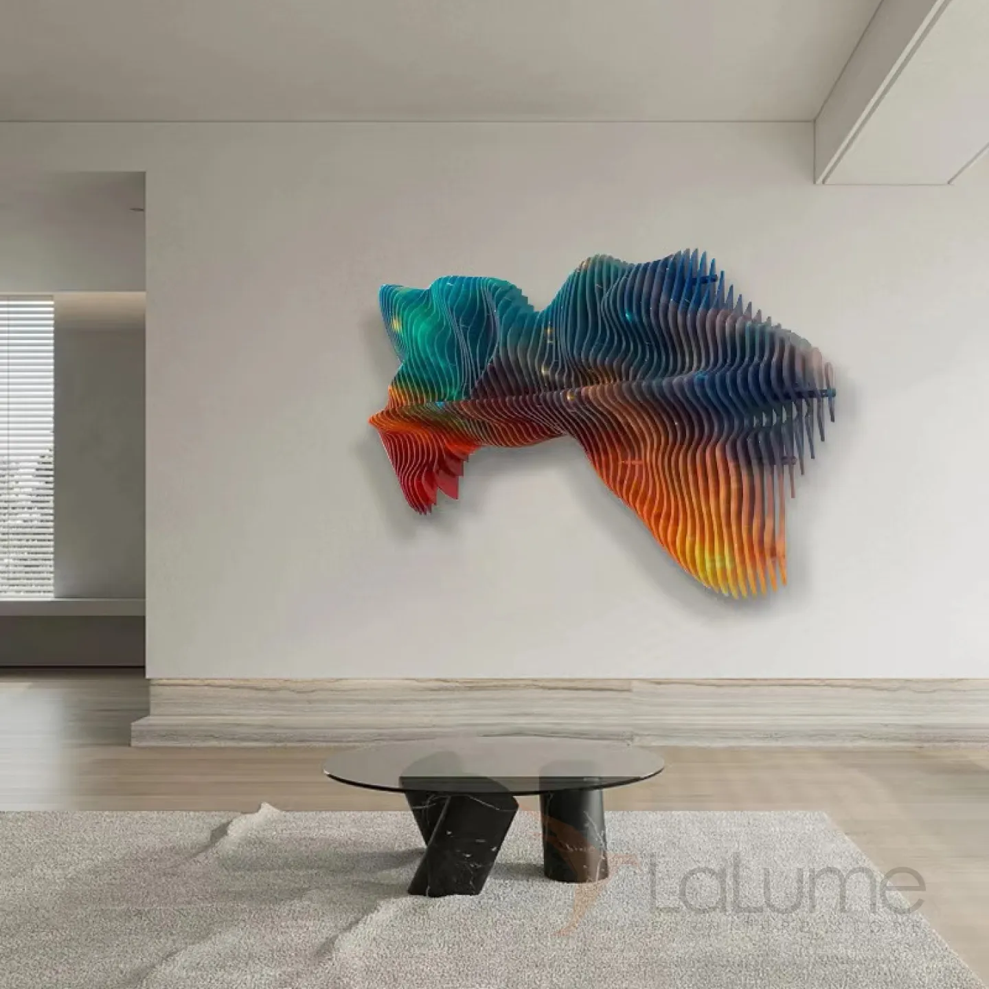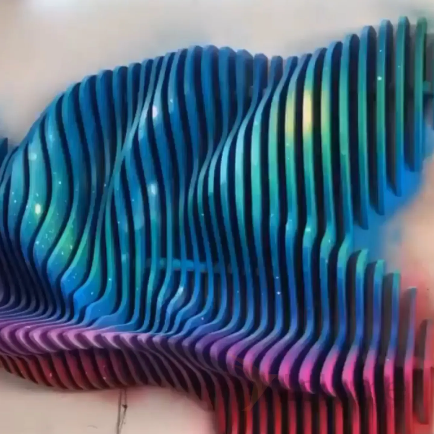 Абстрактная трёхмерная и многоцветная картина, составленная из множества деревянных элементов, представляет собой уникальную и обтекаемую композицию, которая способна выгодно подчеркнуть интерьер не только в доме, но и в офисе или кафе.