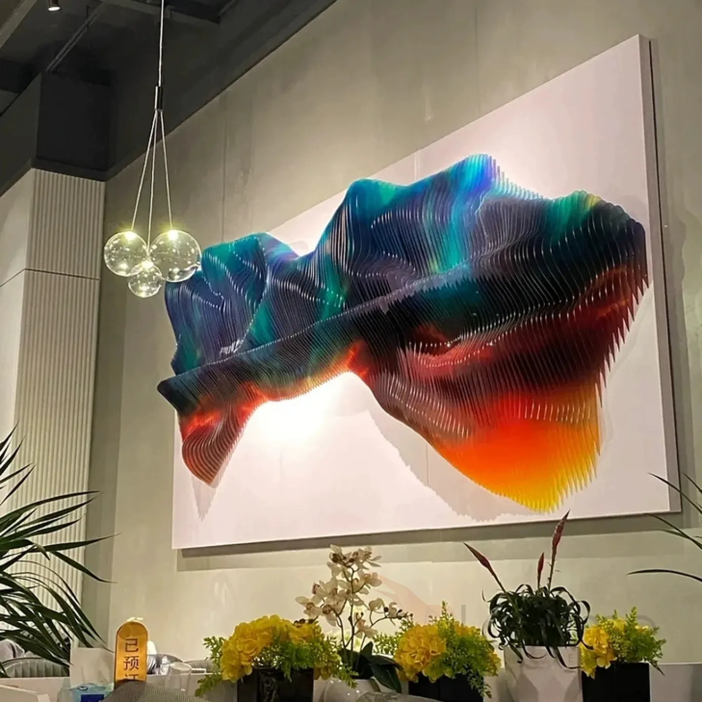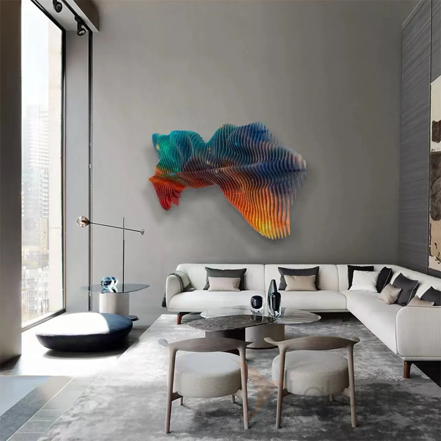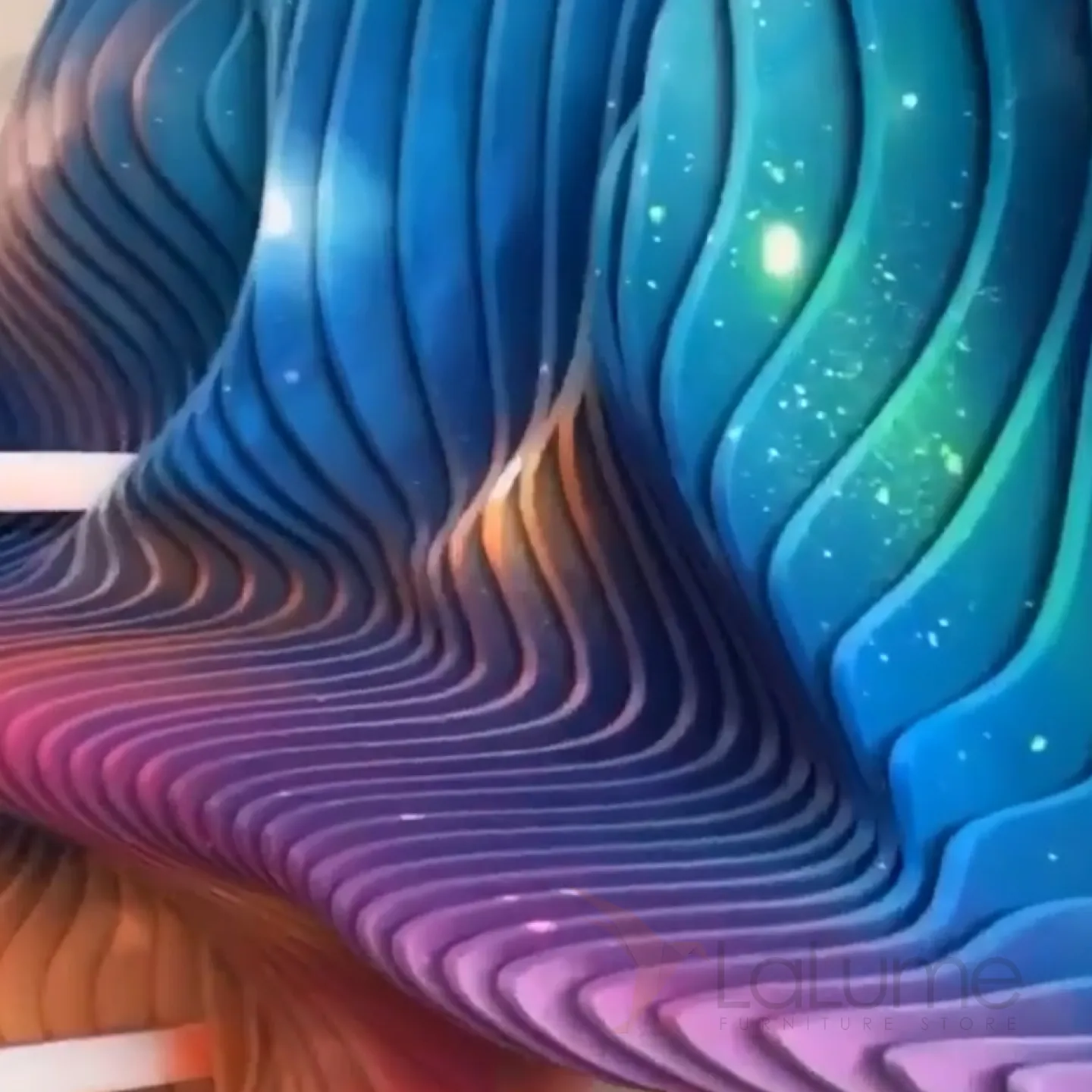 Абстрактная трёхмерная и многоцветная картина, составленная из множества деревянных элементов, представляет собой уникальную и обтекаемую композицию, которая способна выгодно подчеркнуть интерьер не только в доме, но и в офисе или кафе.