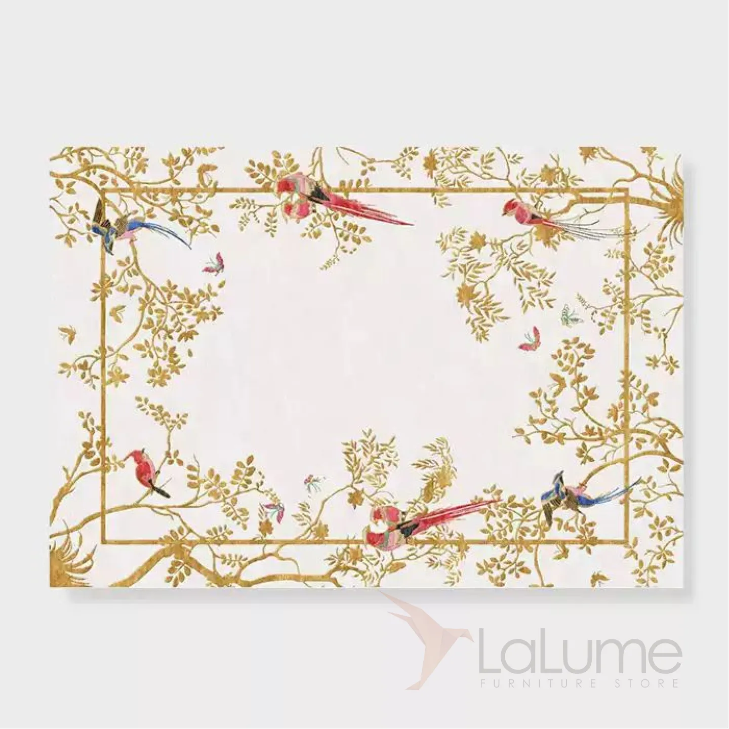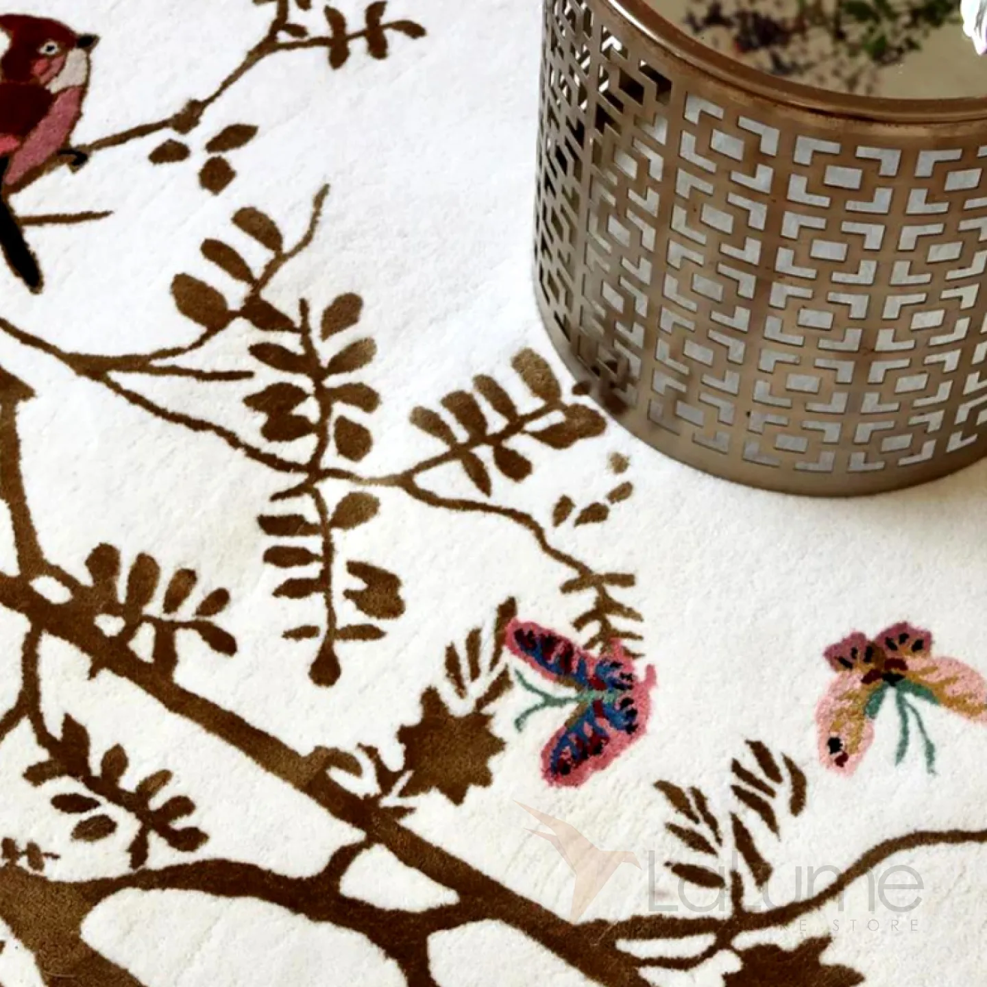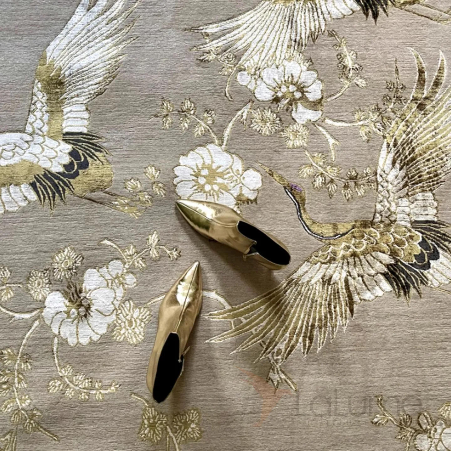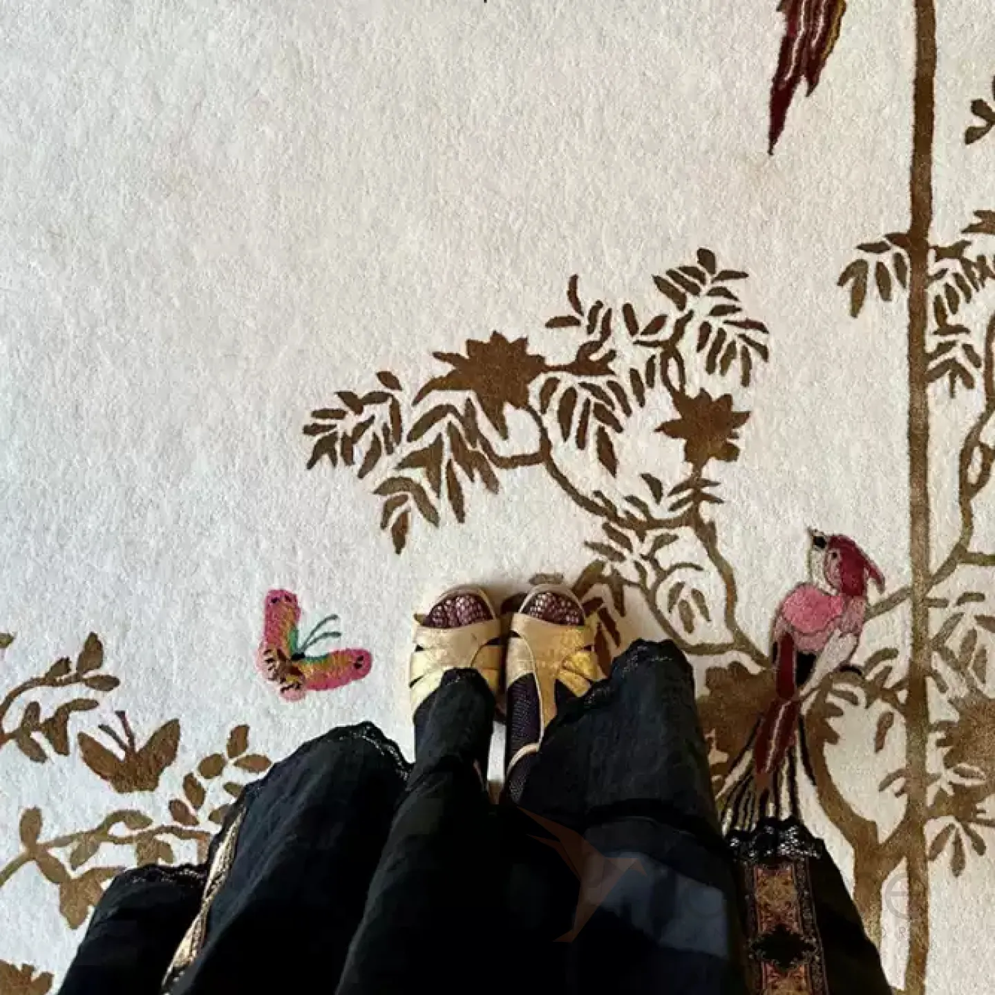 Ковёр из шерсти новозеландских овец и шёлка станет изысканным акцентом в любом интерьере. Утончённые узоры с изображением птиц придают ему особый шарм. В ассортименте представлены ковры разных размеров и оттенков.