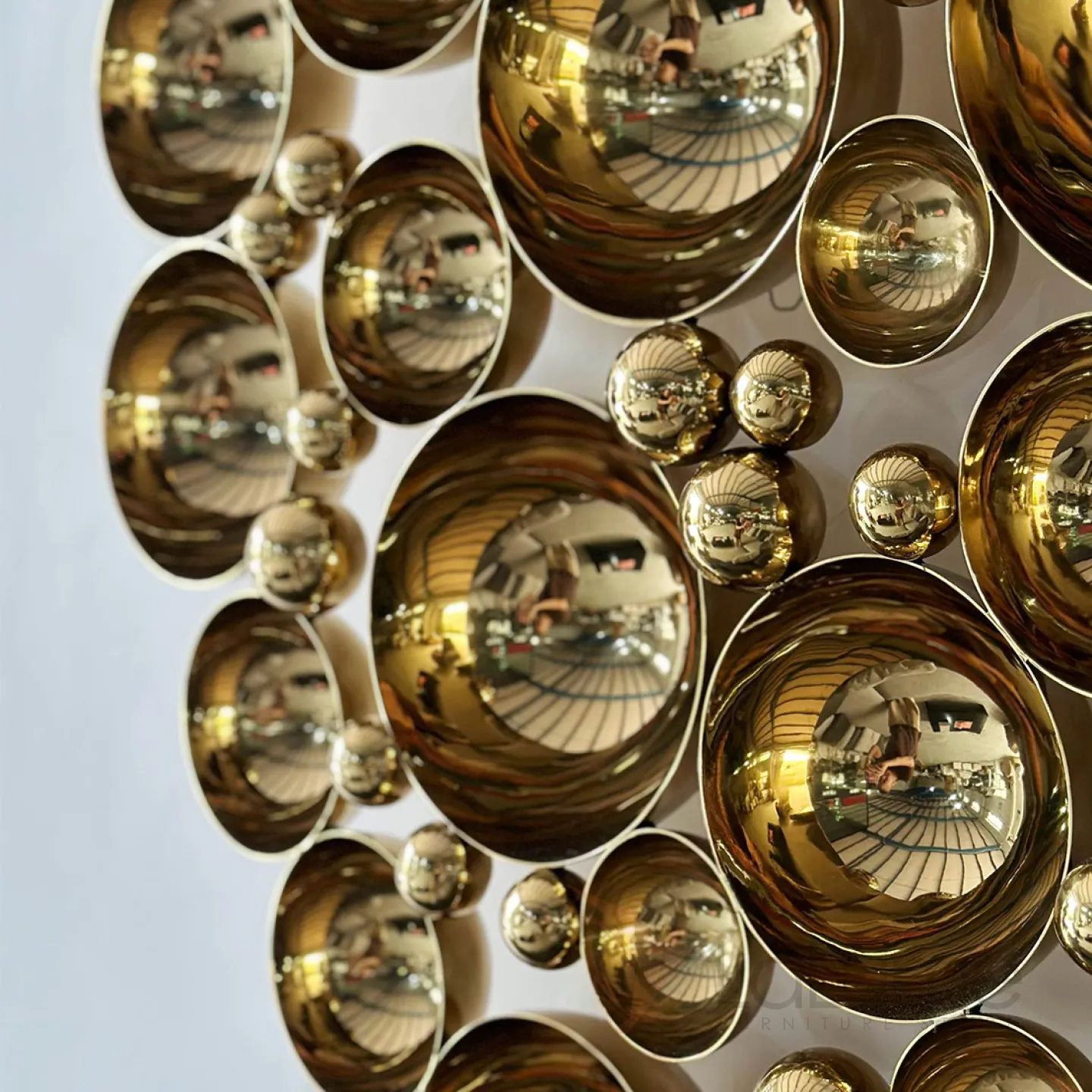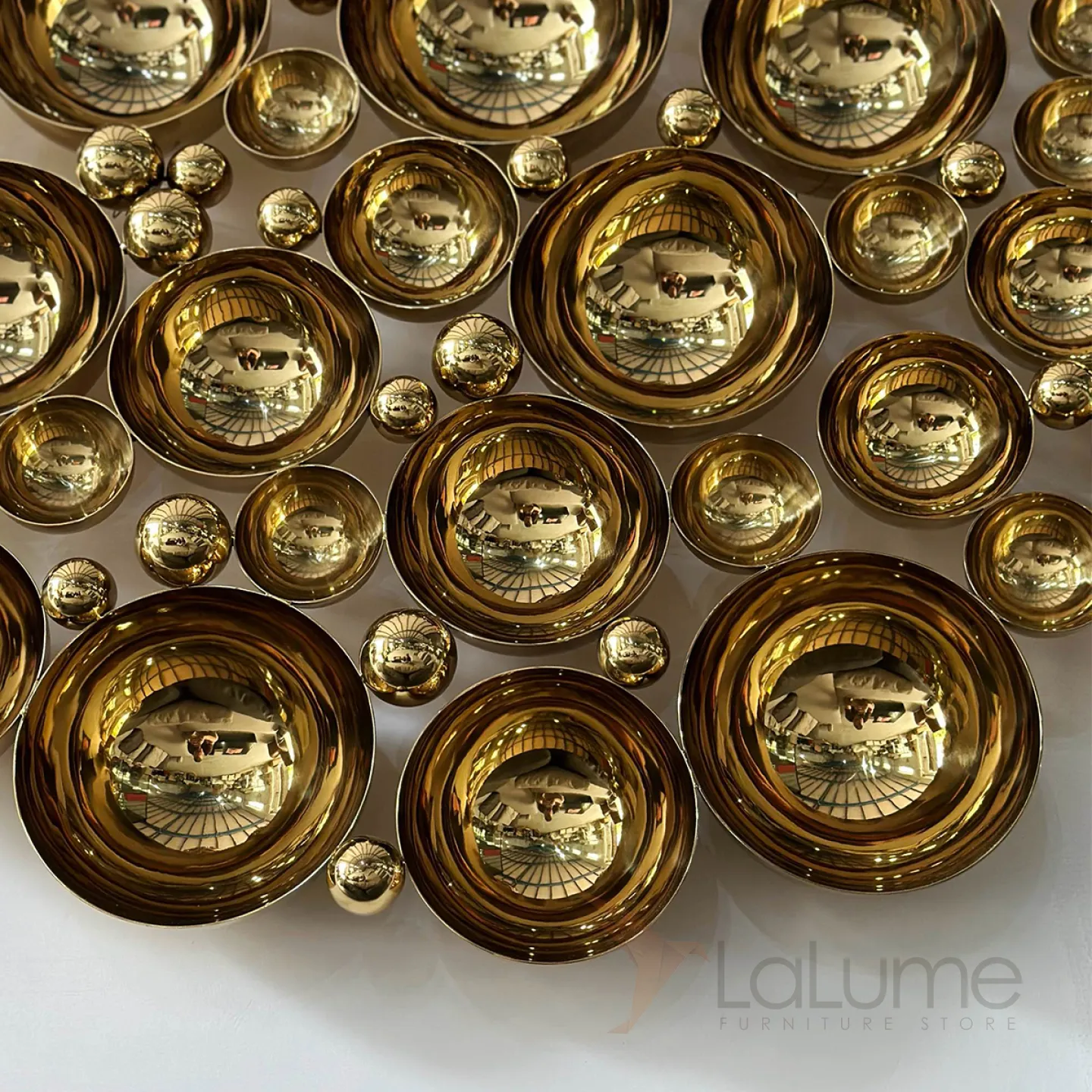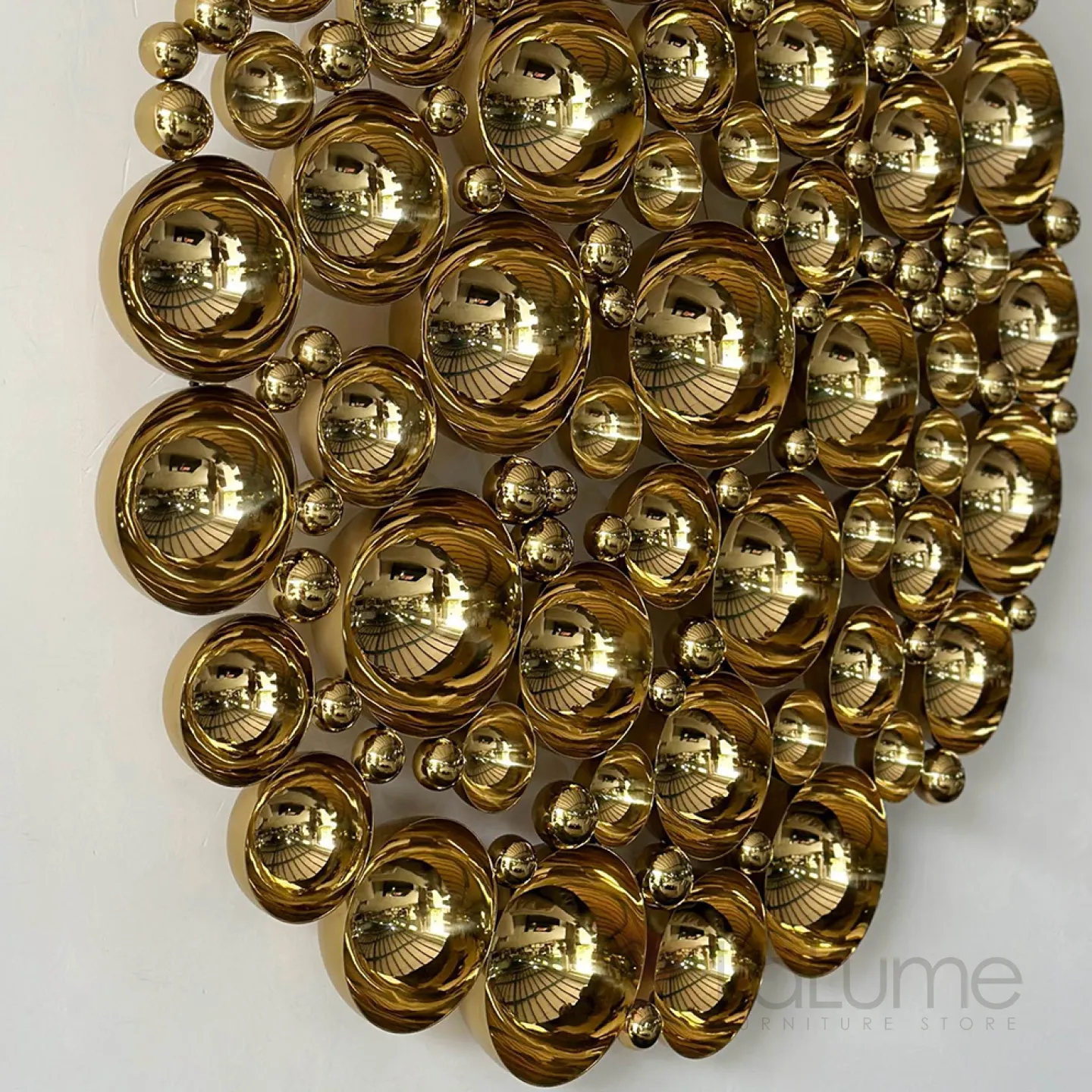 Оригинальное панно из разных по диаметру вогнутых полусфер из нержавеющей стали с гальваническим покрытием привлекает внимание в интерьере.