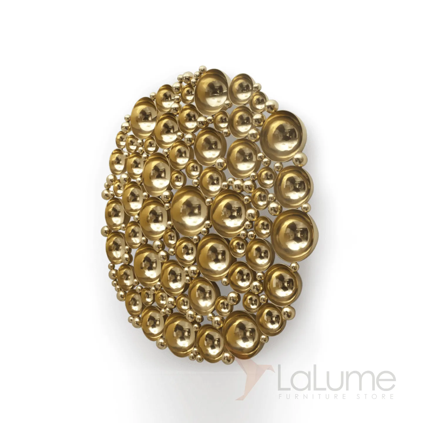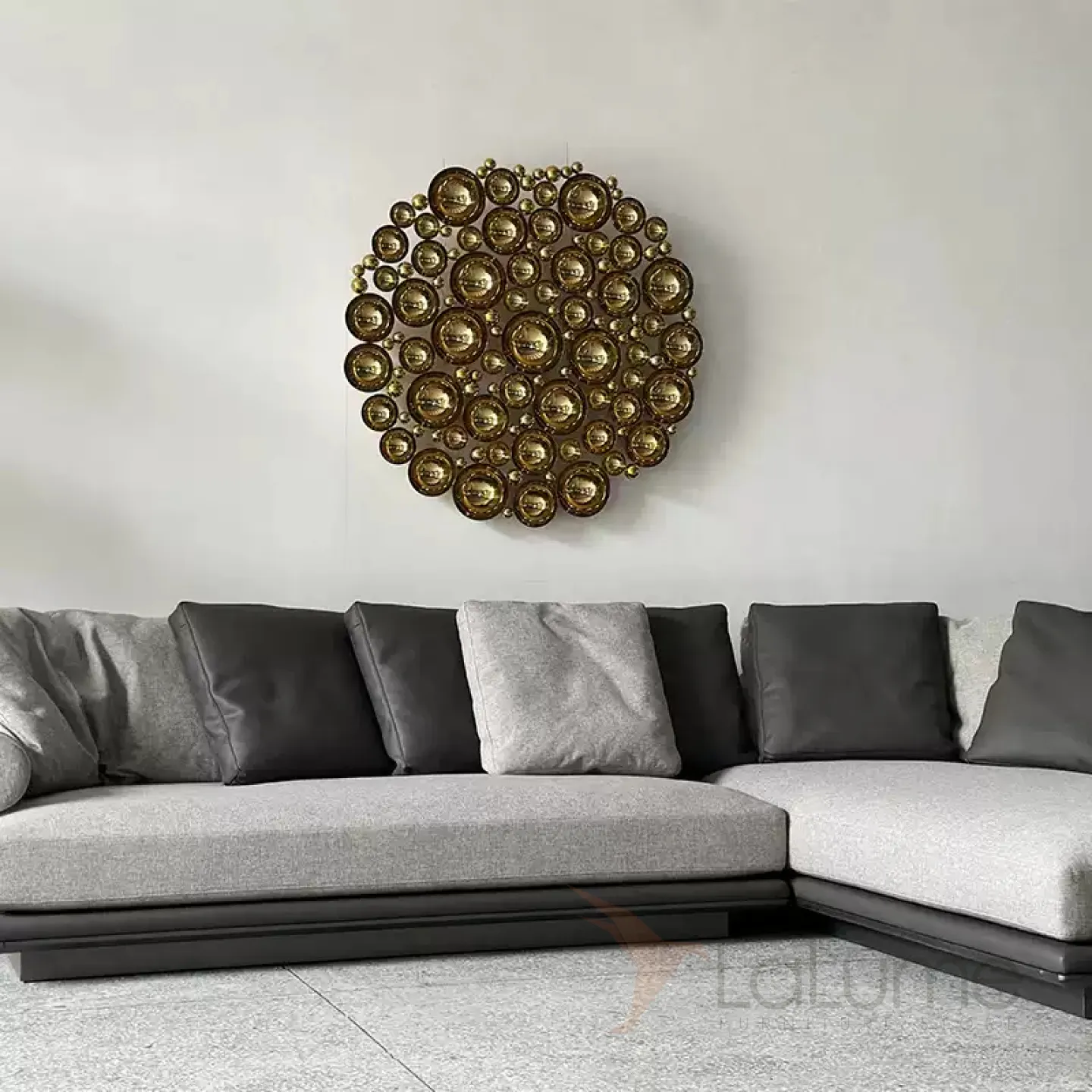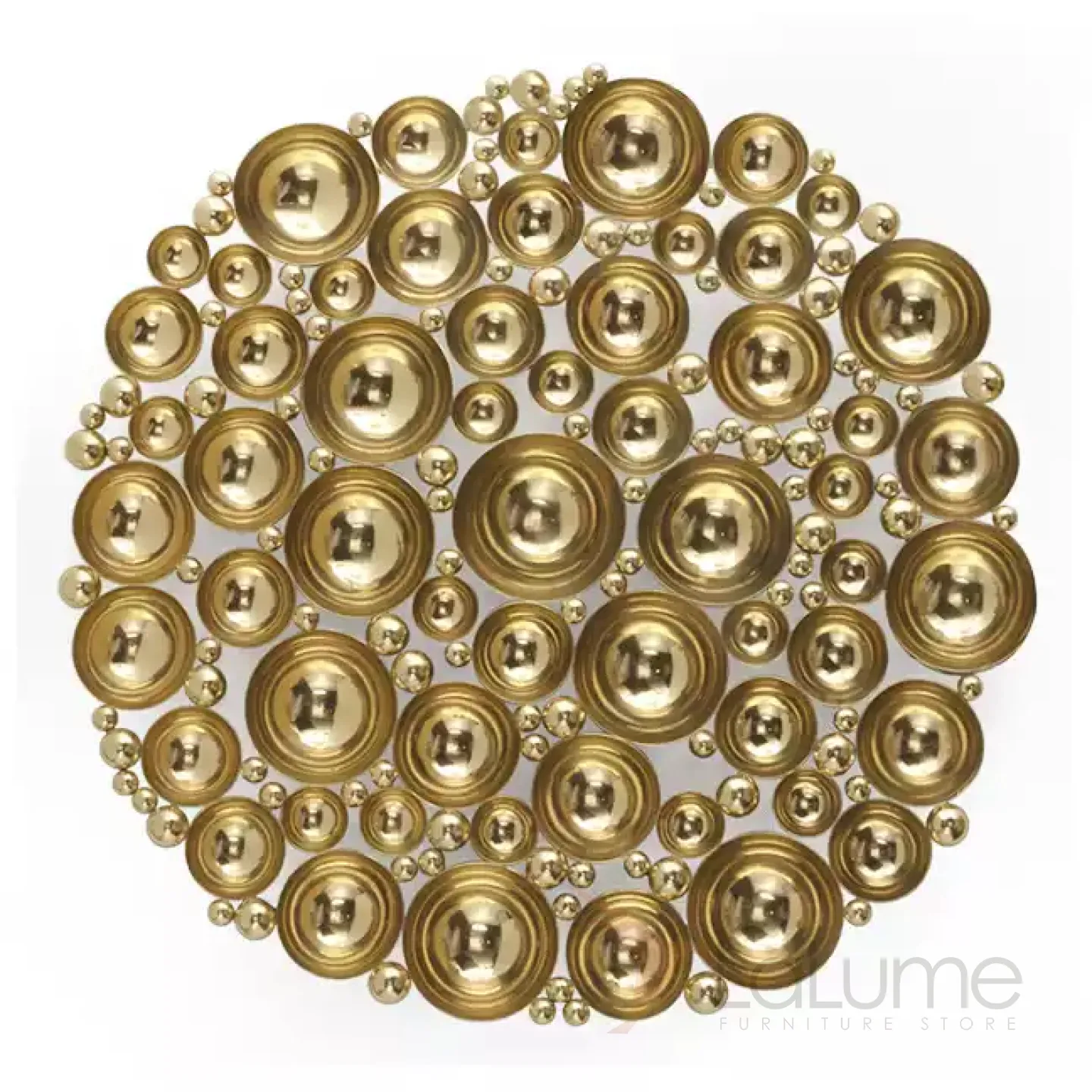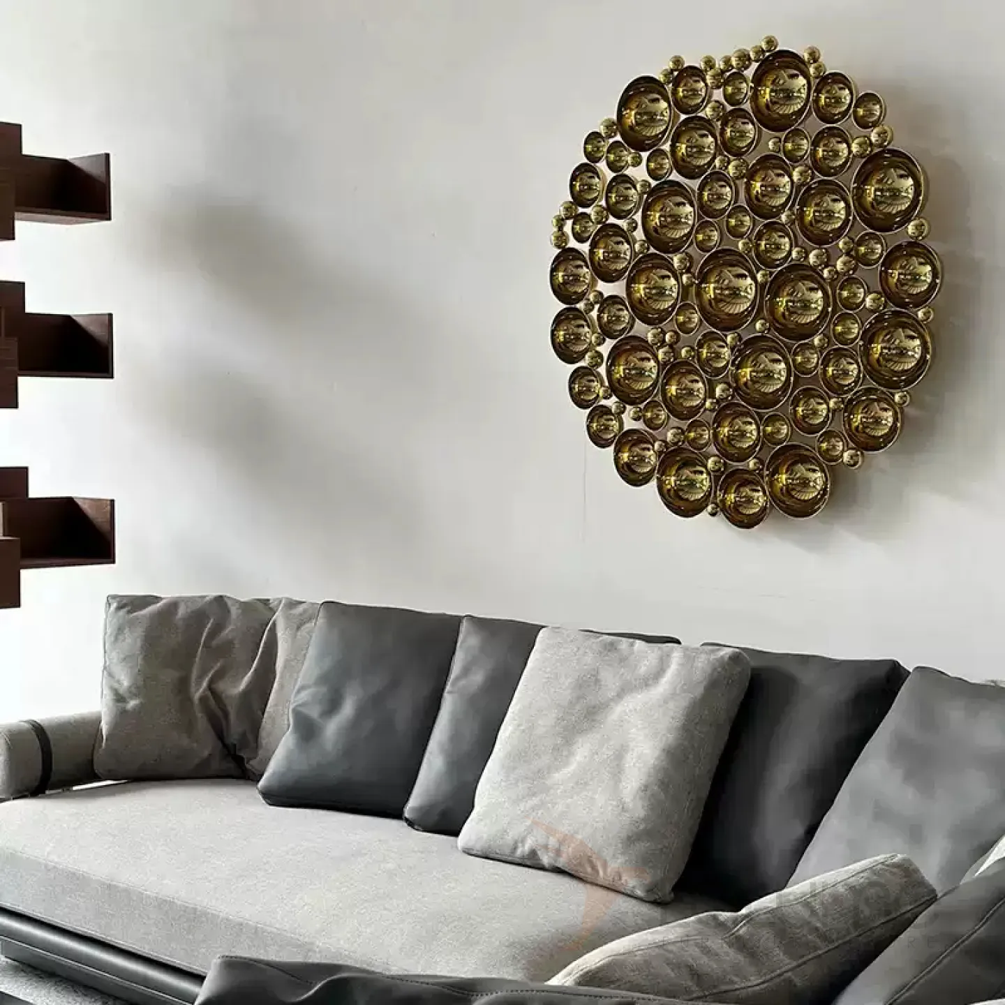 Оригинальное панно из разных по диаметру вогнутых полусфер из нержавеющей стали с гальваническим покрытием привлекает внимание в интерьере.