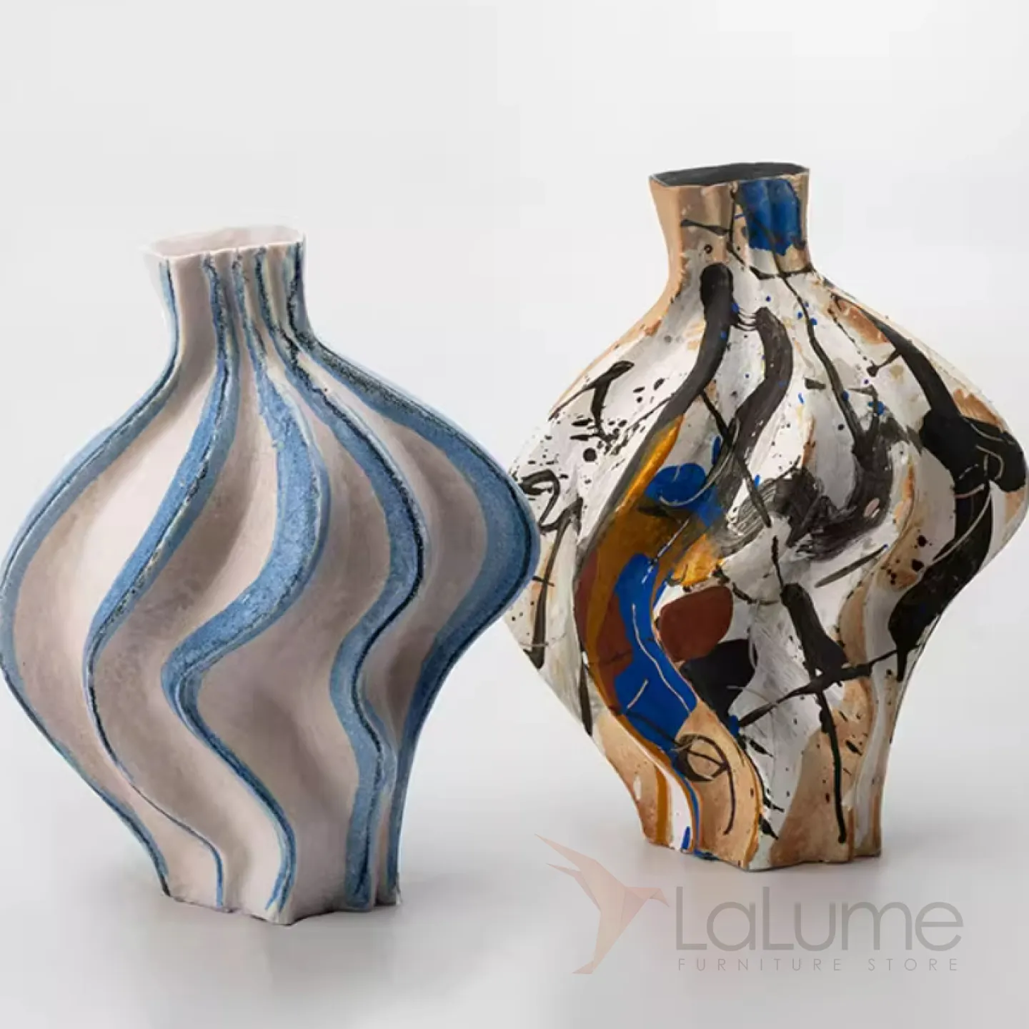 Керамическая ваза необычной формы с узким горлышком станет украшением интерьера. На выбор разные модели.