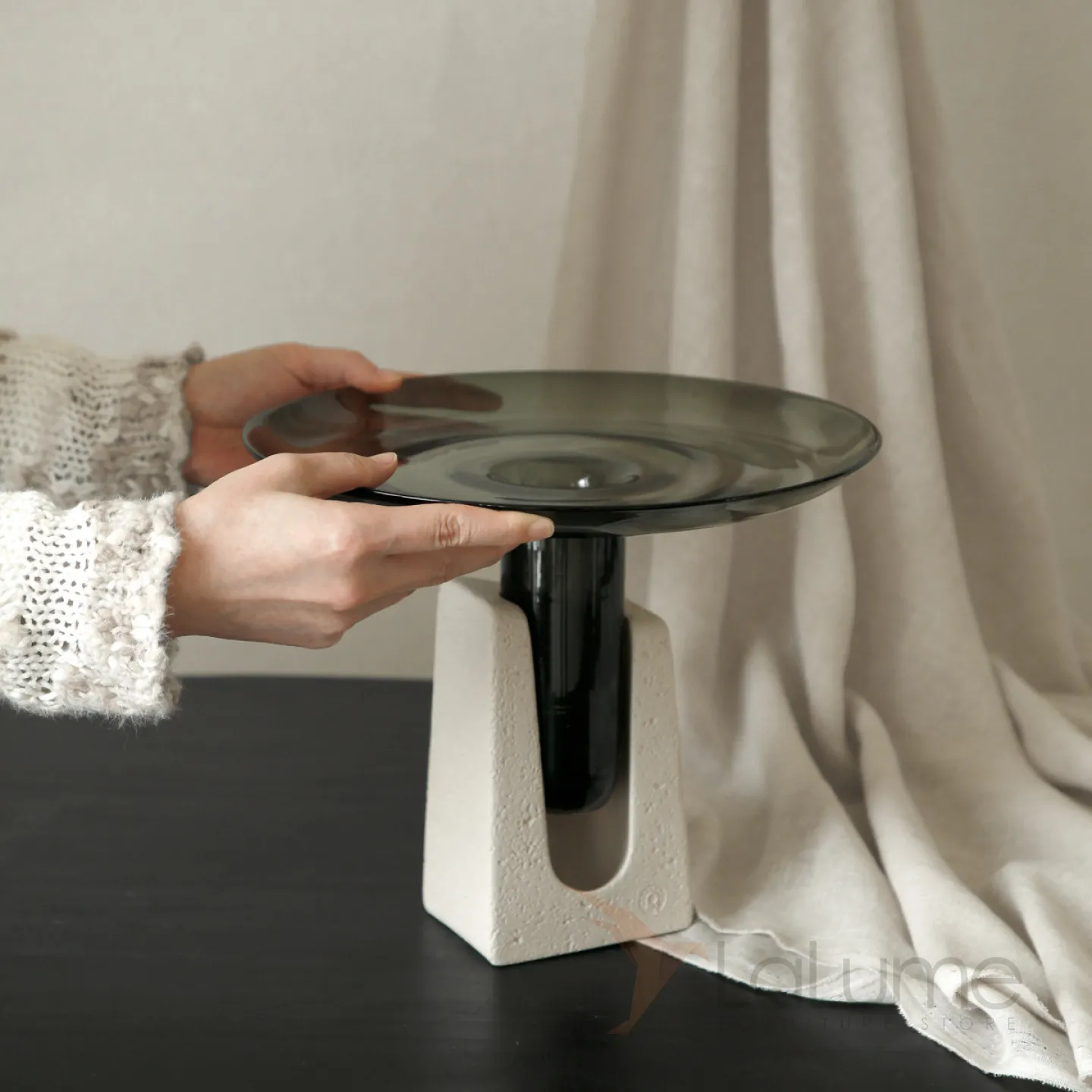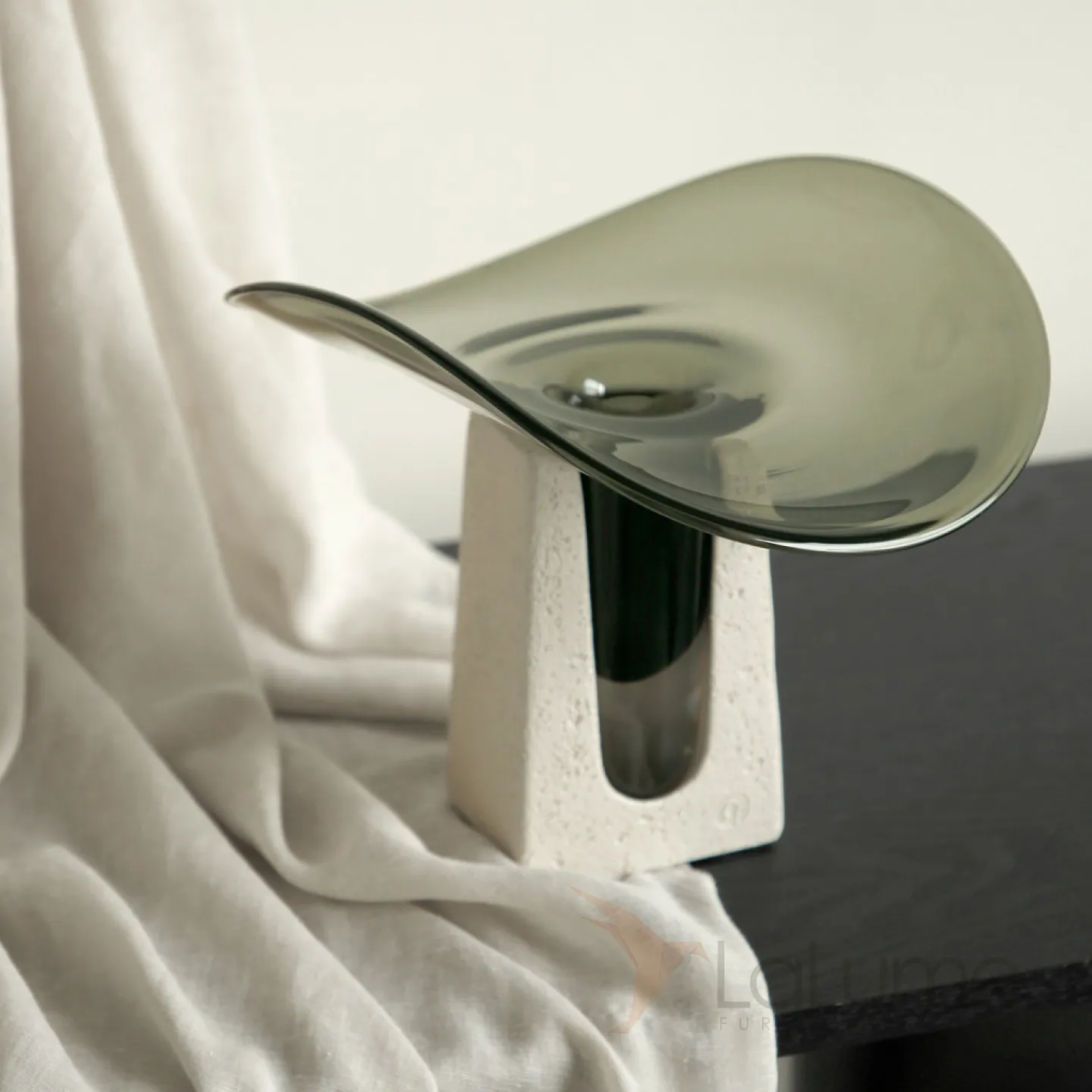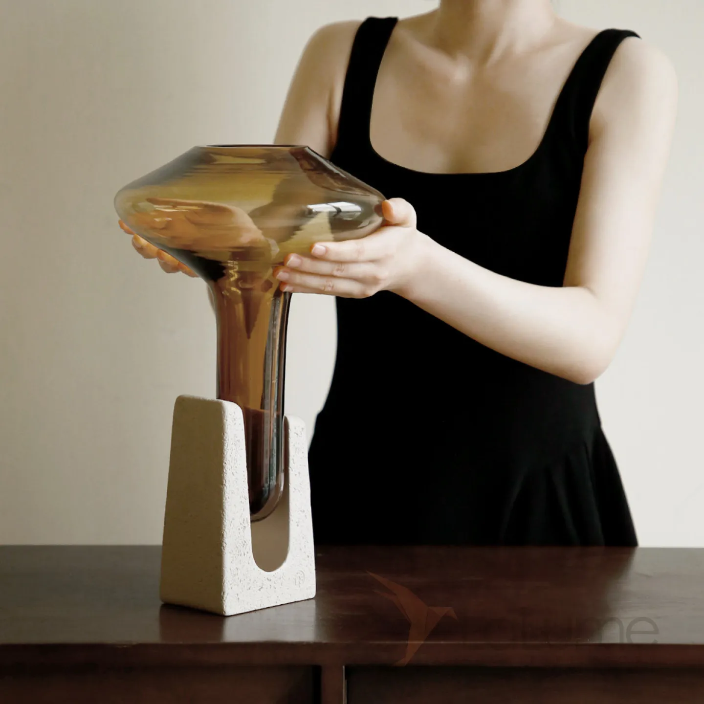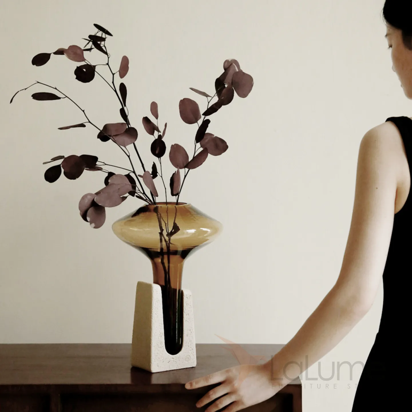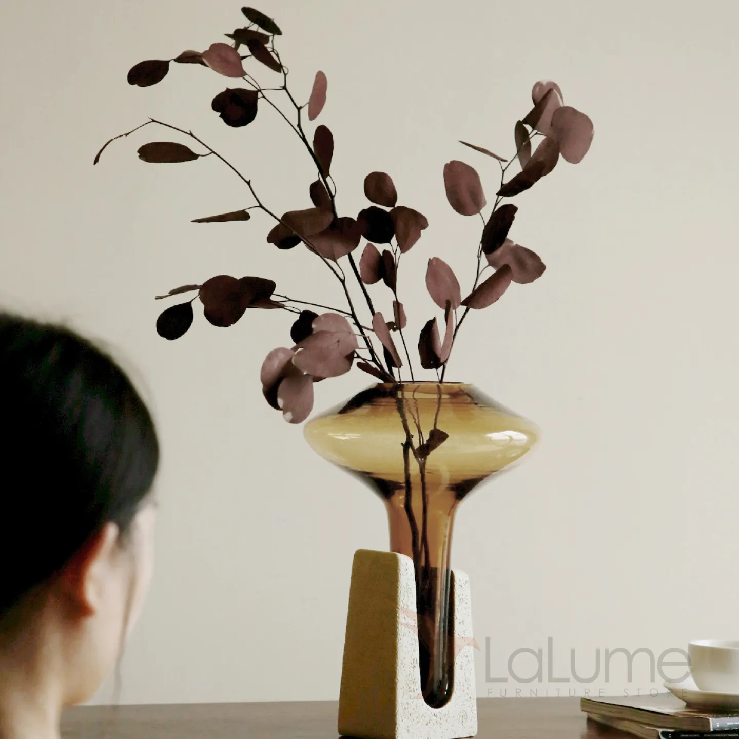 Эта оригинальная ваза сочетает в себе минимализм и художественный подход к дизайну. Изделие состоит из двух частей: стеклянной вазы янтарного оттенка и устойчивого основания из материала, имитирующего натуральный камень.