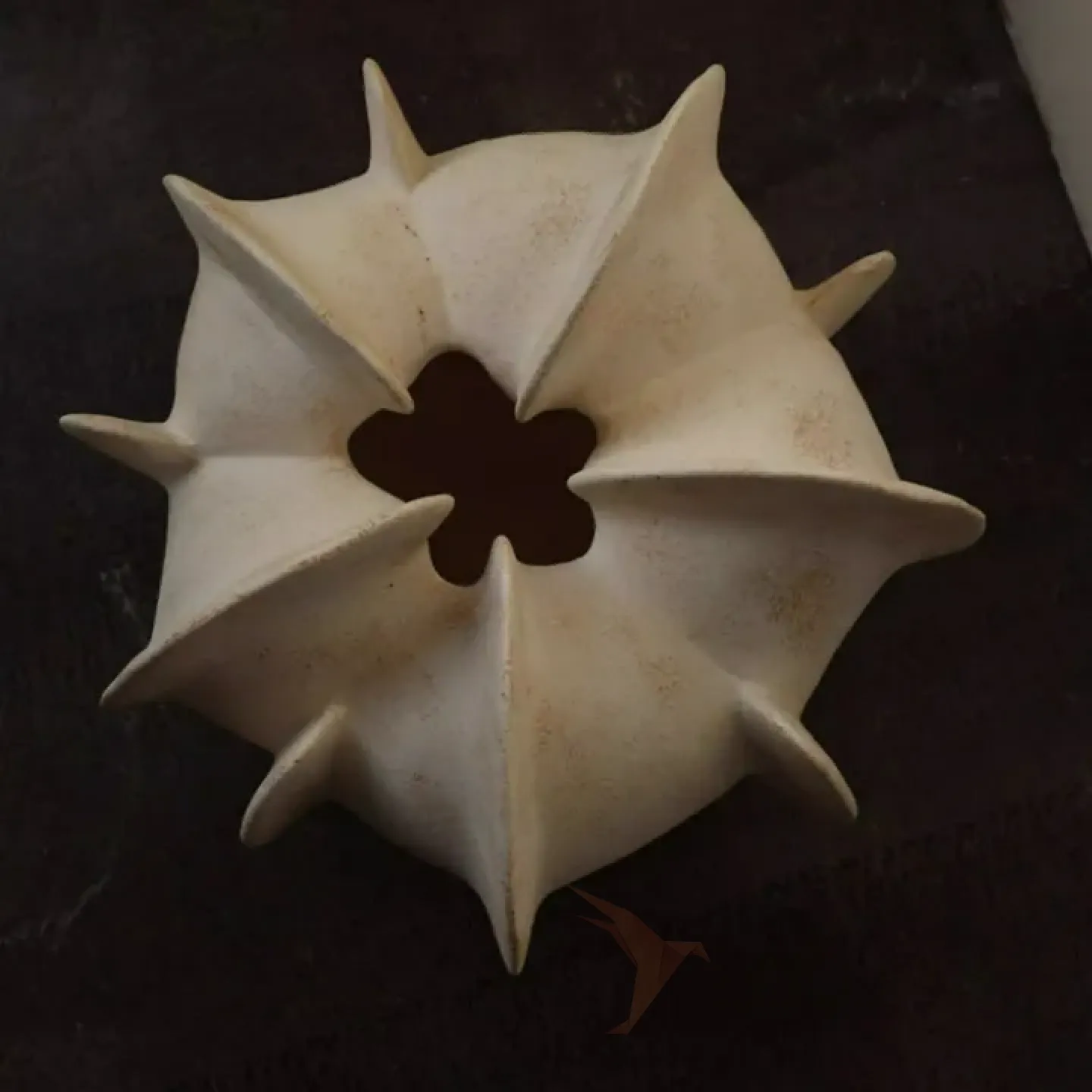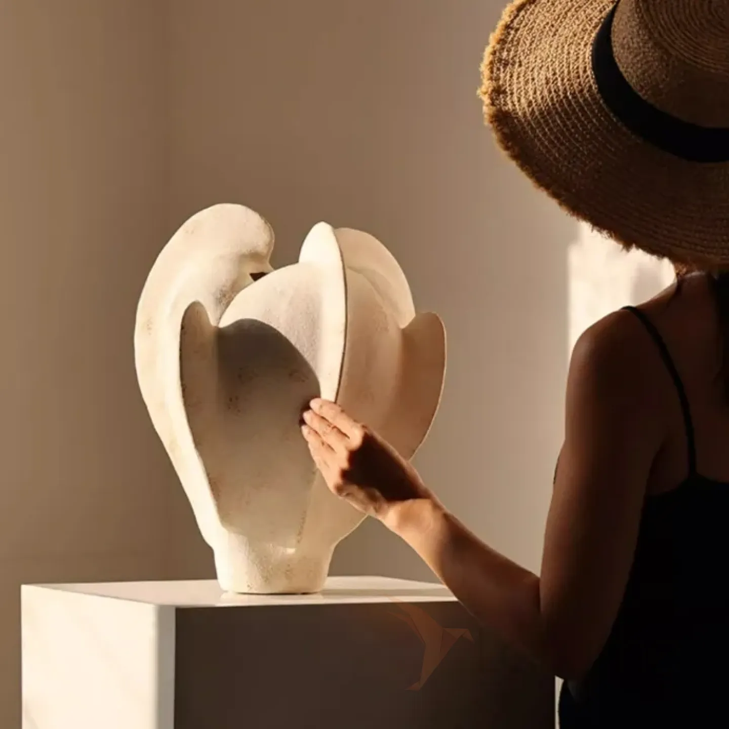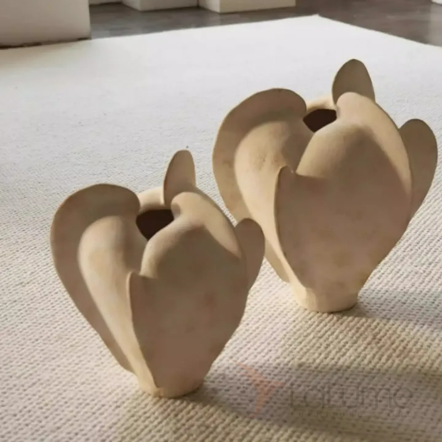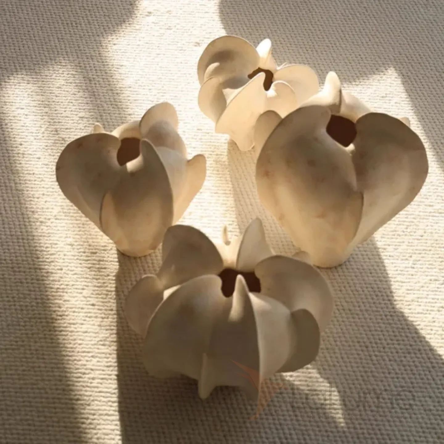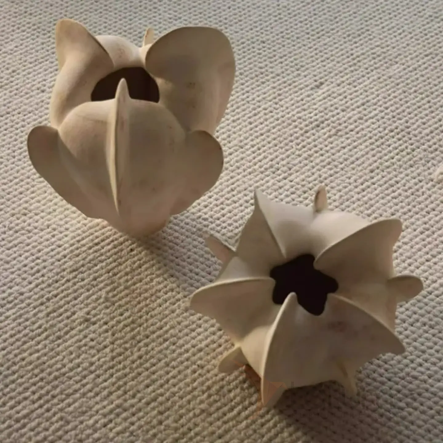 Керамическая ваза необычной формы, напоминающей распускающийся цветок или абстрактную скульптуру. Выполнена в нейтральном бежевом оттенке, с плавными, текучими линиями. Компактный размер и органичный дизайн делают её стильным элементом декора — подойдёт для гостиной, рабочего стола или полки. Матовая поверхность подчёркивает ручную работу и добавляет уюта в интерьер.