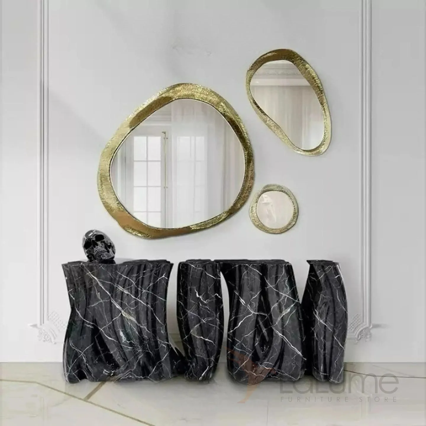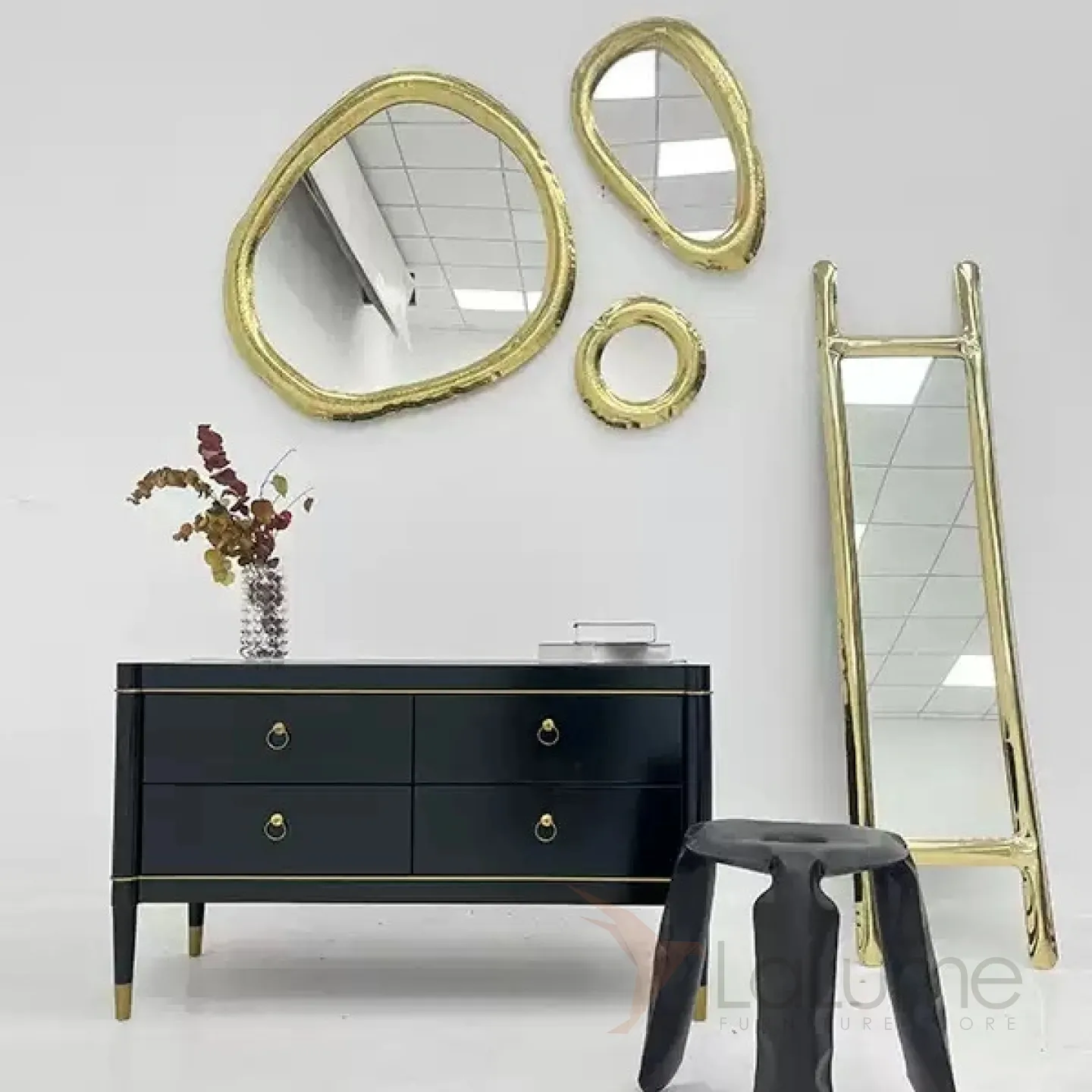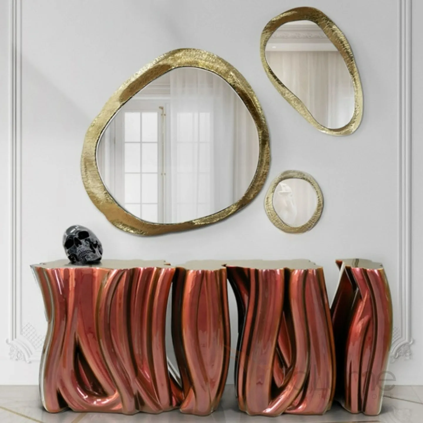 Зеркало в обрамлении из нержавеющей стали, покрытой золотом. Предлагается несколько вариантов размеров.