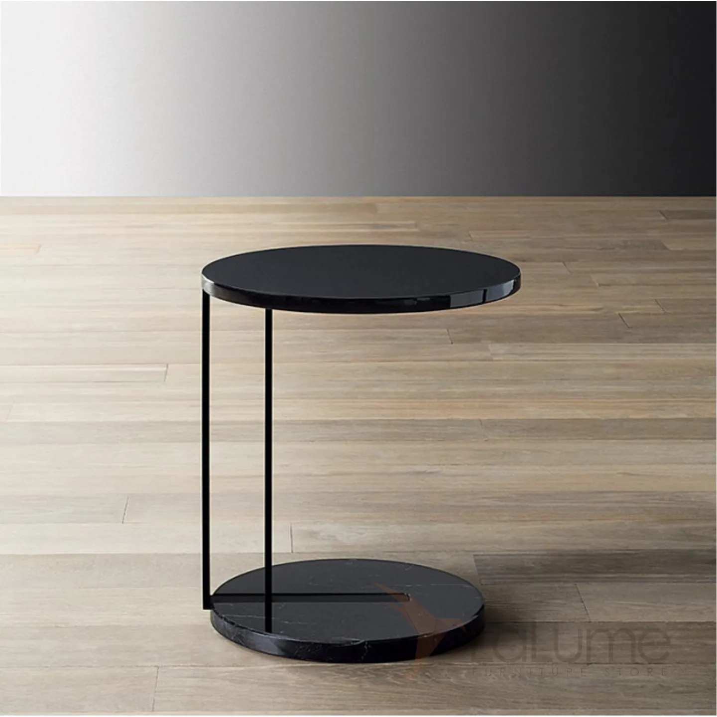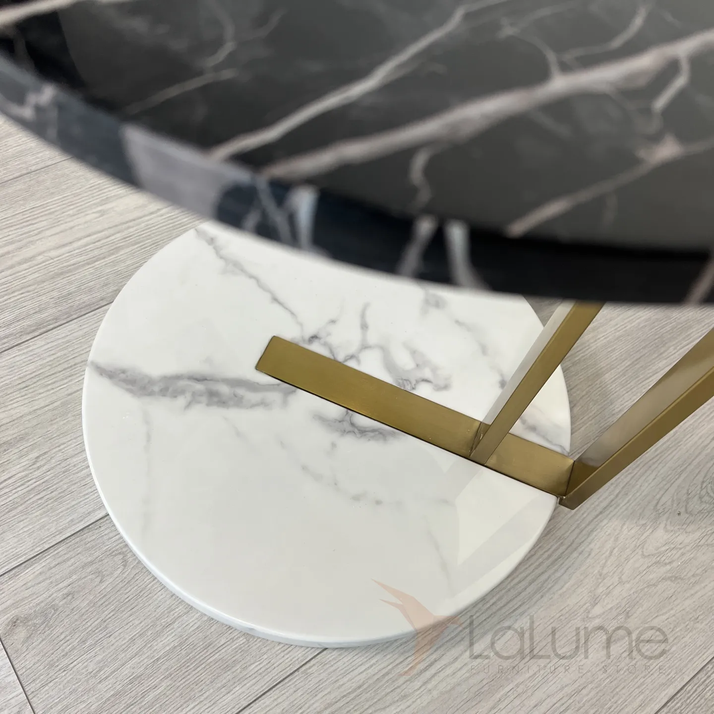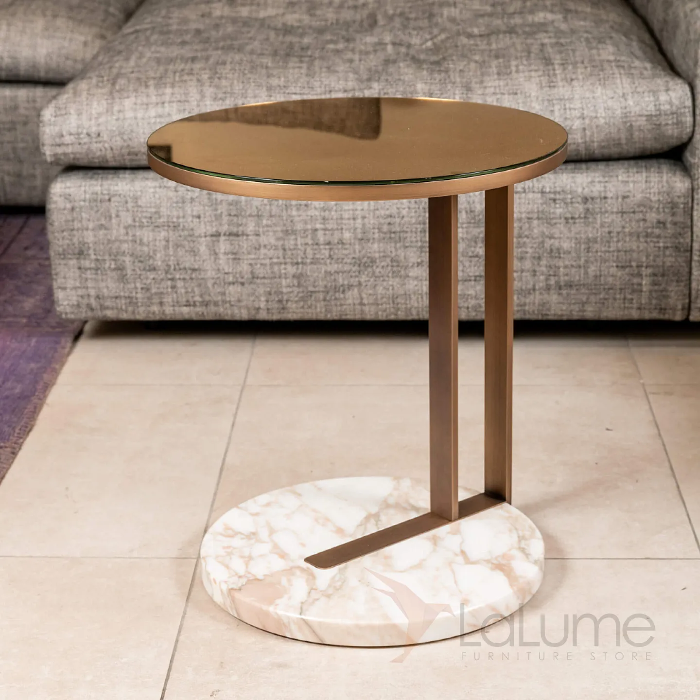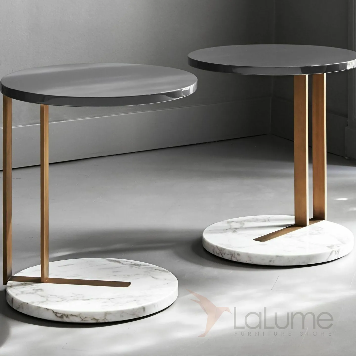 Приставной столик с основанием из мрамора и бронзы, с глянцевой лакированной столешницей. Доступны различные виды отделок основания и столешницы.