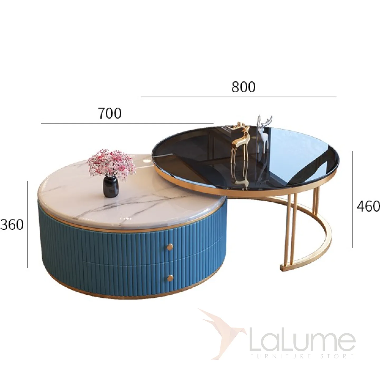 Дизайнерский журнальный столик Масдо пмв8-1 LaLume с двойной круглой столешницей из мрамора и темного прозрачного стекла. Изящная ножка из металла золотого цвета. Два выдвижных ящичка и оформление фасада искусственной кожей синего цвета придают изделию практичность и оригинальность.