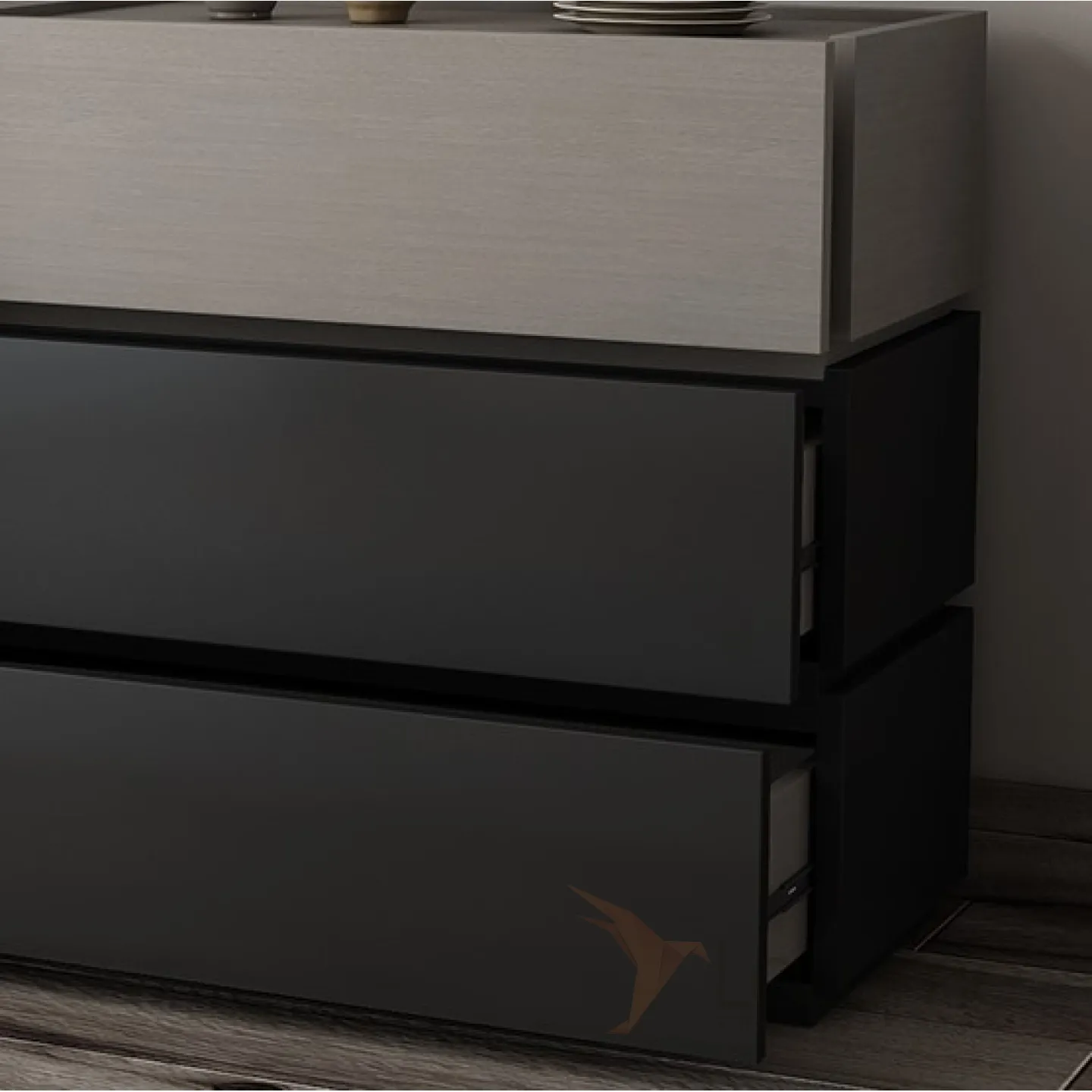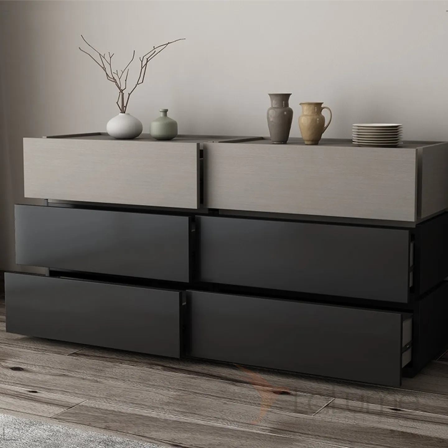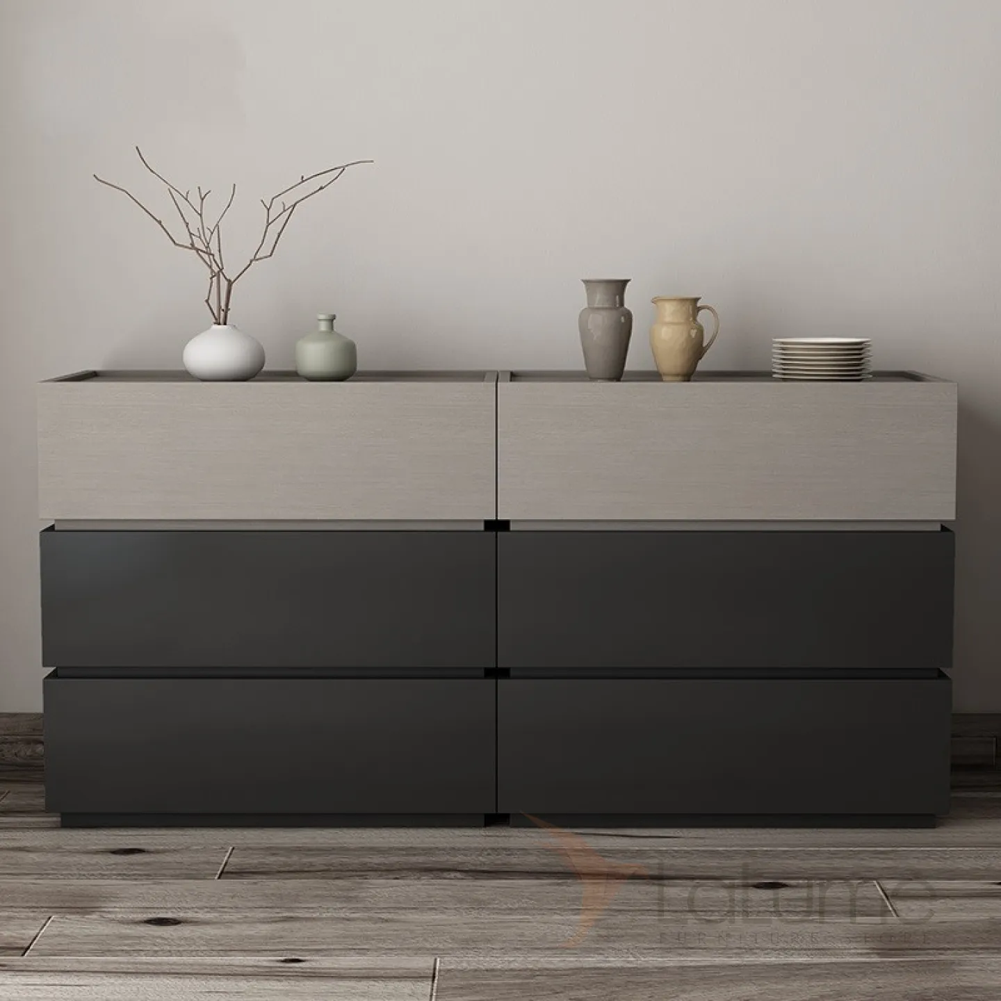 Комод выполнен в спокойных серых тонах, прекрасно впишется в интерьер гостинной, спальной и детской комнаты.