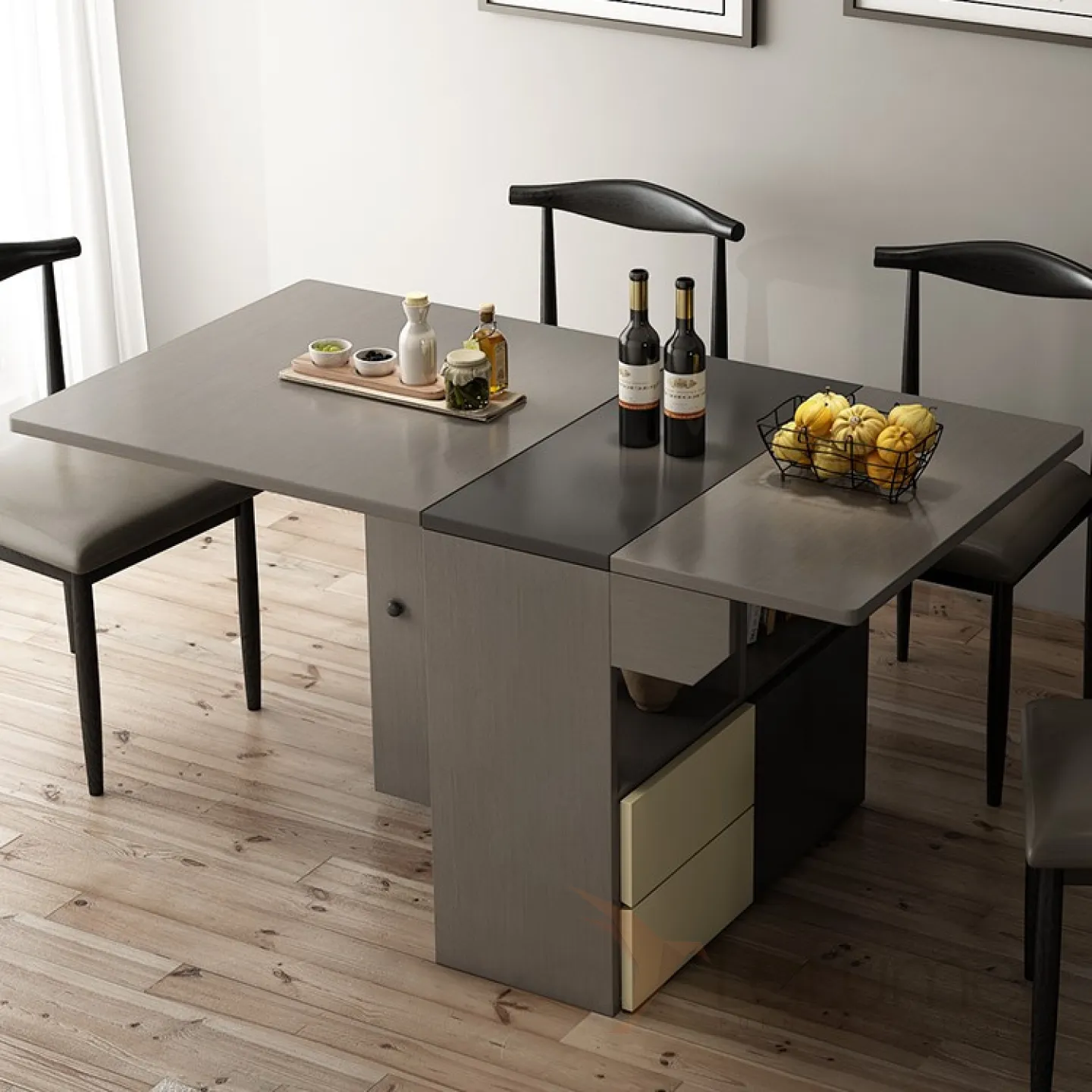 В мгновение из компактной тумбы он превращается в обеденный стол.