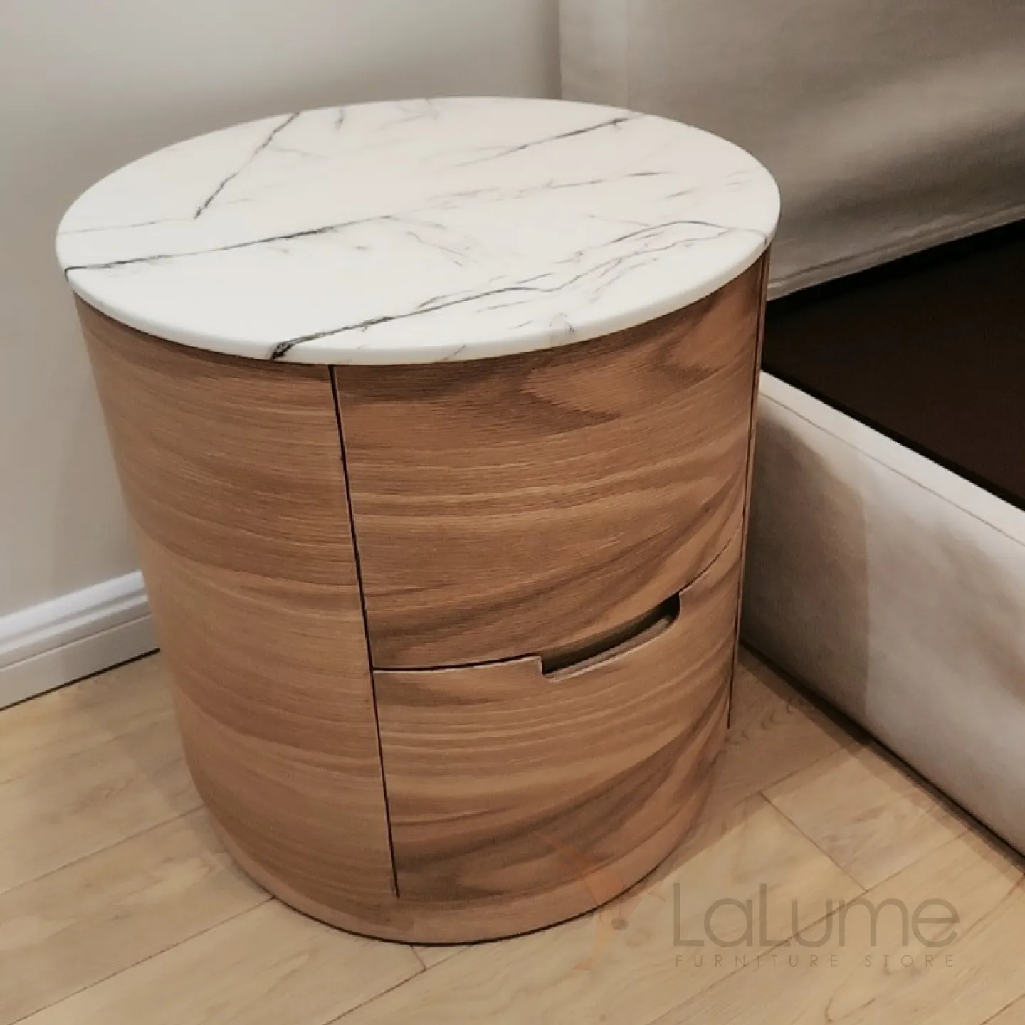 Тумба оснащена двумя вместительными шкафчиками, в которых удобно хранить различные мелочи, такие как книги, журналы, косметику и другие предметы. Верхняя поверхность тумбы выполнена из мраморной плиты и также может использоваться для размещения декоративных элементов или ночника.