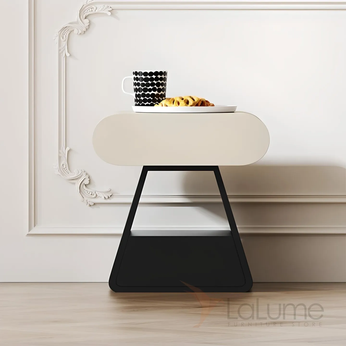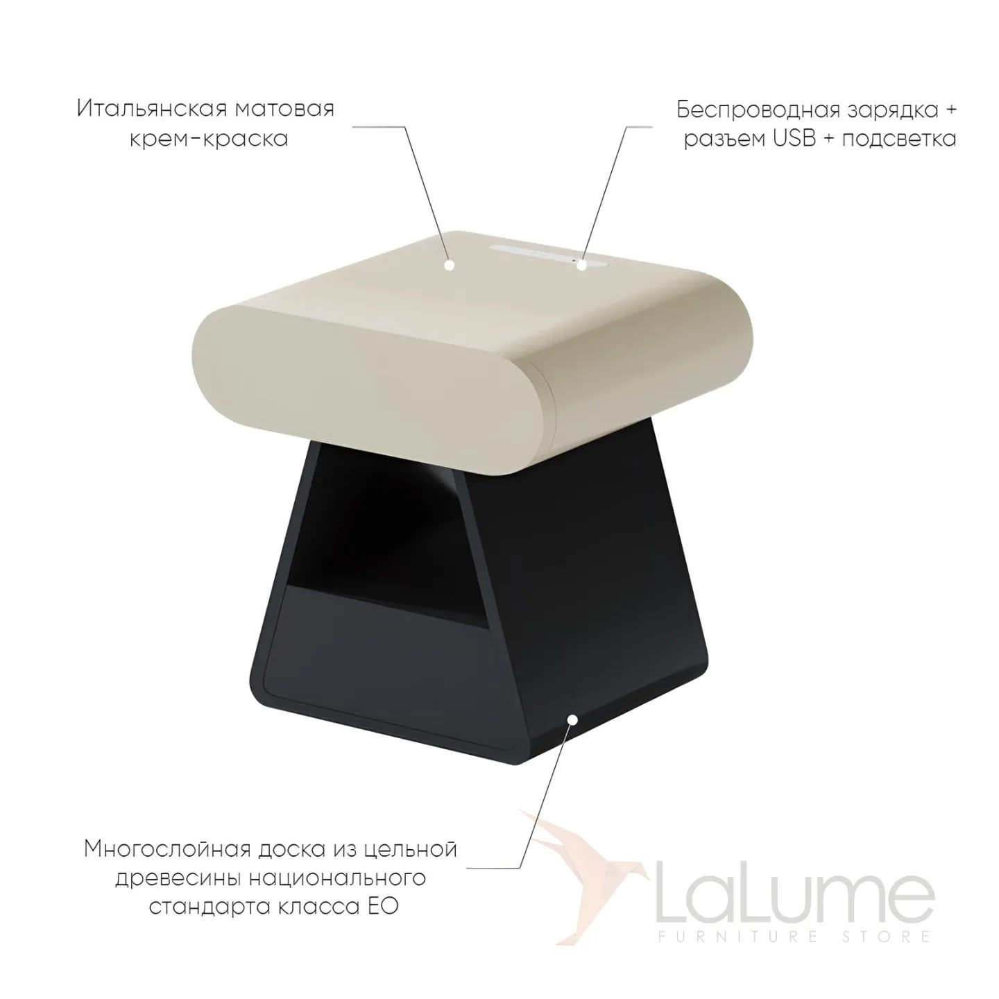 Тумба имеет нестандарьную форму и выполнена из массива дерева, что придает ей прочность и долговечность. Черный цвет ножки в сочетании с бежевым цветом тумбы позволяет ей гармонично сочетаться с любыми другими элементами мебели в комнате.