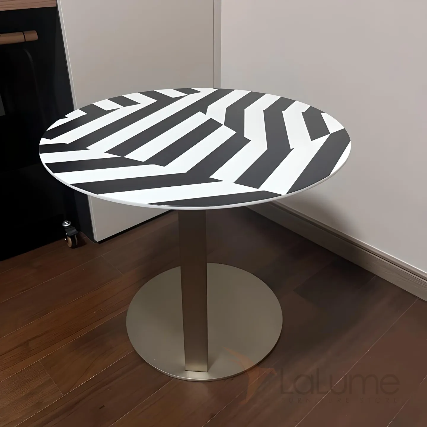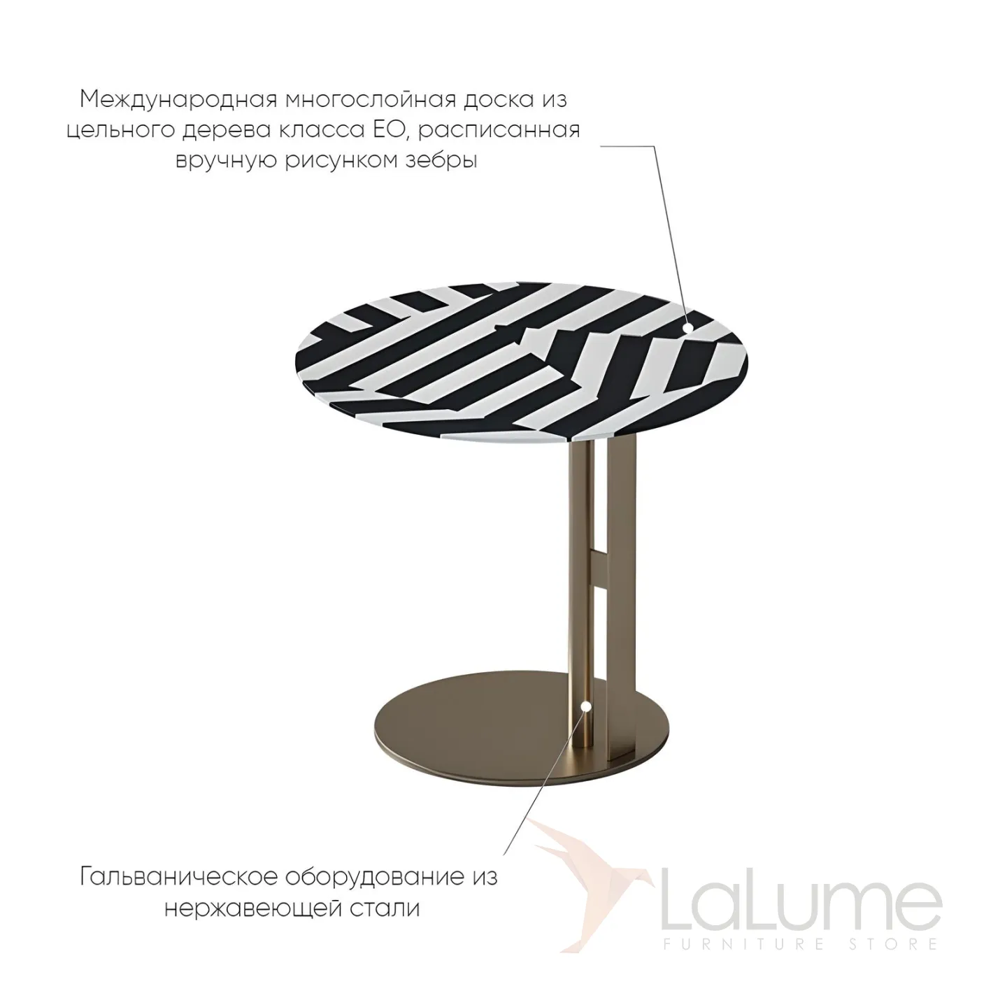 Столик имеет круглую форму и выполнен из нержавеющей стали, что придает ему прочность и долговечность.