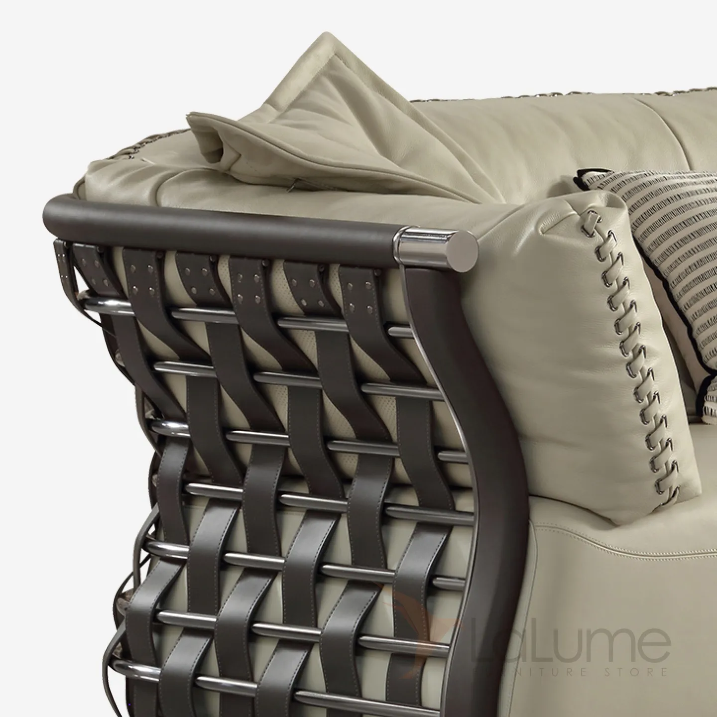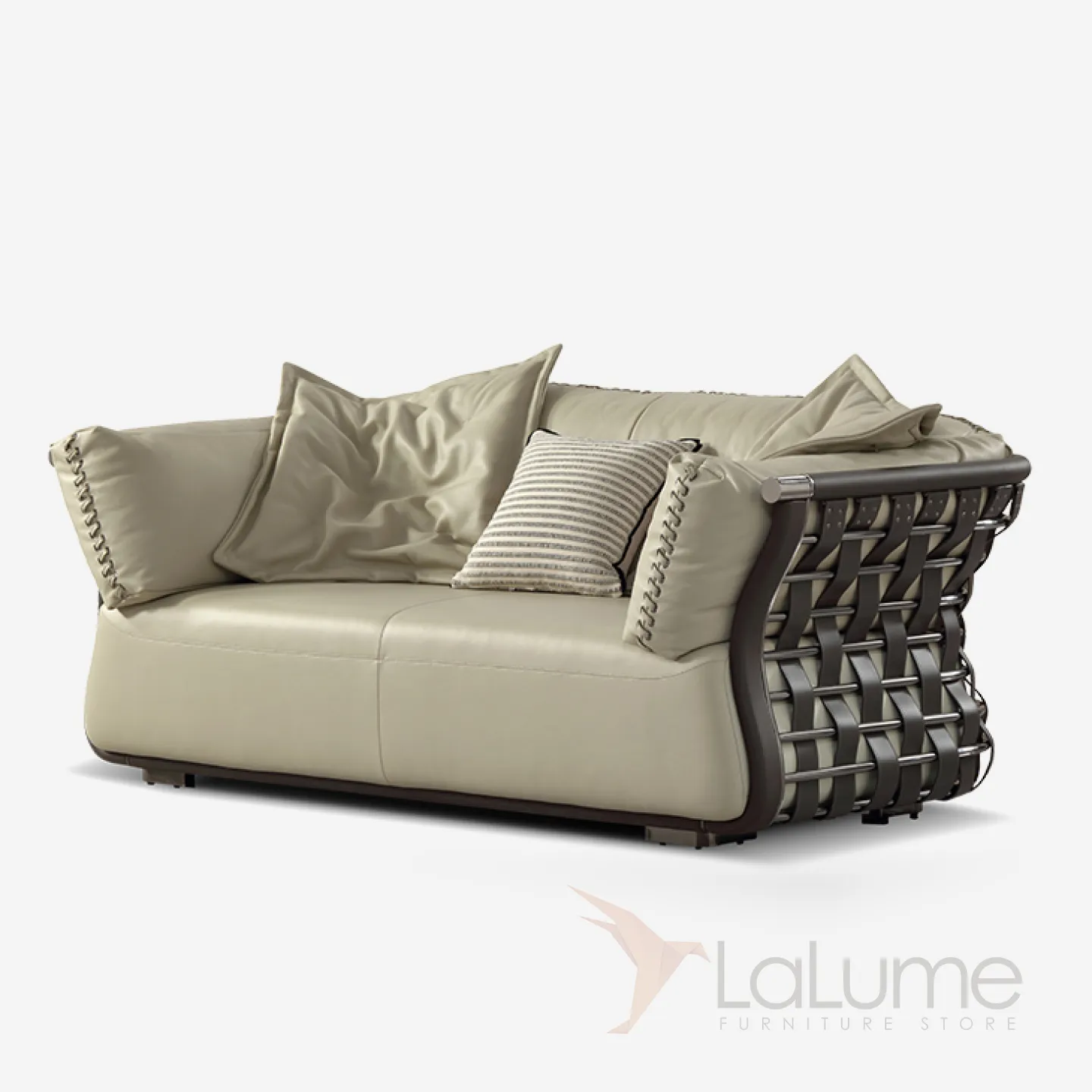 Диван из дерева и нержавеющей стали обивают премиальной воловьей кожей. В комплекте идут подушки. Есть модели для двоих и четверых.