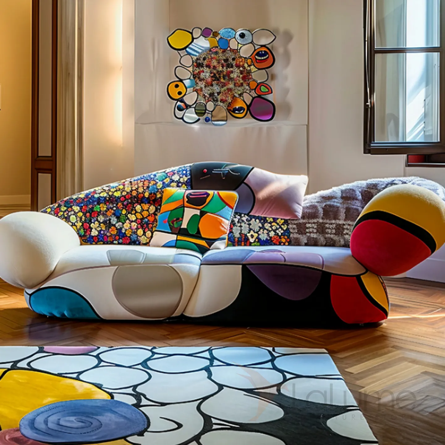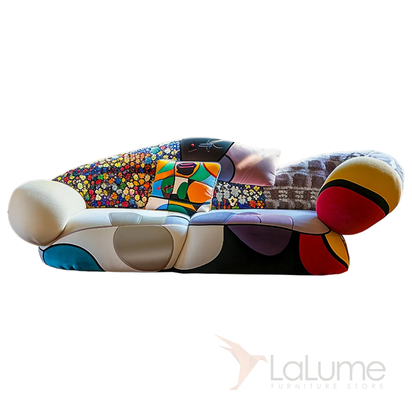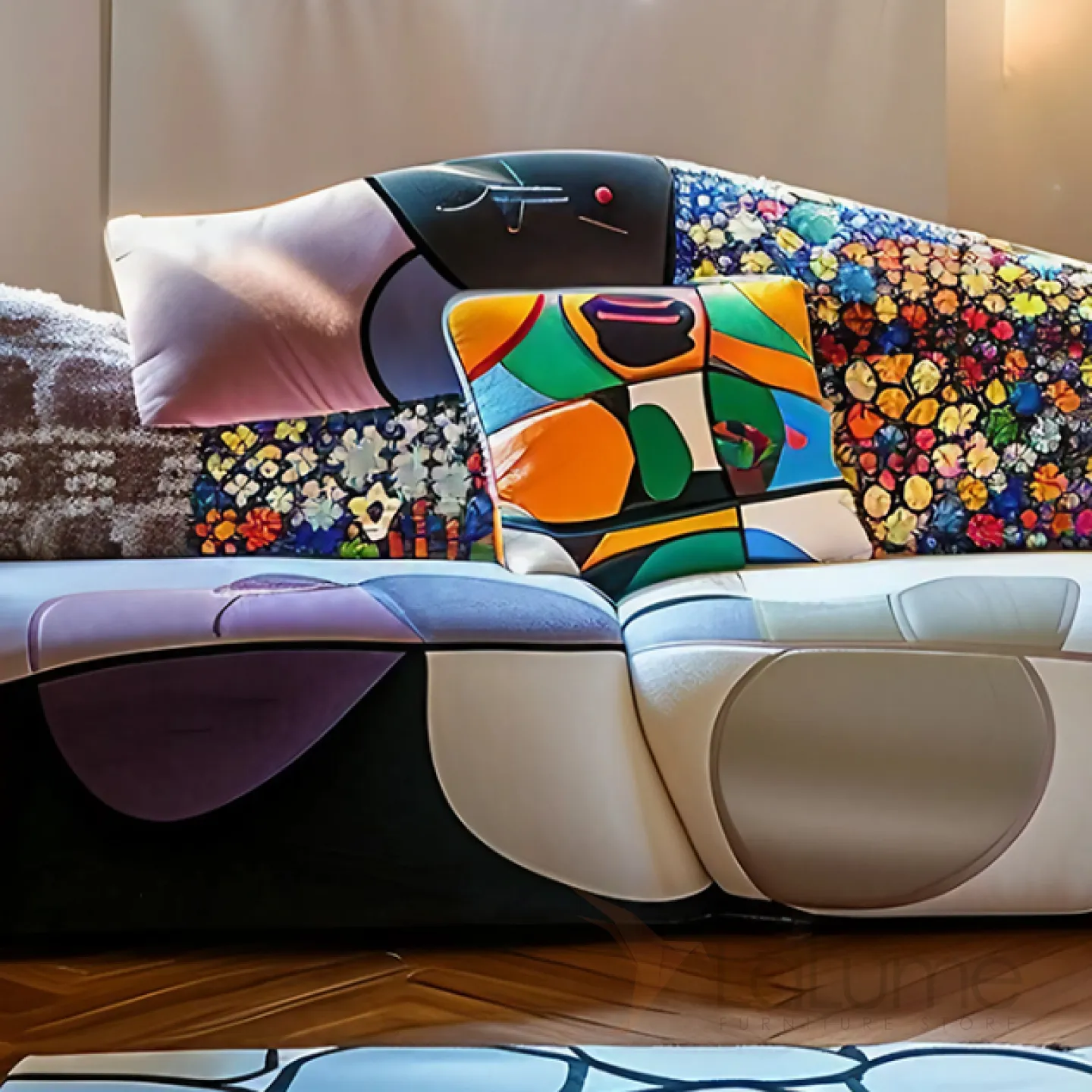 Уникальный диван с неповторимым дизайном изготовлен из премиальной мебельной ткани. В качестве наполнителя используется мягкий поролон. Диван рассчитан на трёх человек.
