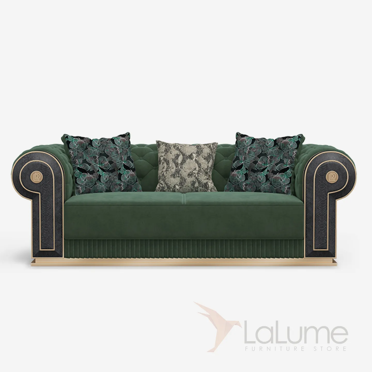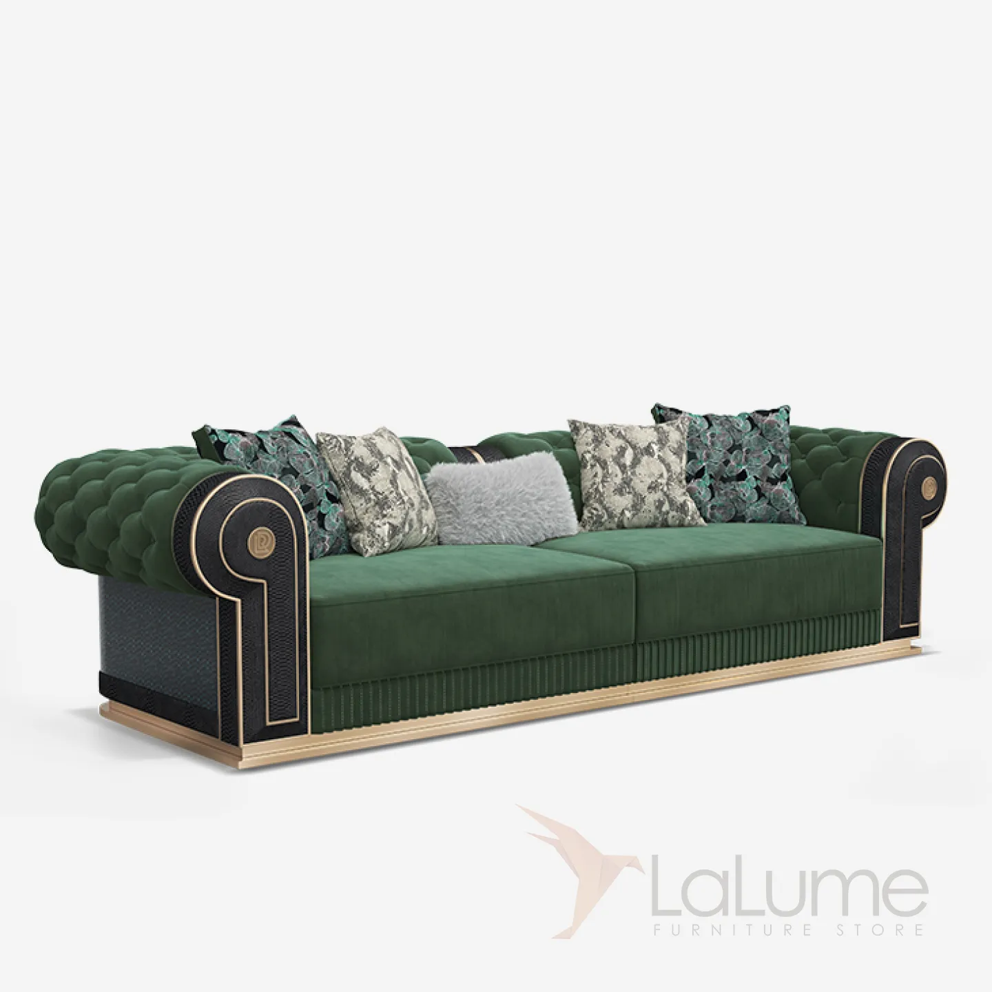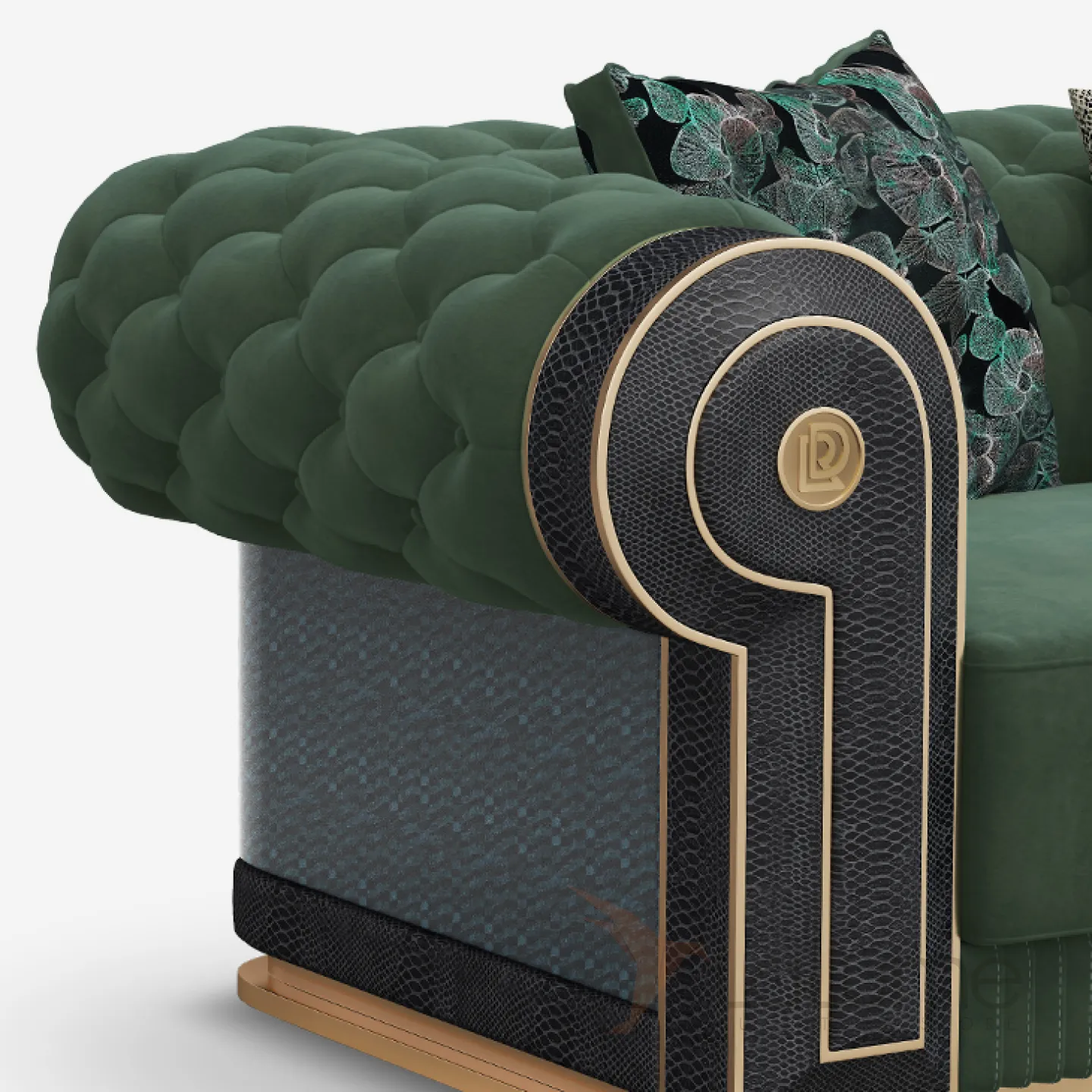 Диван создан из бука и латуни, обивка выполнена из высококачественной матовой кожи глубокого зелёного цвета. Эргономичная спинка и сиденье с мягкими подушками обеспечивают максимальный комфорт. Доступны модели на двух, трёх и четырёх человек.