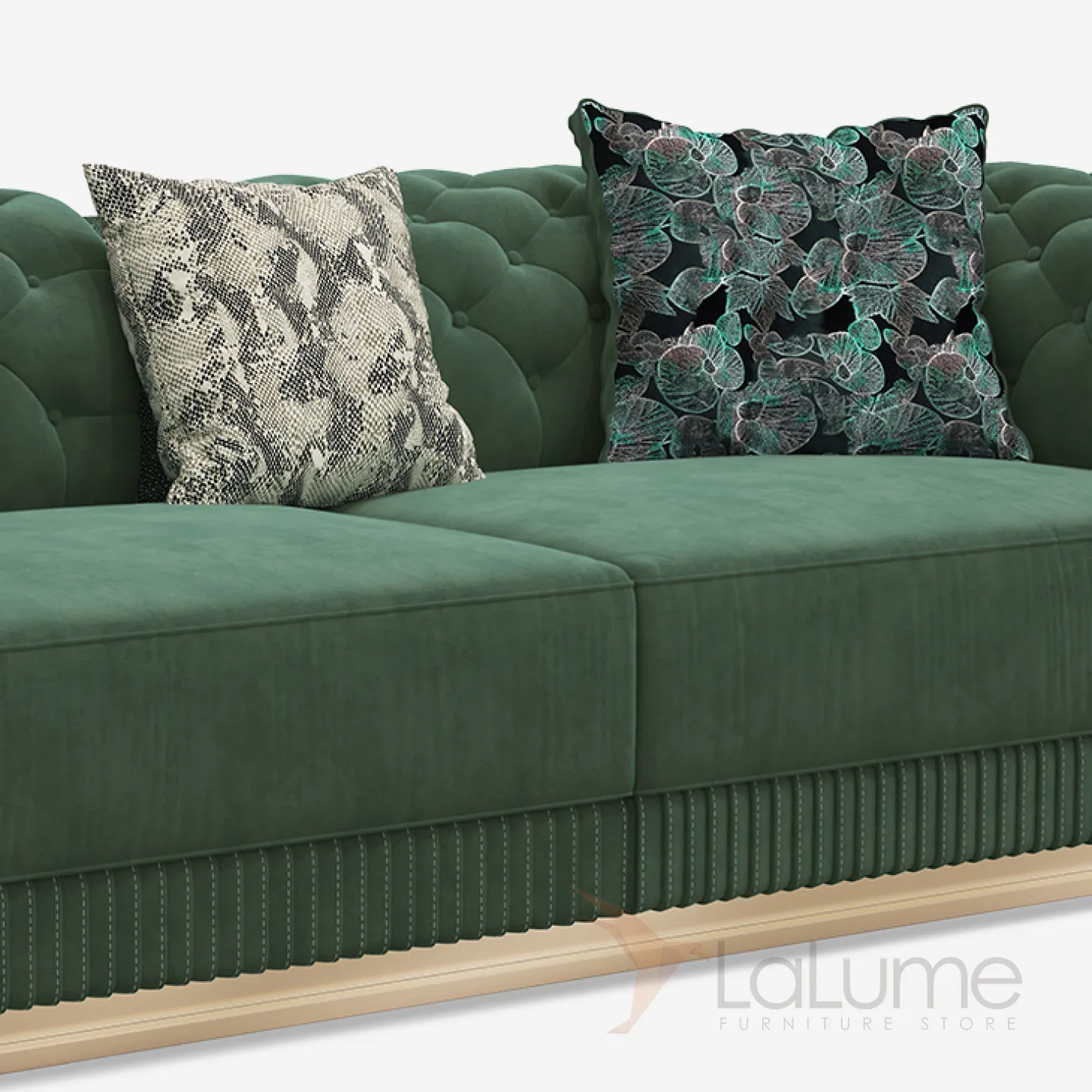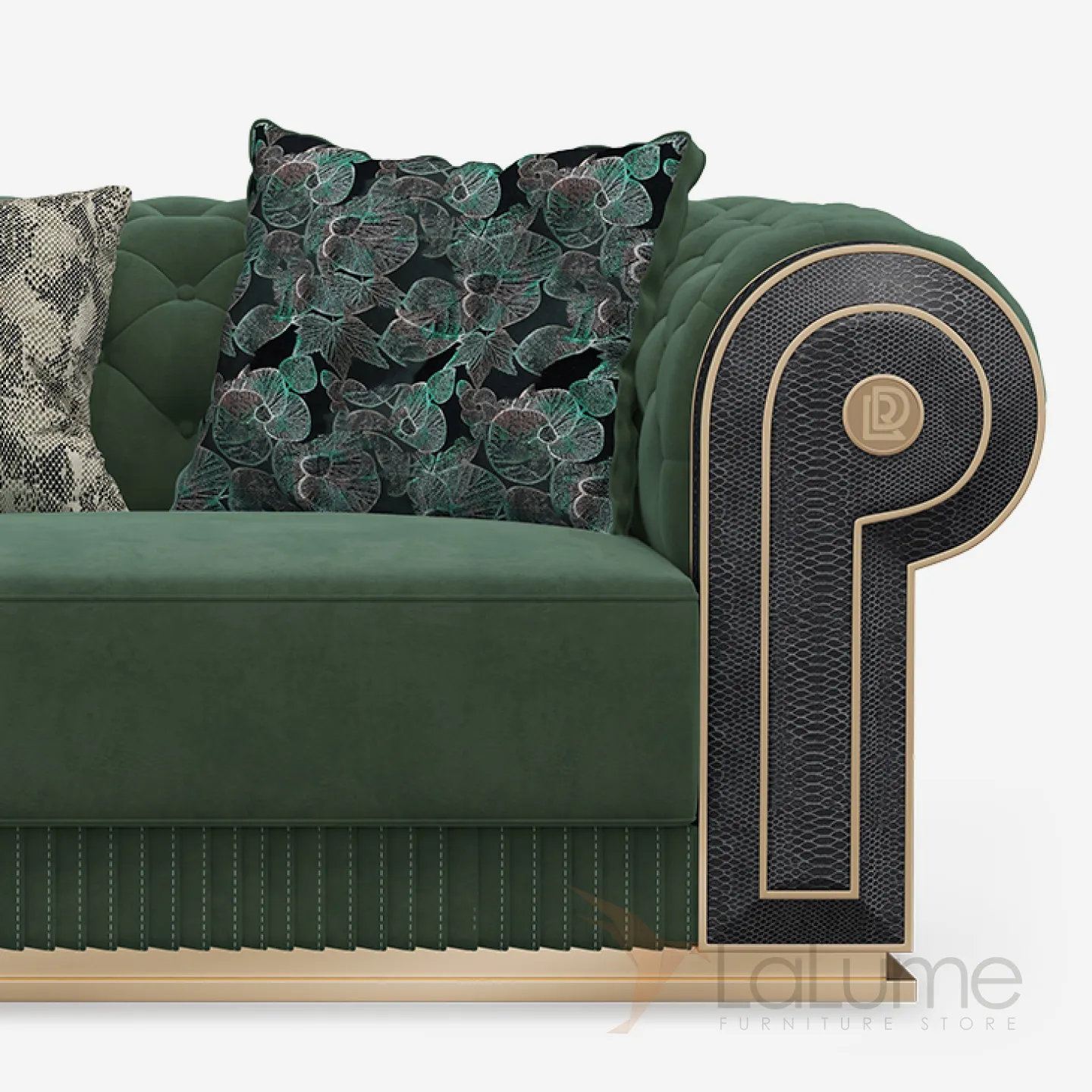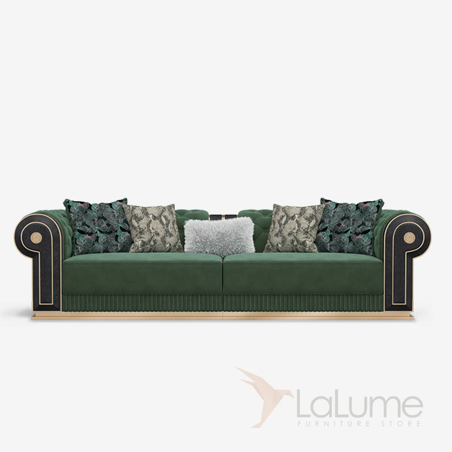 Диван создан из бука и латуни, обивка выполнена из высококачественной матовой кожи глубокого зелёного цвета. Эргономичная спинка и сиденье с мягкими подушками обеспечивают максимальный комфорт. Доступны модели на двух, трёх и четырёх человек.