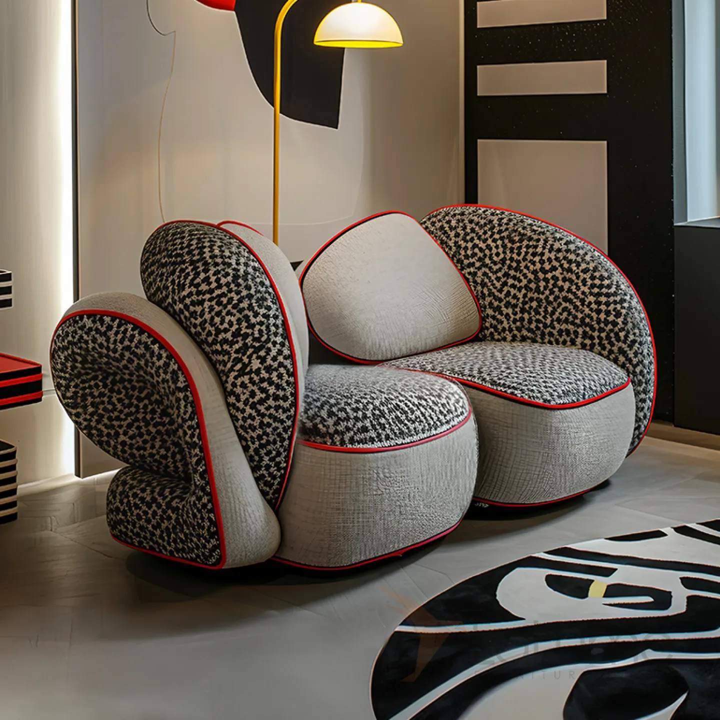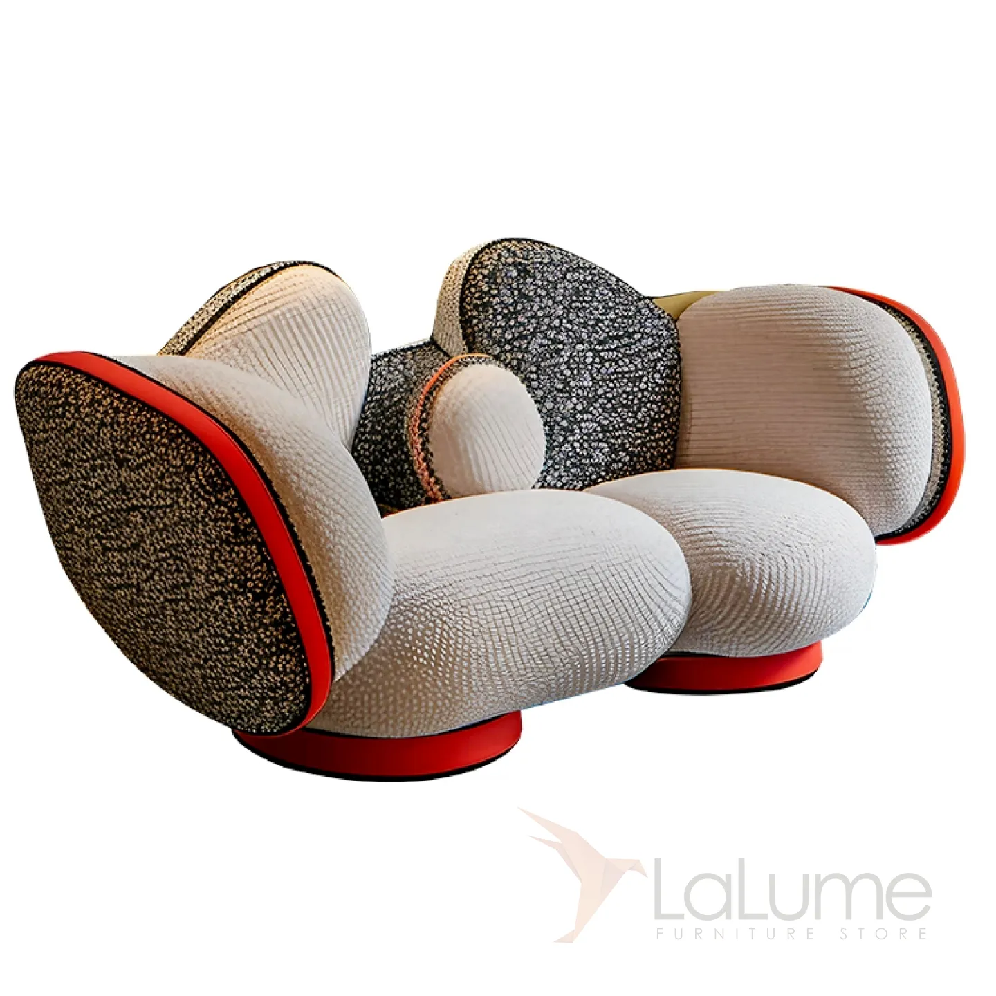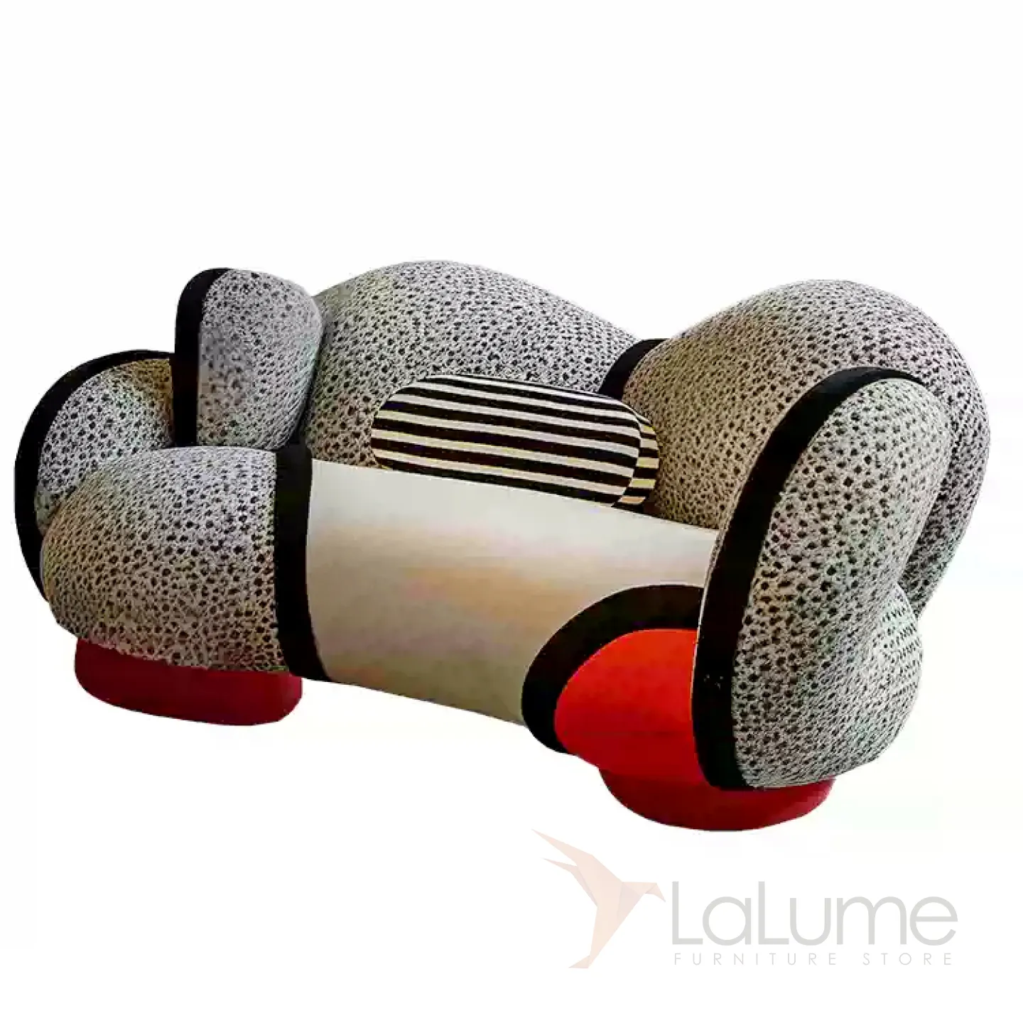 Диван необычной формы, выполненный в уникальном цветовом решении, создан из высококачественной мебельной ткани. Его каркас изготовлен из массива сосны и обит мягким поролоном. Этот диван предназначен для трёх человек.