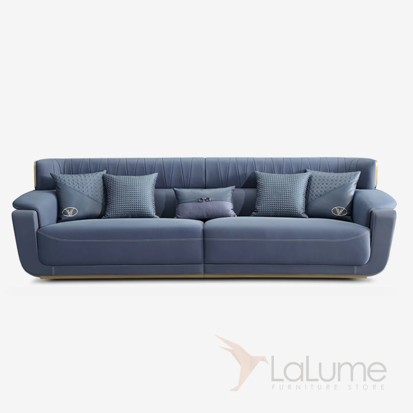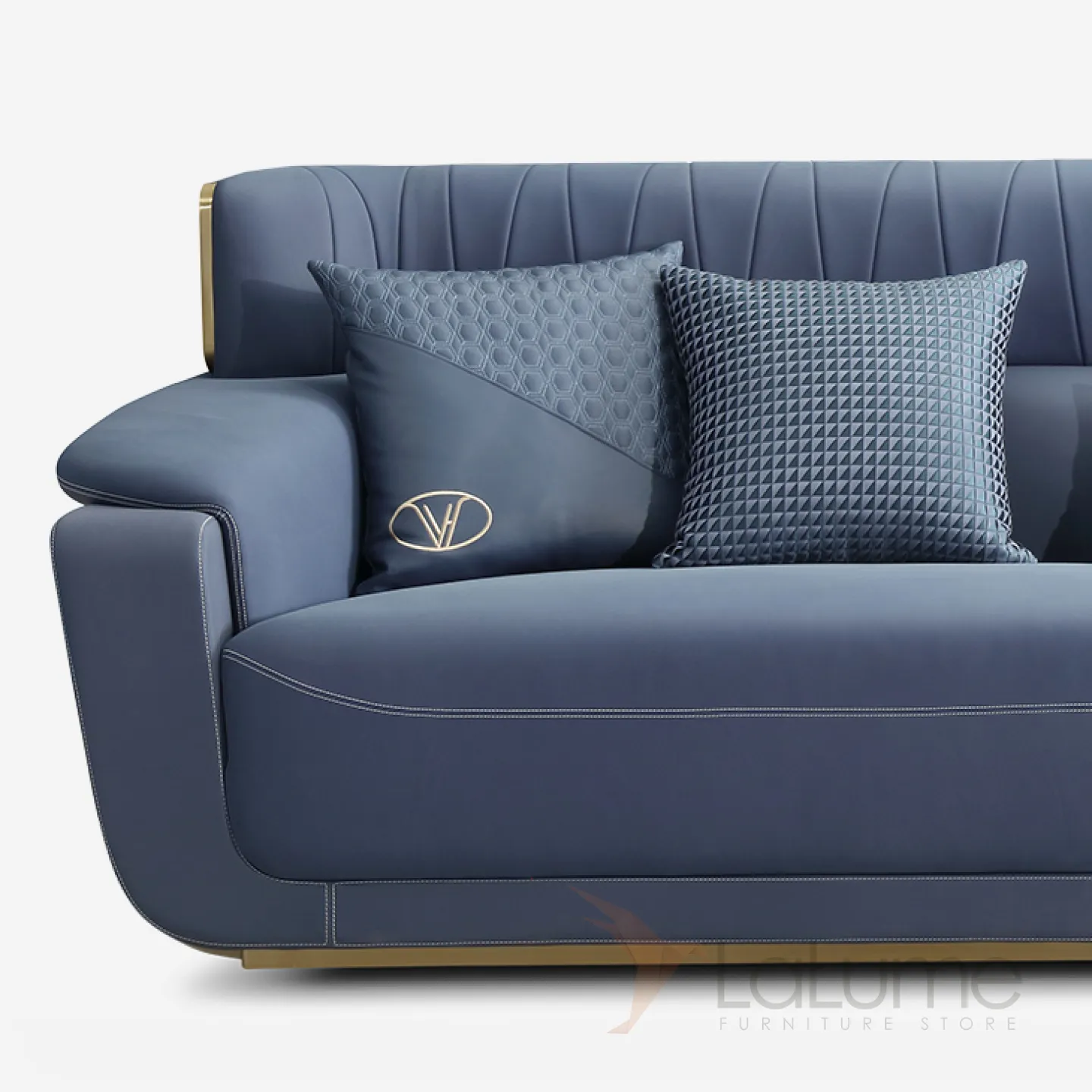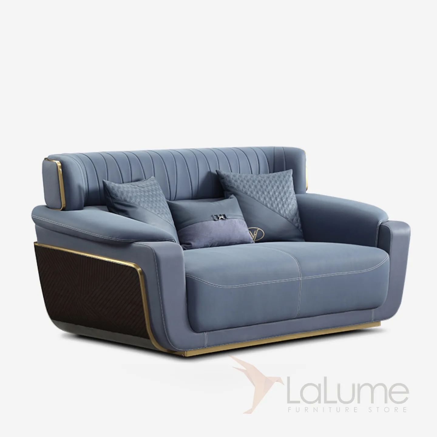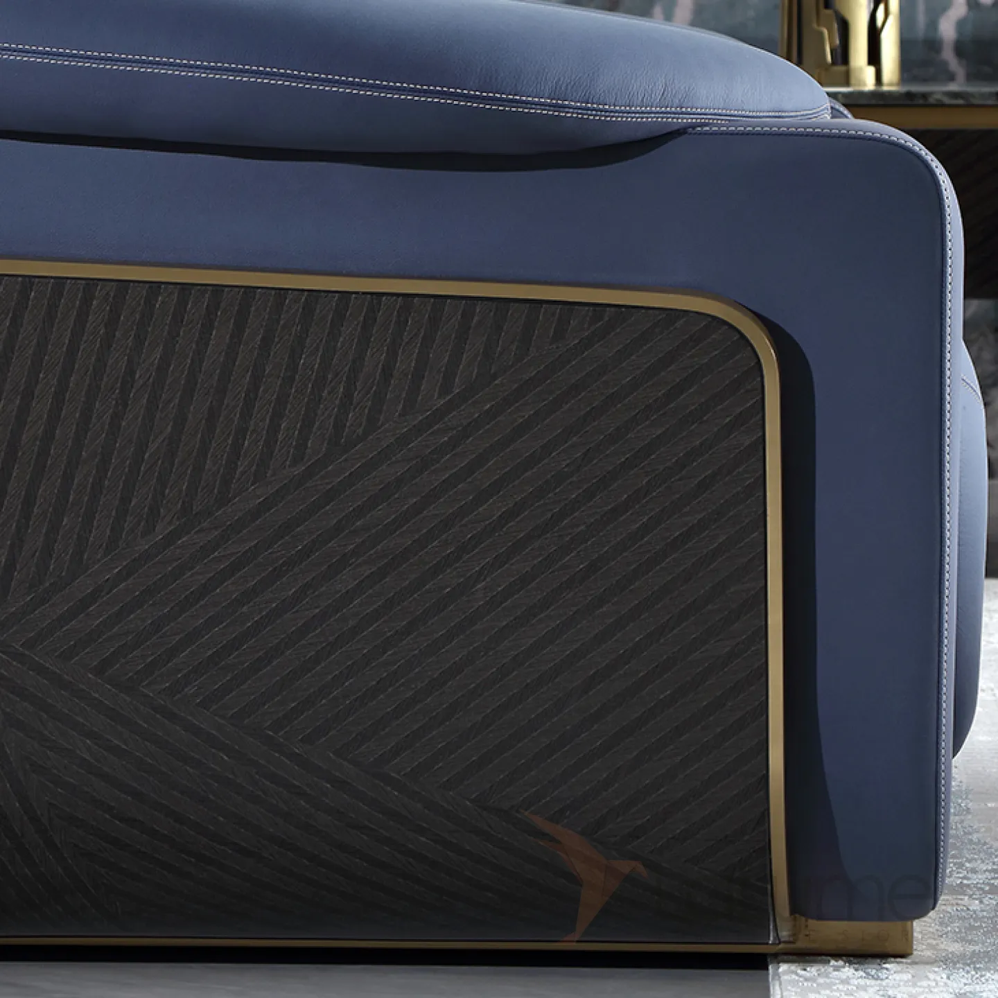 Диван изготовлен из прочной древесины, шпона и латуни. Обивка выполнена из высококачественной матовой кожи насыщенного синего оттенка. Эргономичная спинка и мягкие подушки сиденья создают непревзойденный комфорт. Доступны модели для двух, трёх и четырёх человек.