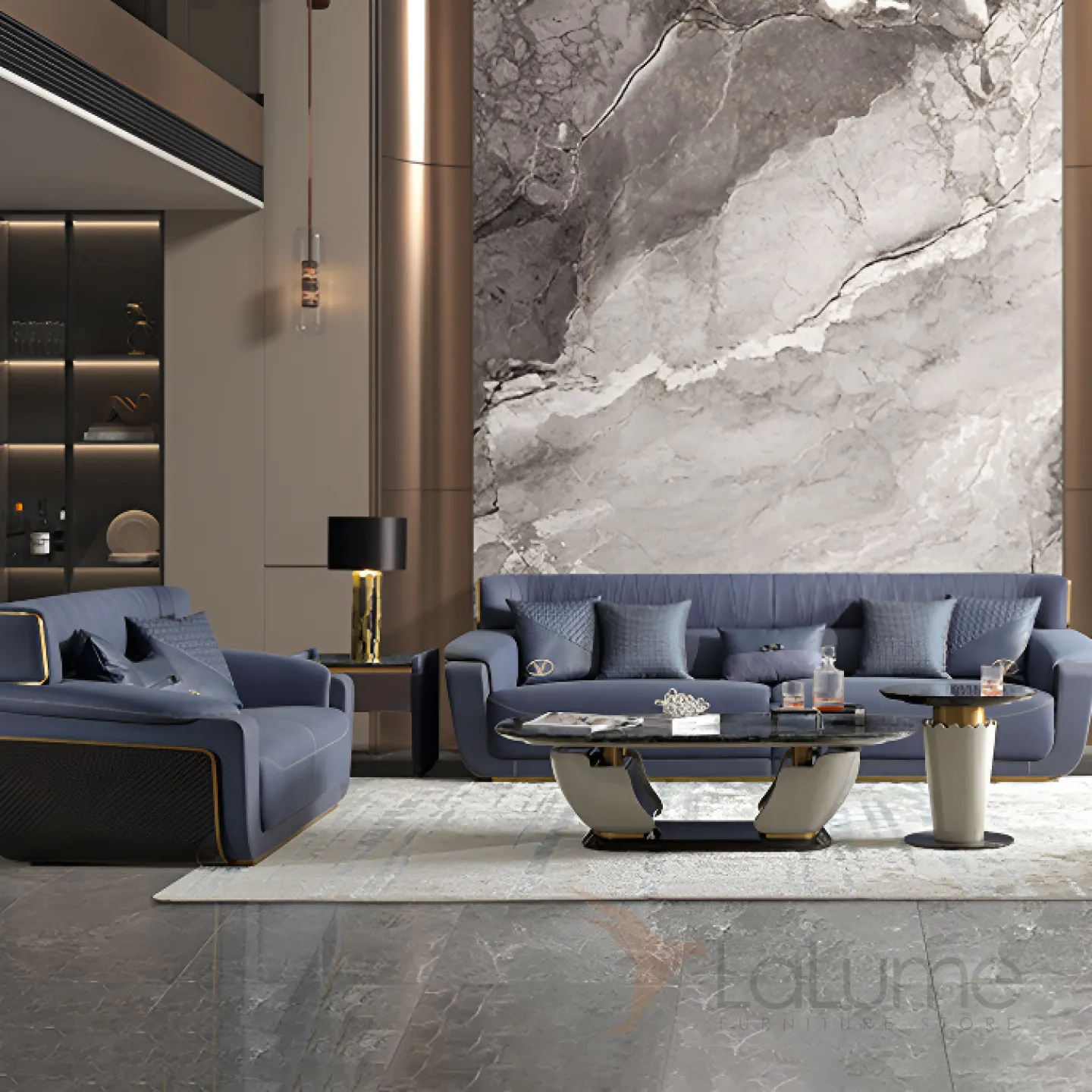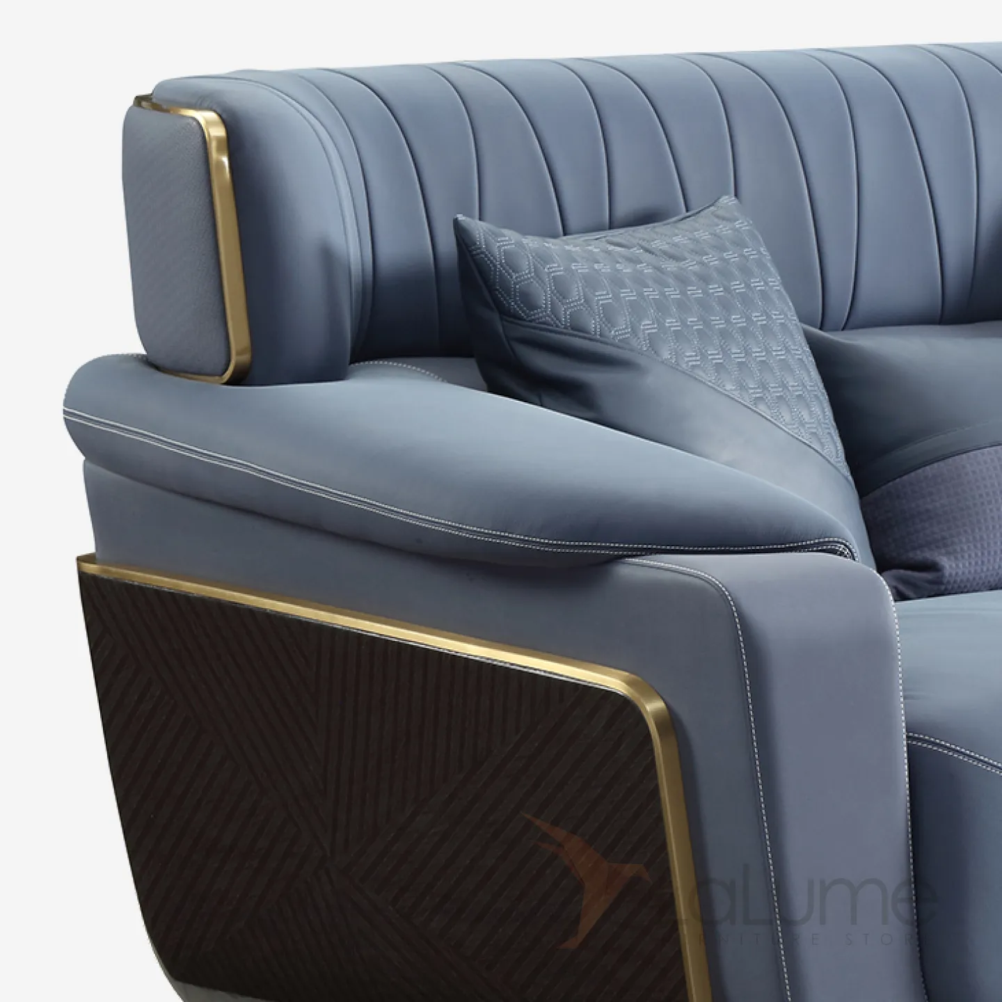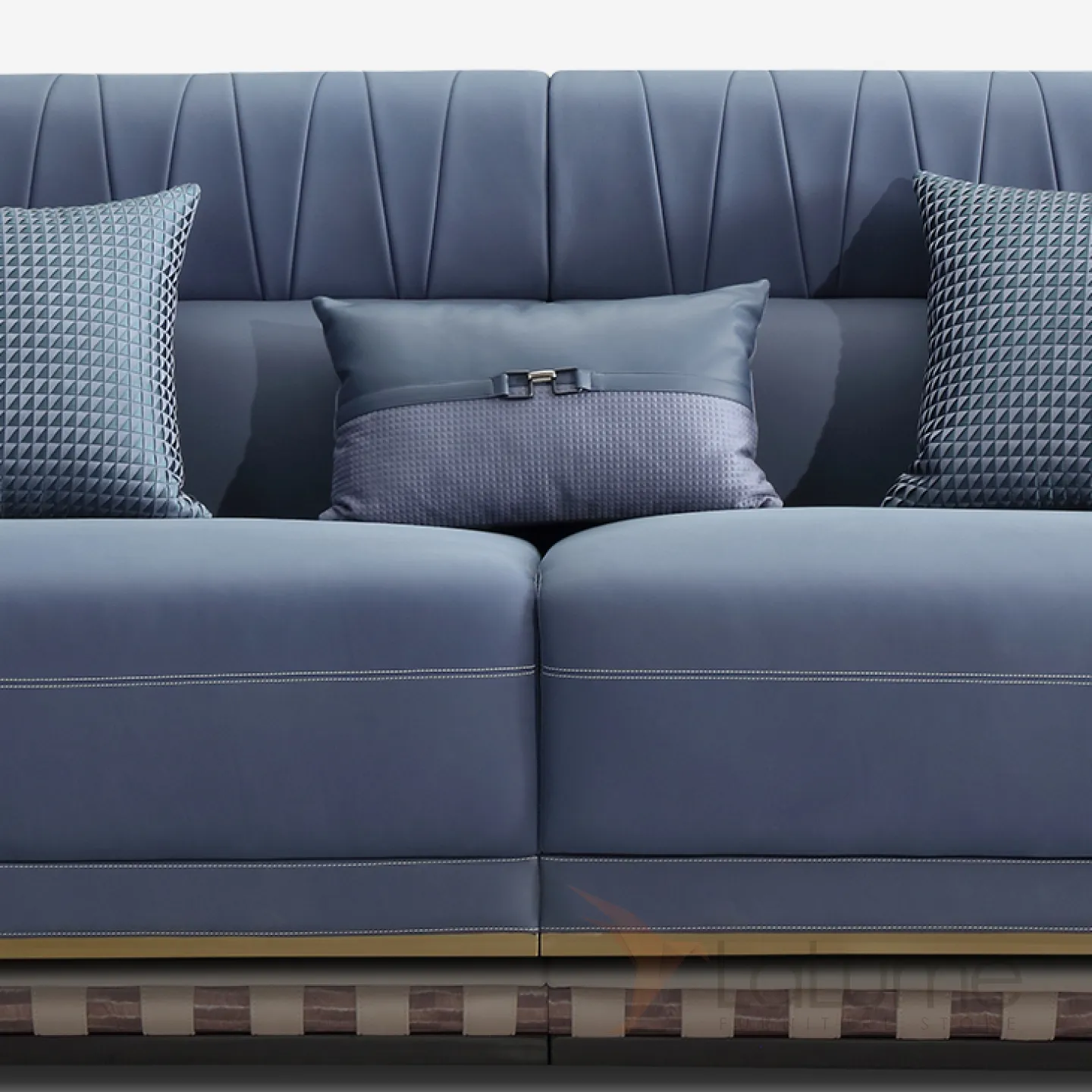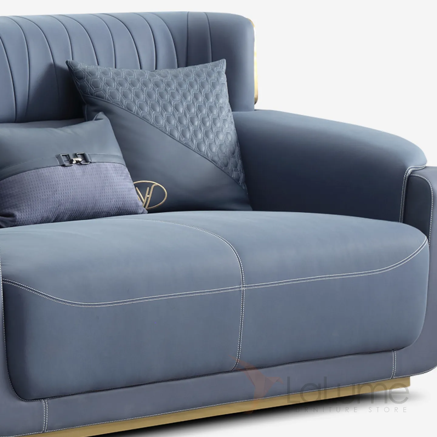 Диван изготовлен из прочной древесины, шпона и латуни. Обивка выполнена из высококачественной матовой кожи насыщенного синего оттенка. Эргономичная спинка и мягкие подушки сиденья создают непревзойденный комфорт. Доступны модели для двух, трёх и четырёх человек.