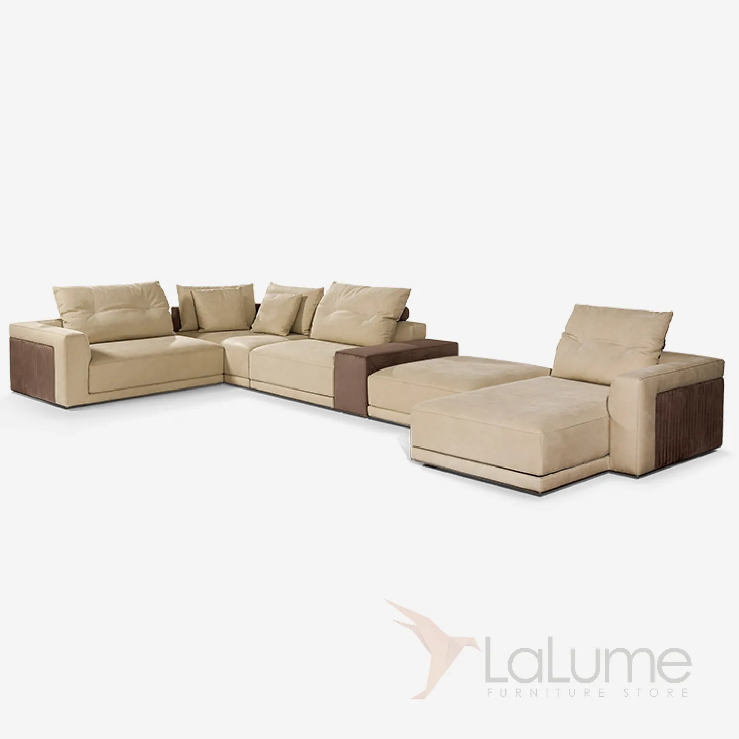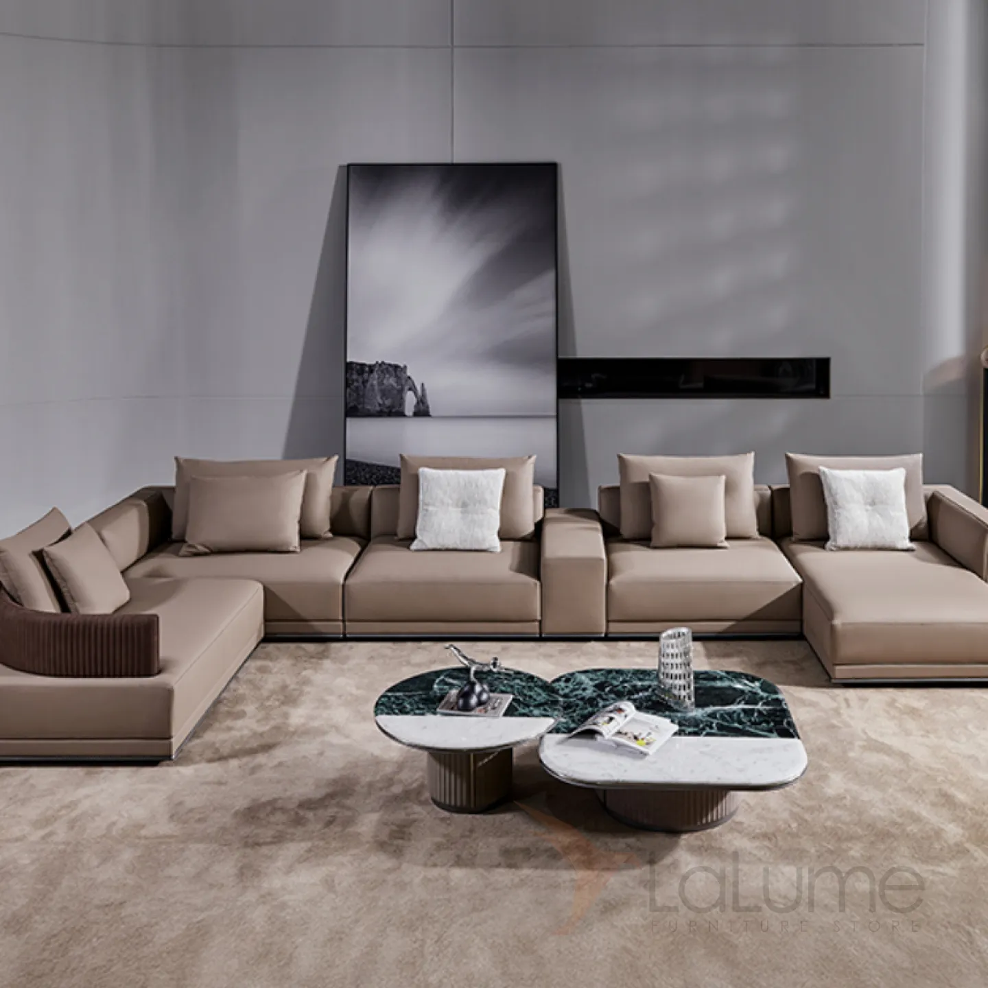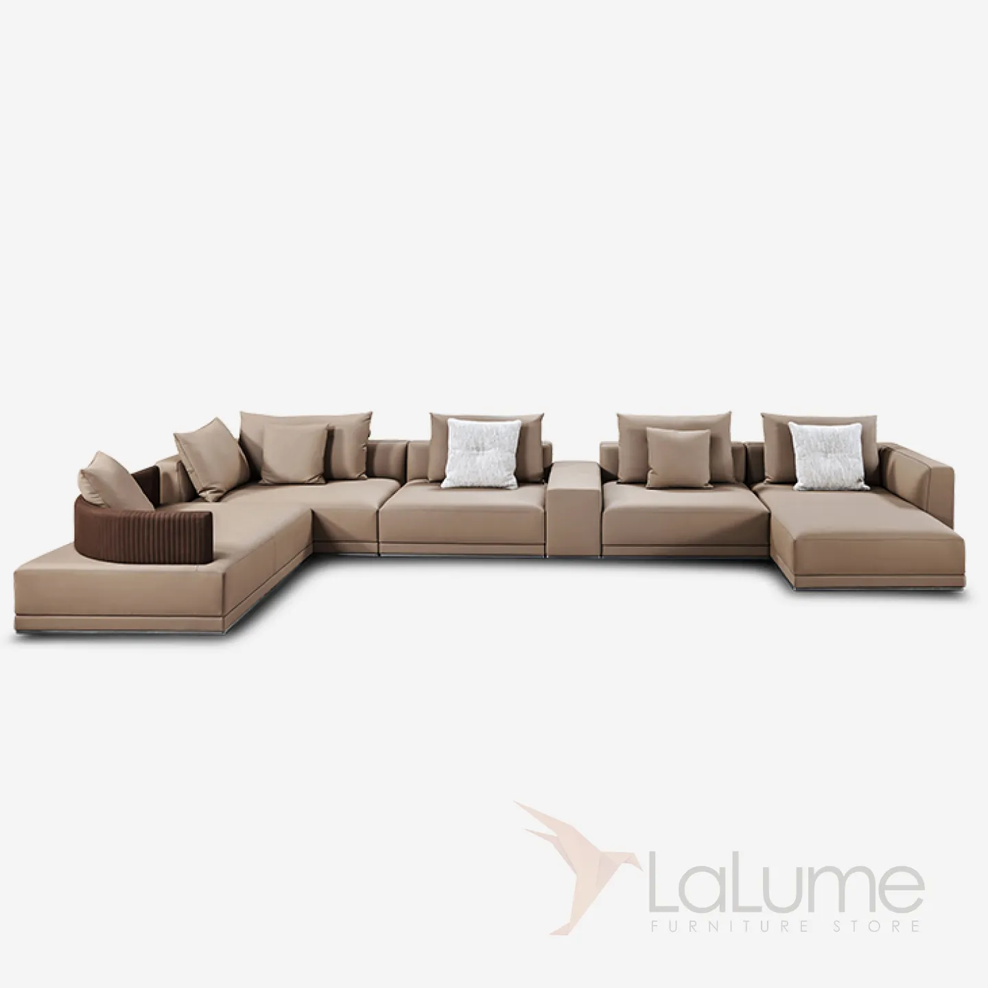 Большой П-образный диван: натуральное дерево сочетается с практичной искусственной кожей. Дополнен удобными подушками.