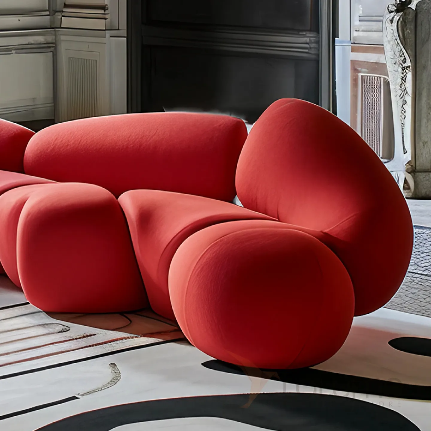 Этот диван сразу привлекает внимание нестандартной формой и стильным цветовым исполнением. Модель изготовлена из прочной мебельной ткани премиум-класса, которая сочетает в себе эстетику и практичность.