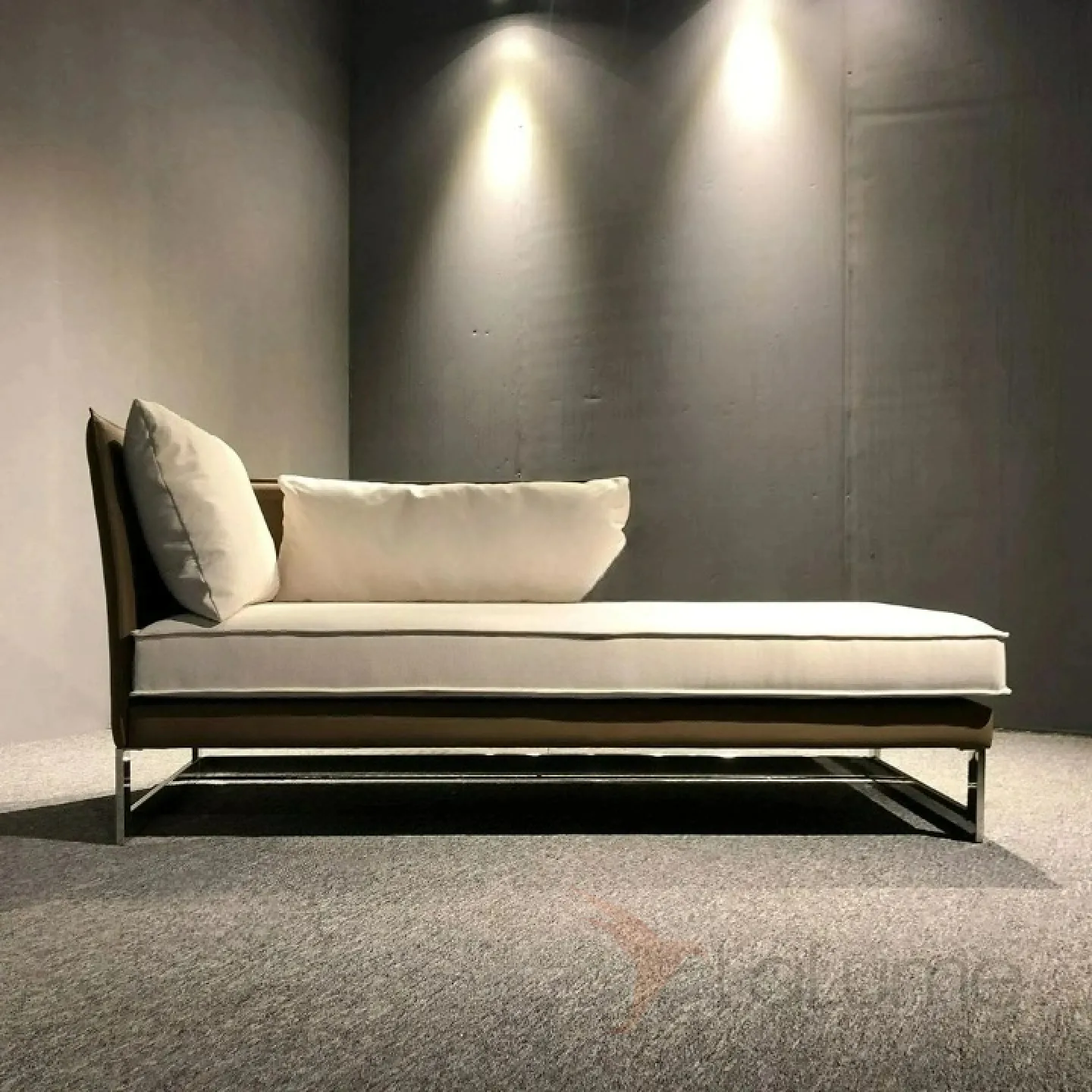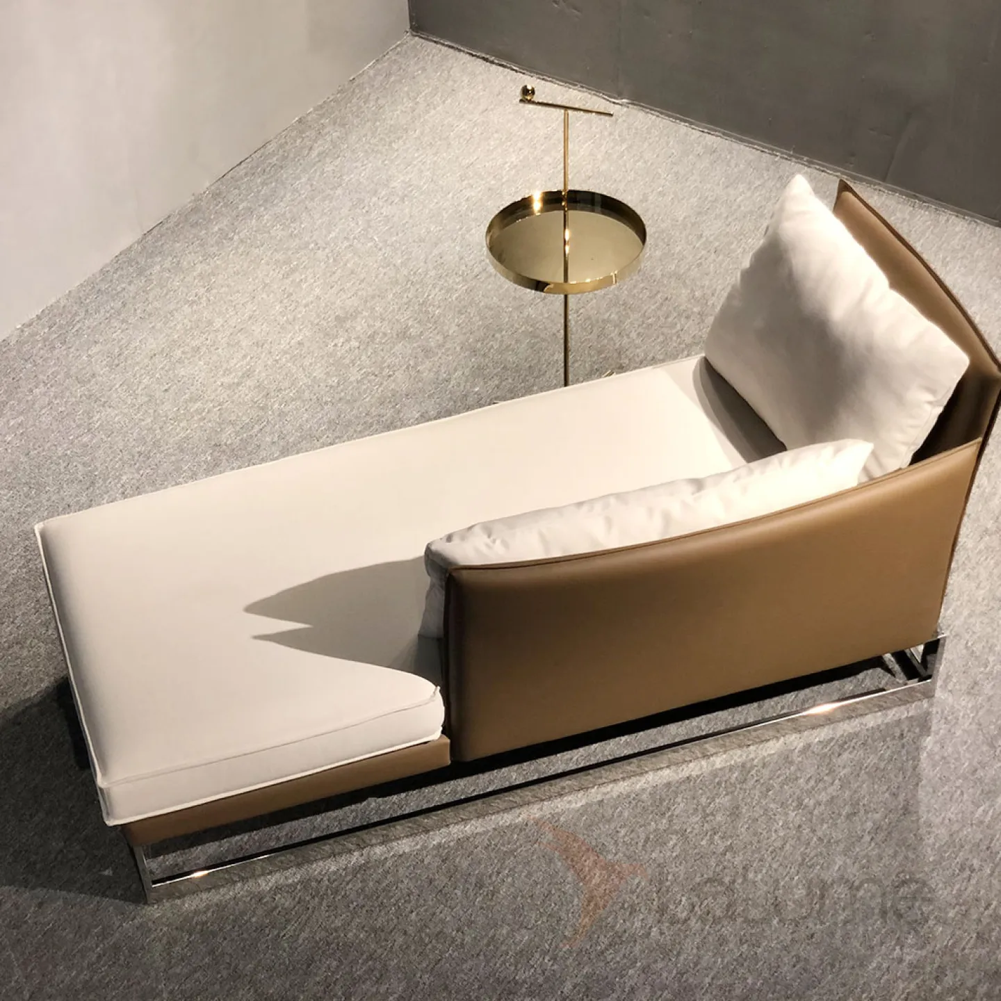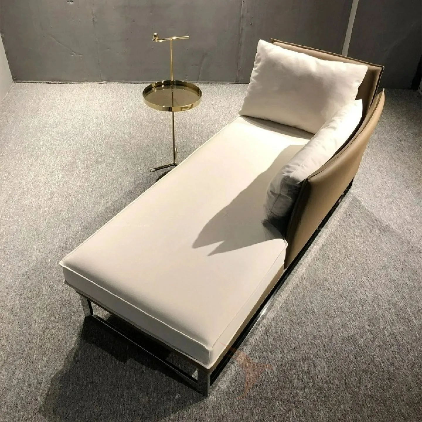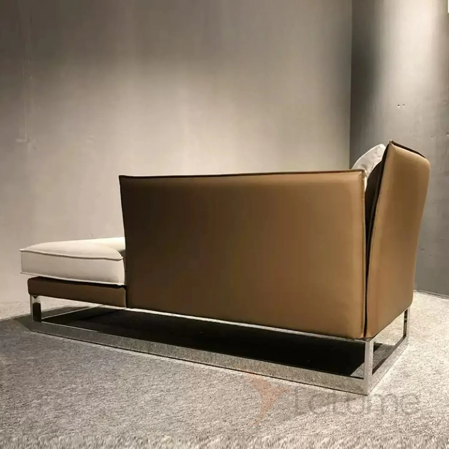 Диван-кушетка с угловой спинкой. Металлическое основание из нержавеющей стали, деревянный каркас, обивка из поролона и мебельного текстиля, а также искусственное покрытие из кожи.