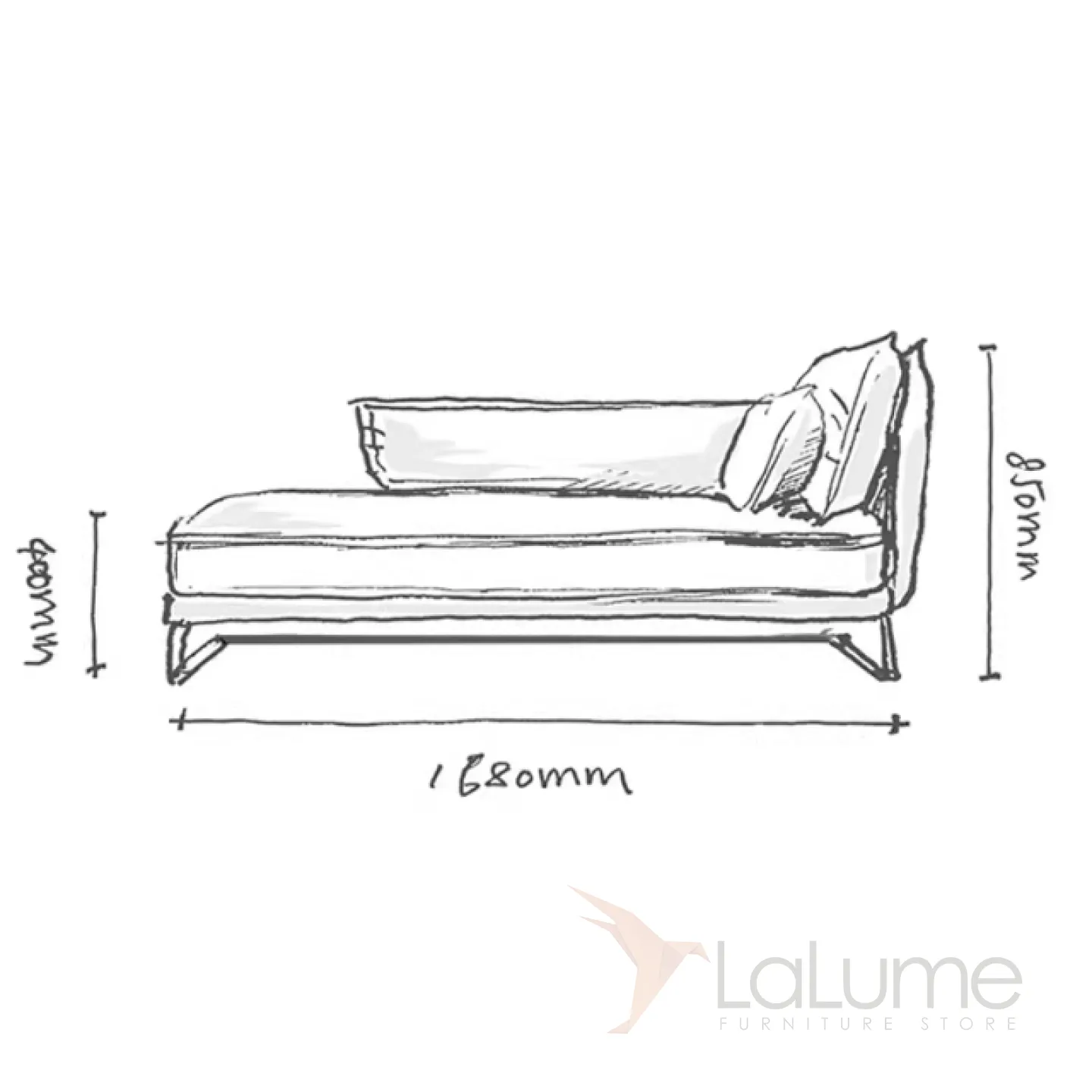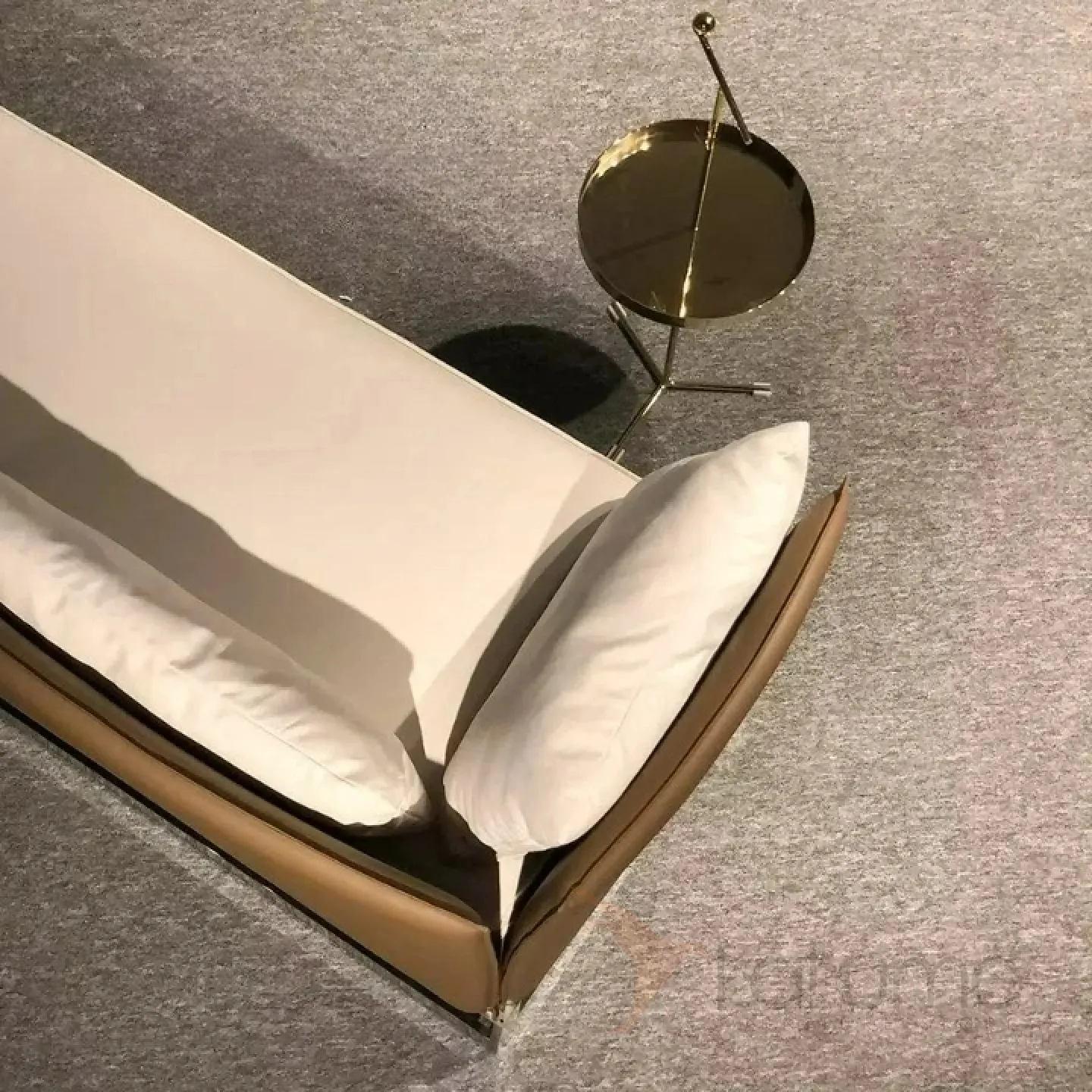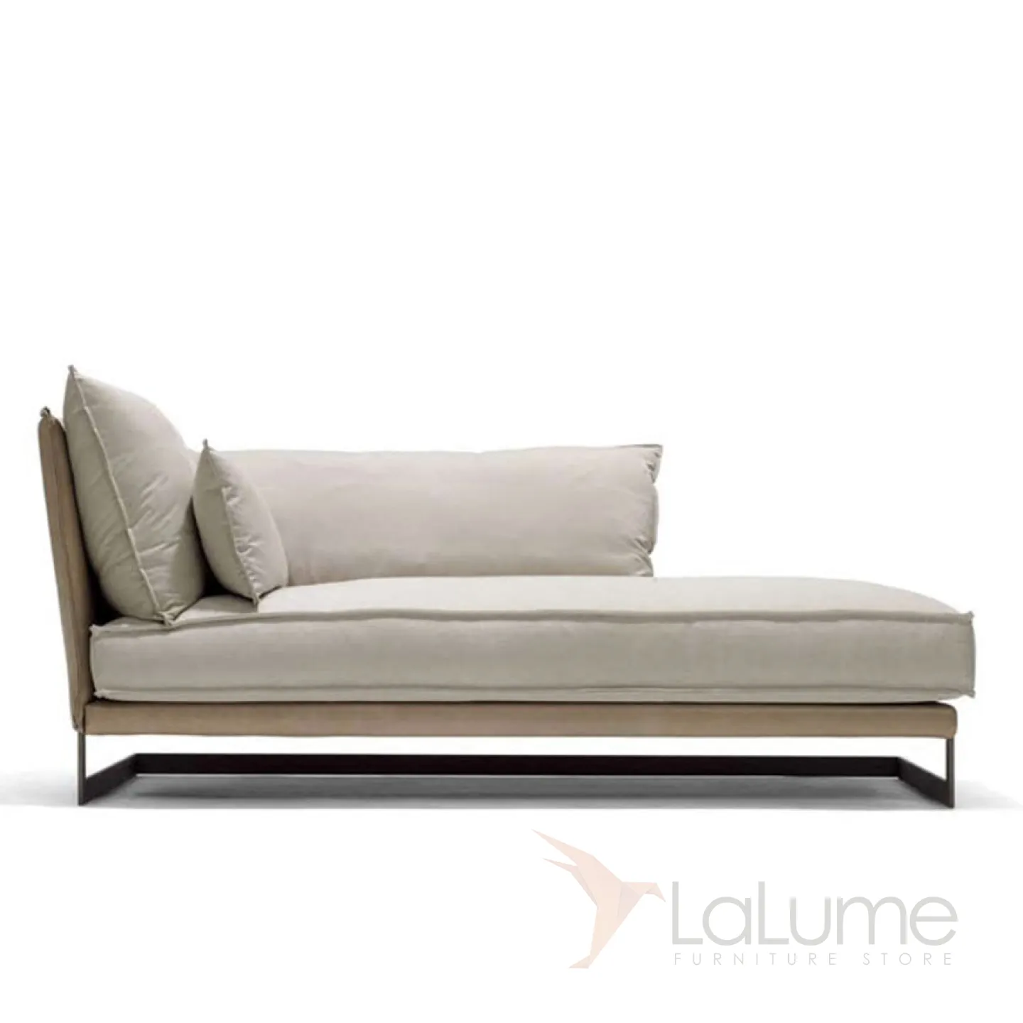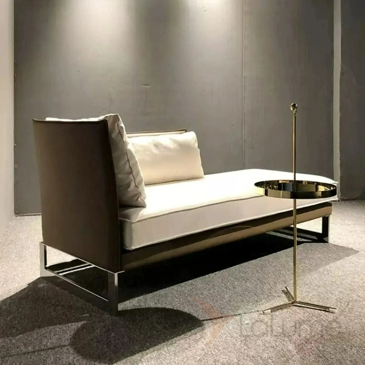Диван-кушетка с угловой спинкой. Металлическое основание из нержавеющей стали, деревянный каркас, обивка из поролона и мебельного текстиля, а также искусственное покрытие из кожи.
