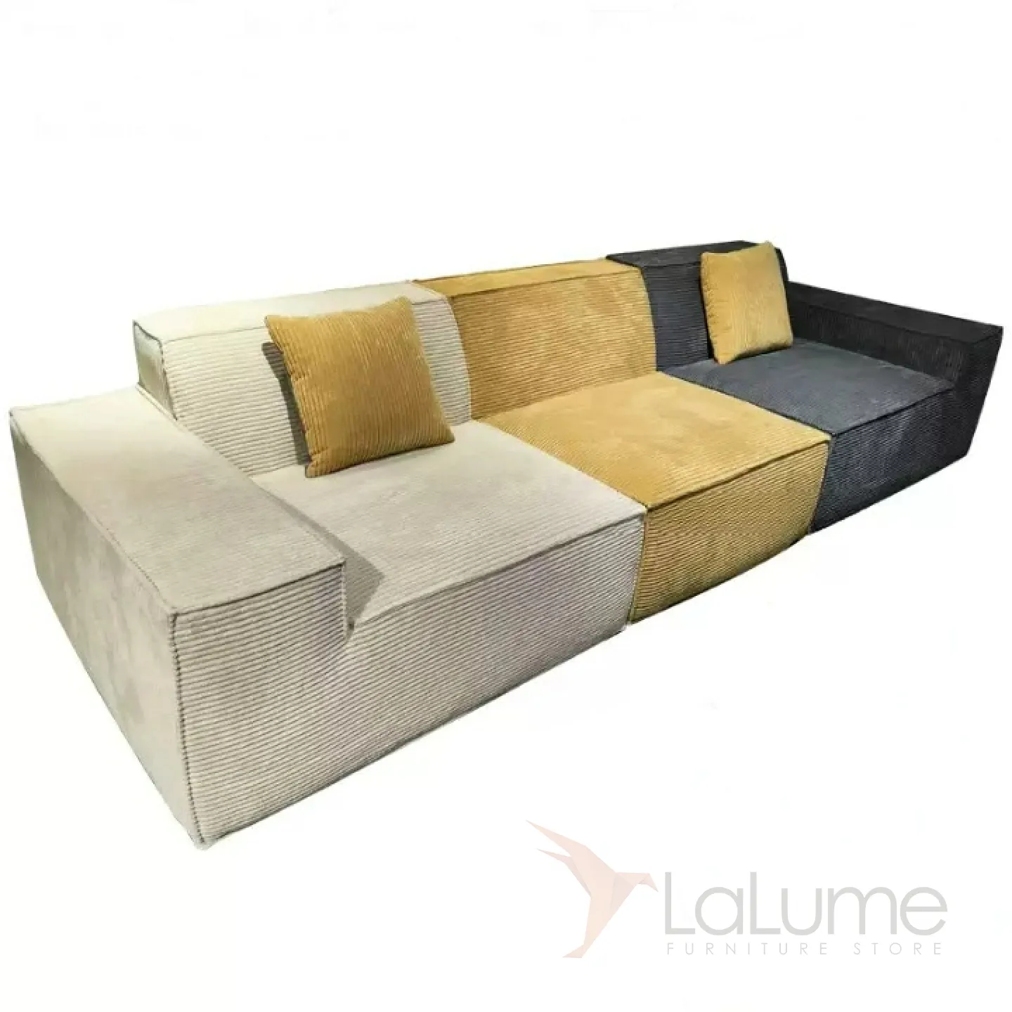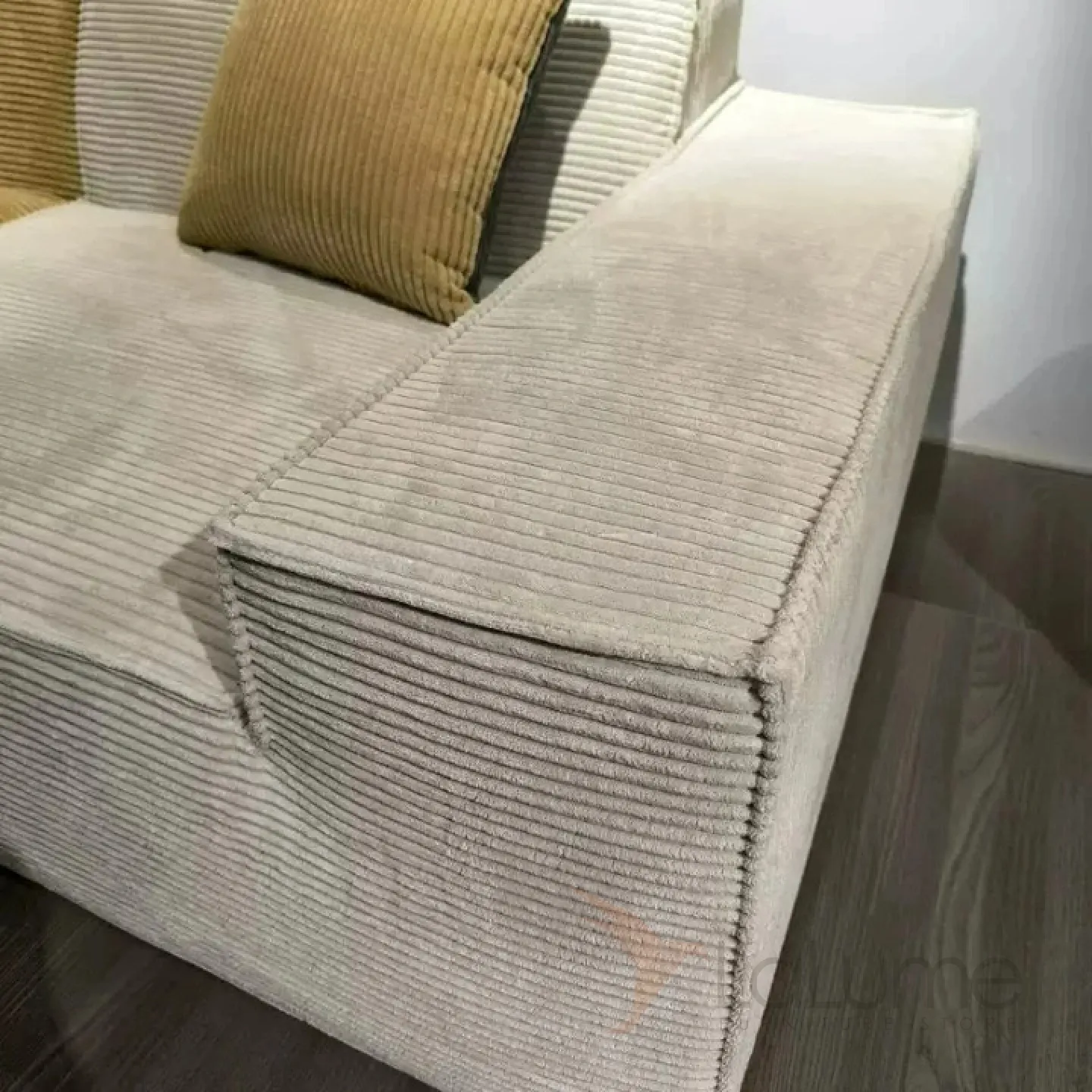 Компрессионный диван из плотной нейлоновой губкой сохраняет форму на долгие годы. Вельветовая обивка легко снимается благодаря молнии. Доступны модели разной длины: трёхместные, двухместные и одноместные, как часть модуля.