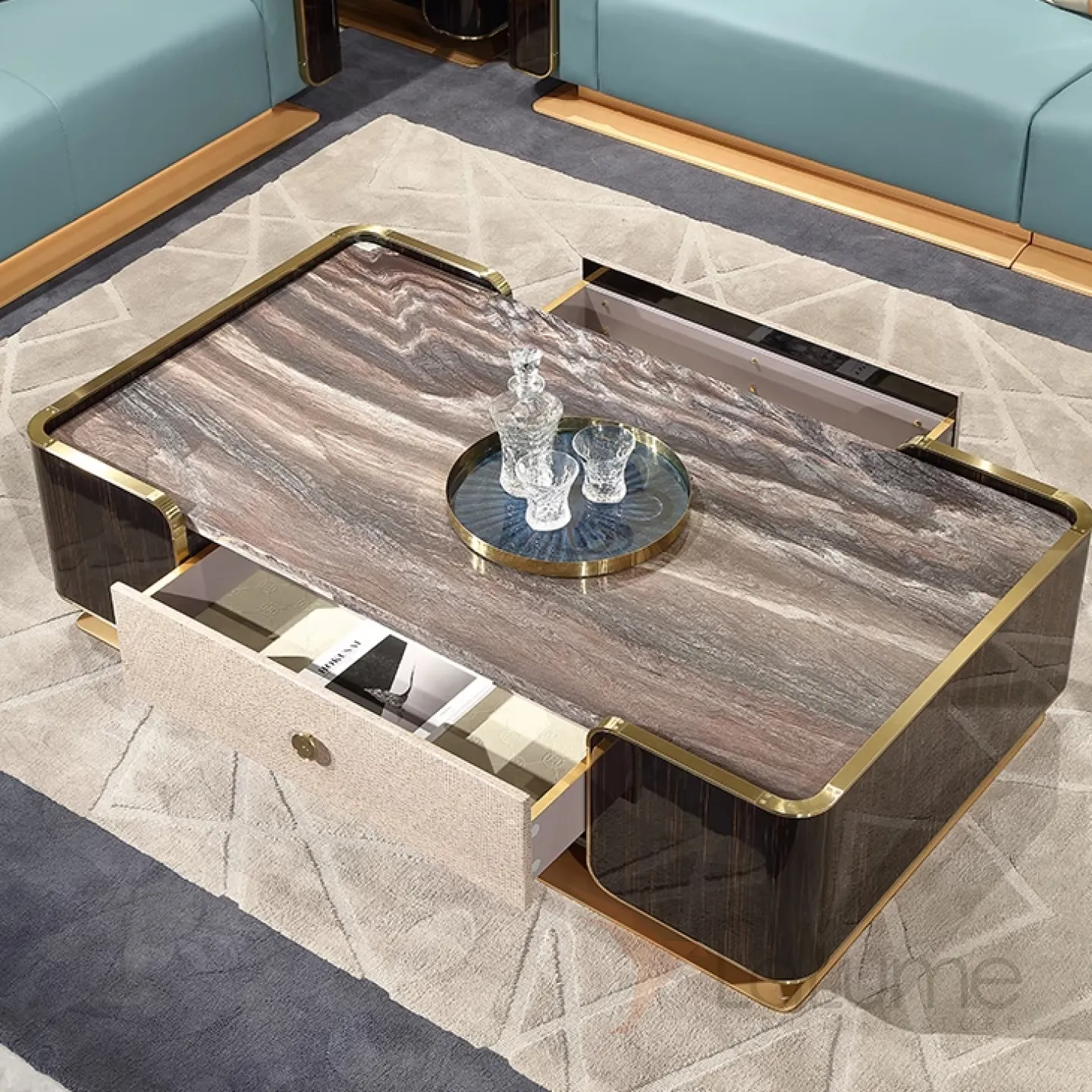 Этот элегантный журнальный столик с мраморной столешницей и корпусом из красного дерева станет настоящим украшением вашего интерьера. Его функциональность обеспечивают два выдвижных ящика.