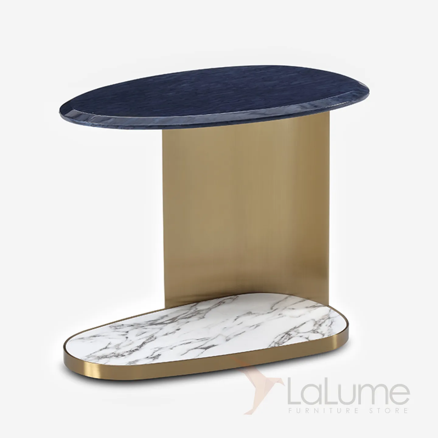 Угловой журнальный столик изготовлен из мрамора: столешница и основание выполнены из этого благородного материала. Ножка и подстолье сделаны из латуни, что придаёт им изысканный золотистый оттенок. Благодаря своим компактным размерам, столик можно легко разместить рядом с креслом или диваном.