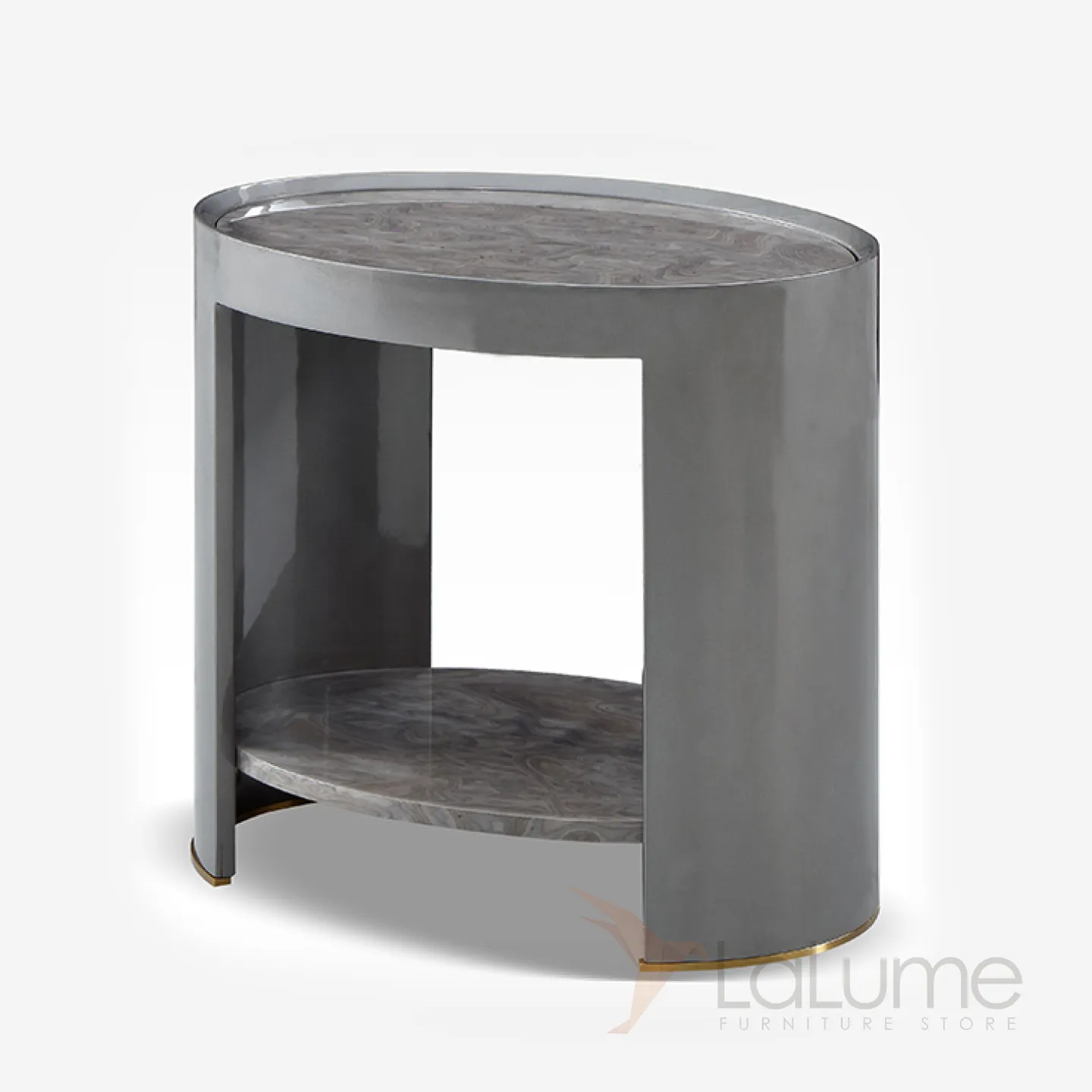 Изящный журнальный столик с овальной мраморной столешницей и деревянным корпусом, украшенным шпоном, станет настоящим украшением вашего интерьера. Его основание выполнено из нержавеющей стали, которая украшена под золото.
