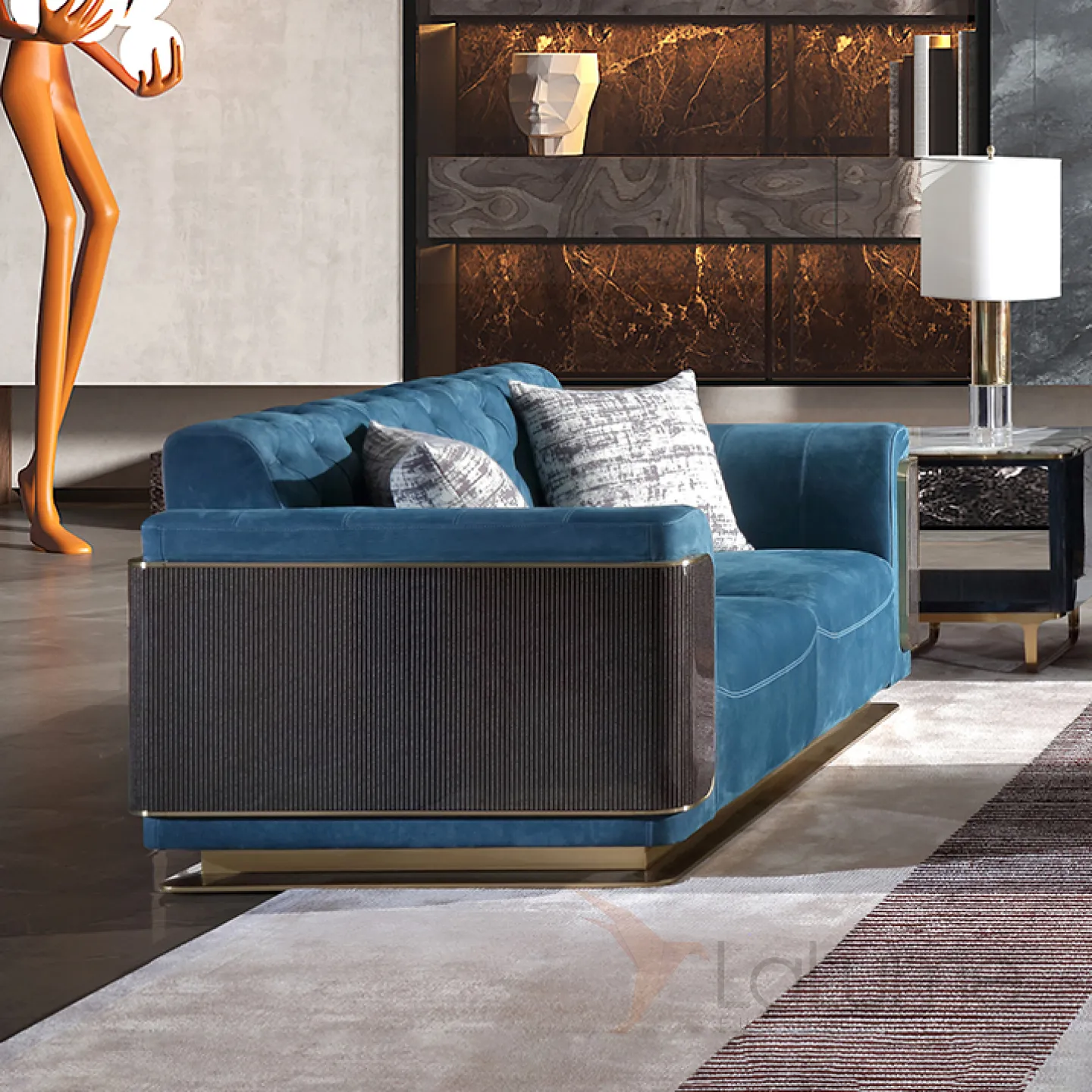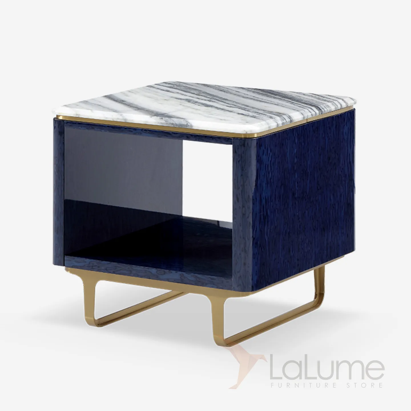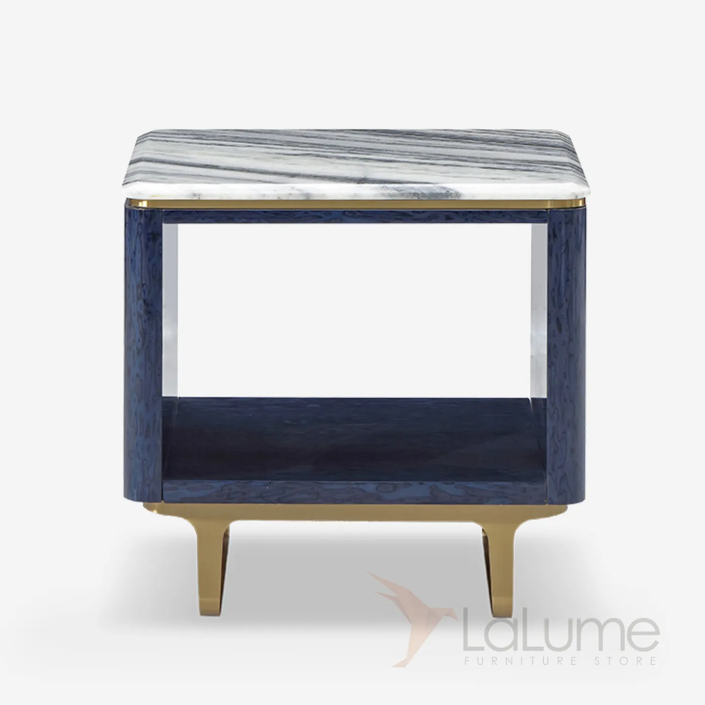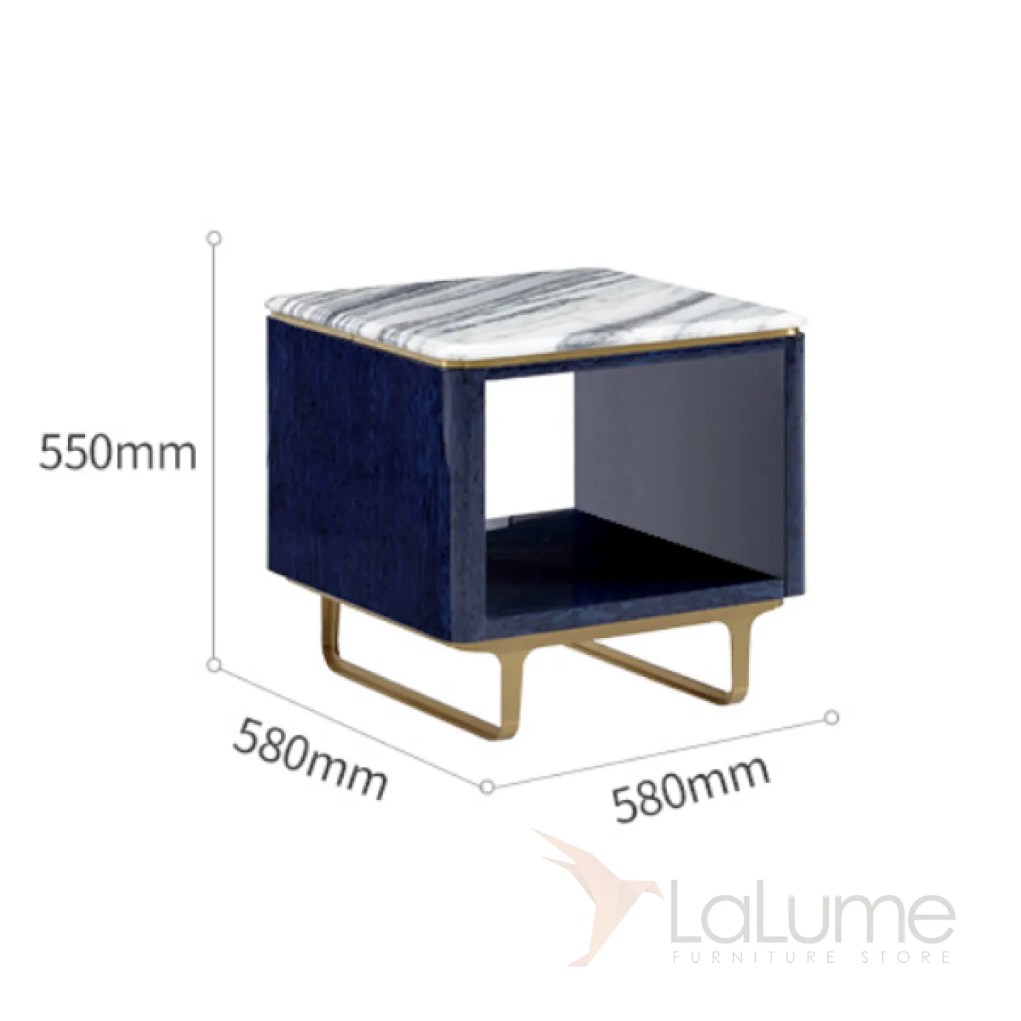 Стильный журнальный столик с квадратной столешницей, в котором элегантность мрамора гармонично сочетается с теплом натурального дерева. Глубокий синий цвет шпона придаёт ему особый шарм и прекрасно впишется в любой интерьер.