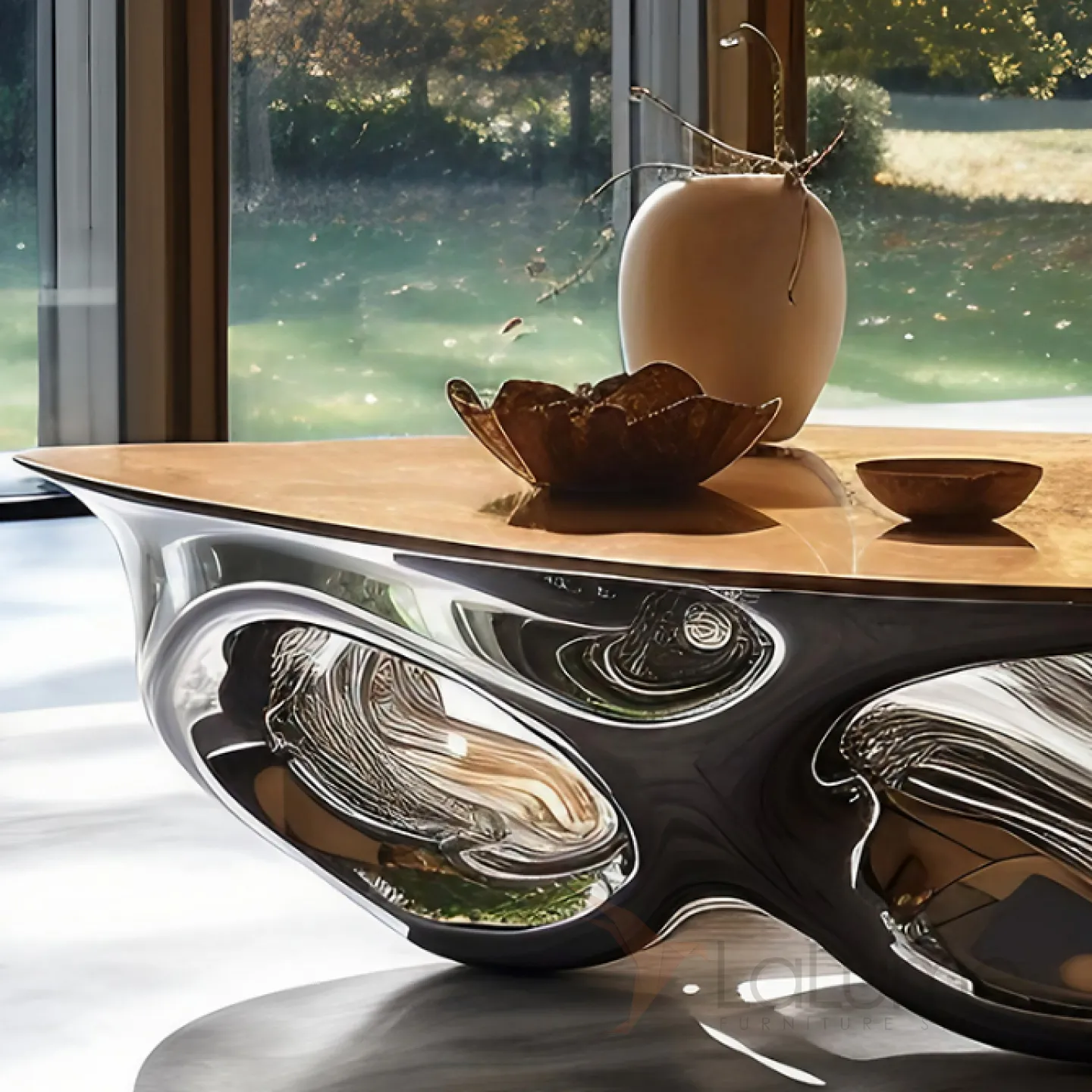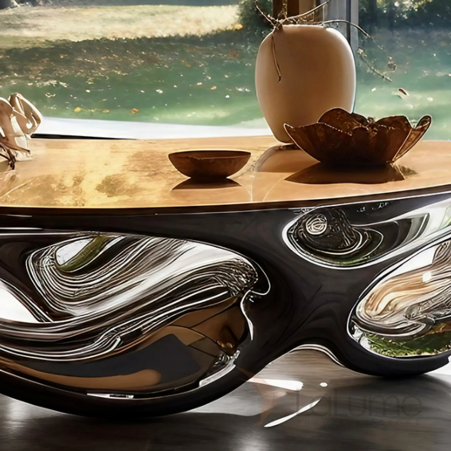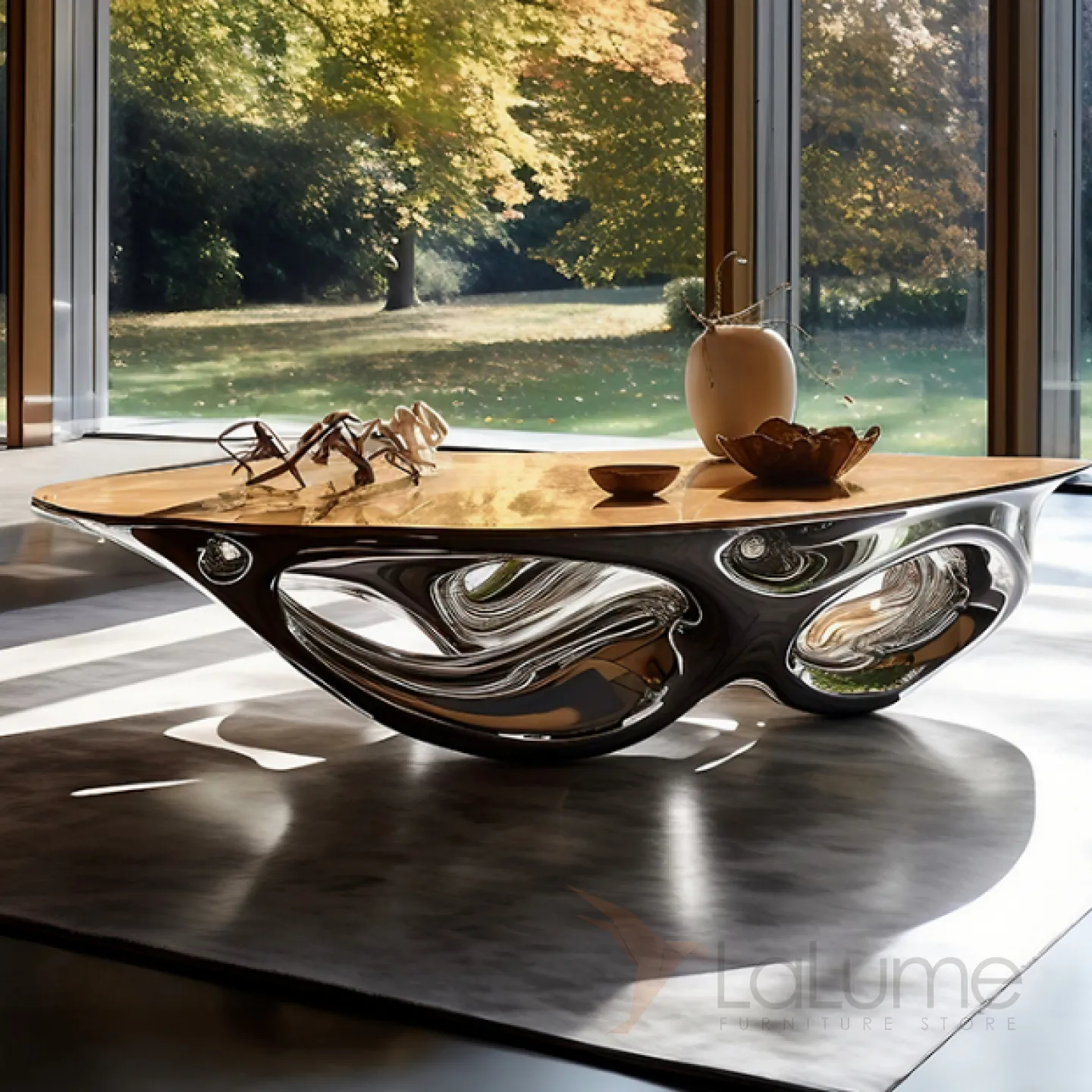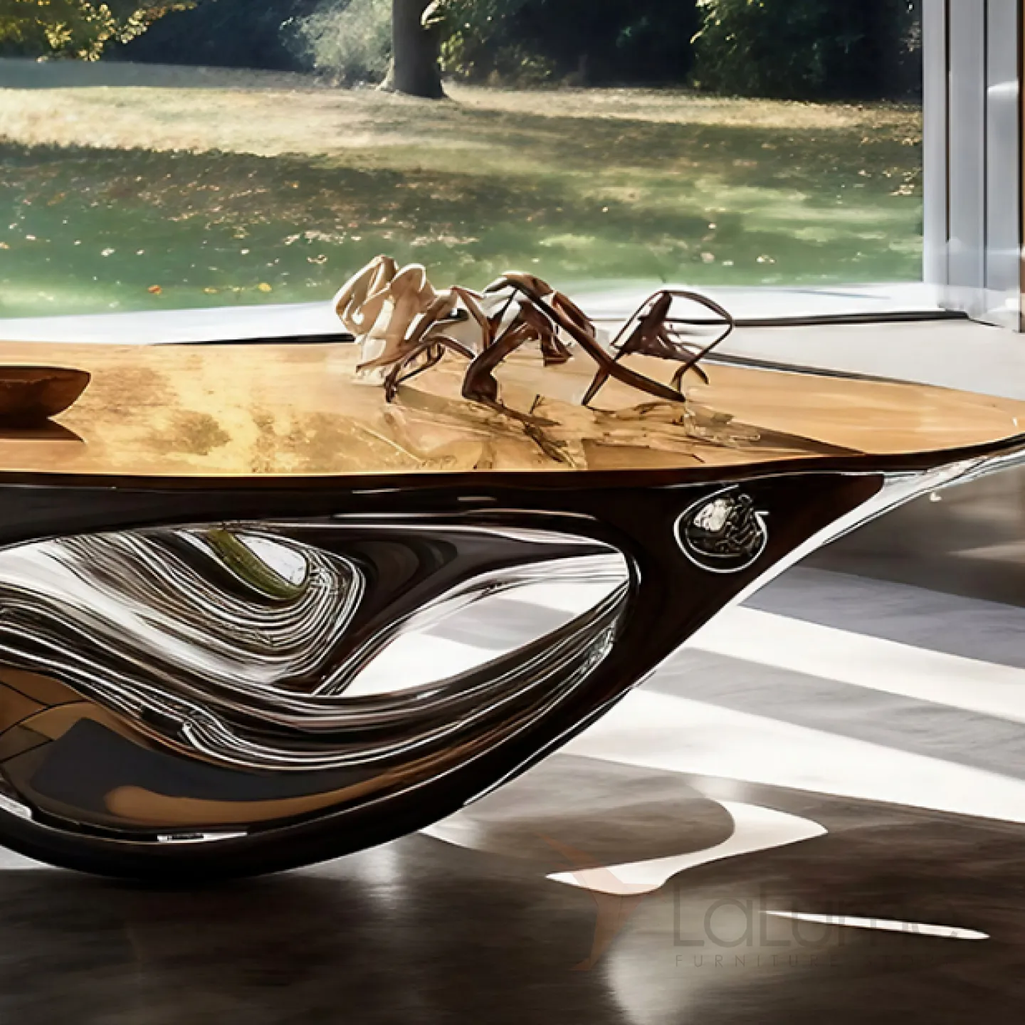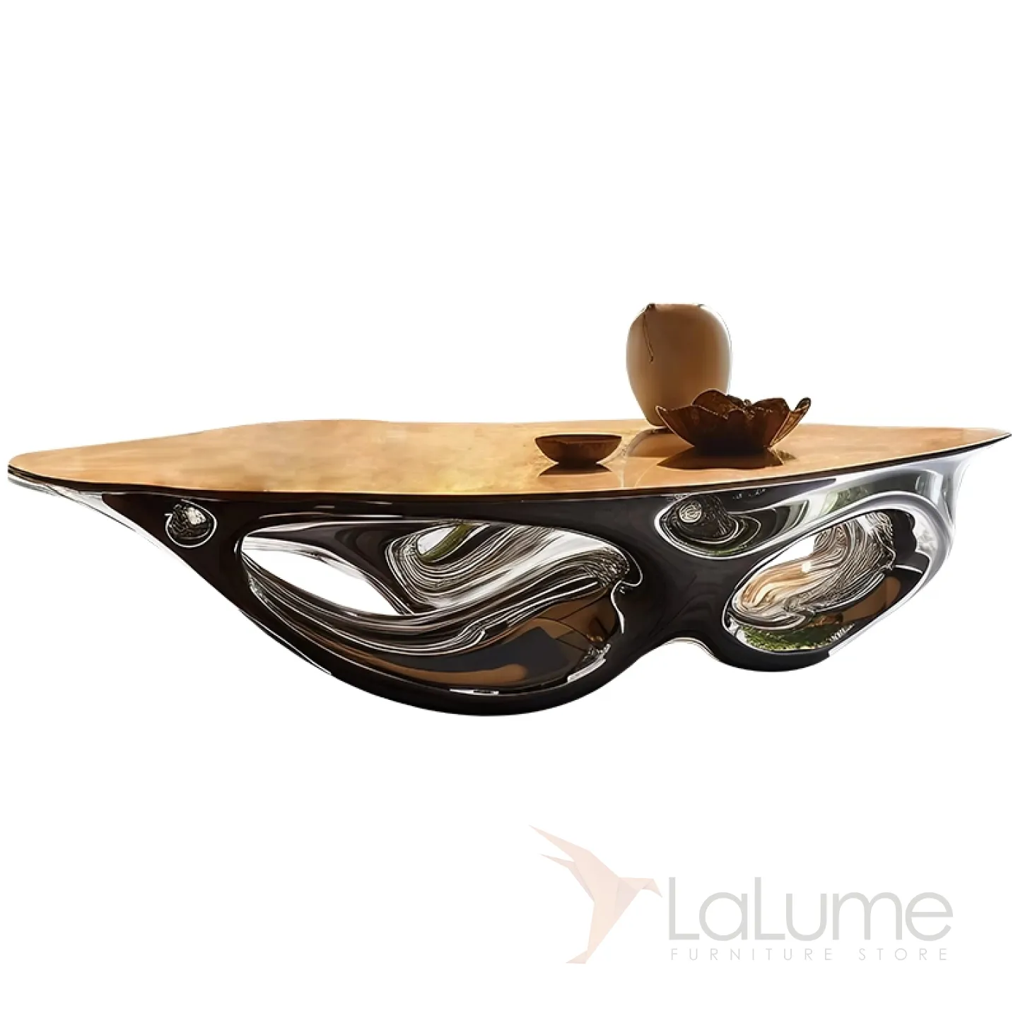 Этот элегантный и впечатляющий журнальный стол, изготовленный из массива чёрного дерева и современного металла с нанопокрытием, имеет плавные очертания и станет прекрасным дополнением к вашему интерьеру.