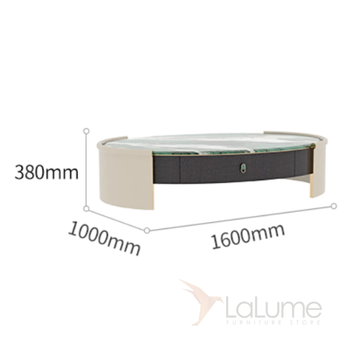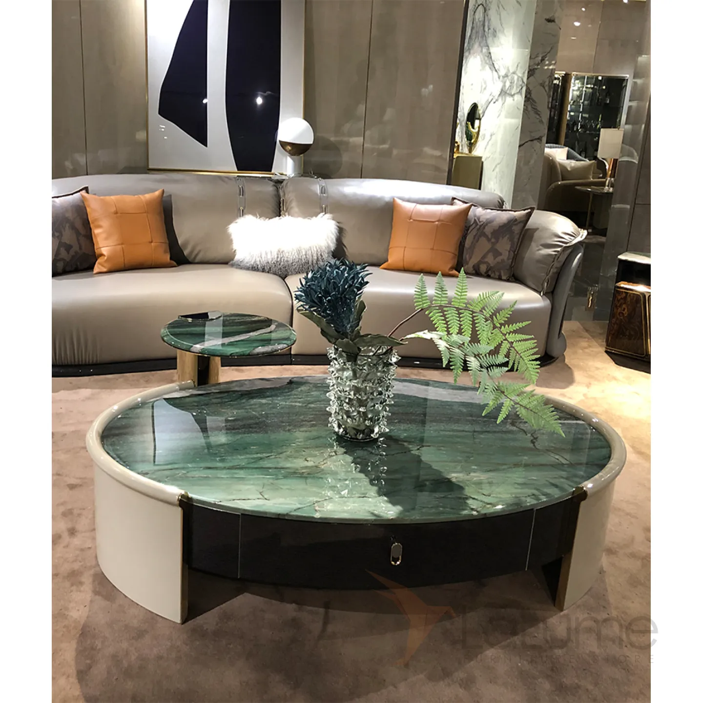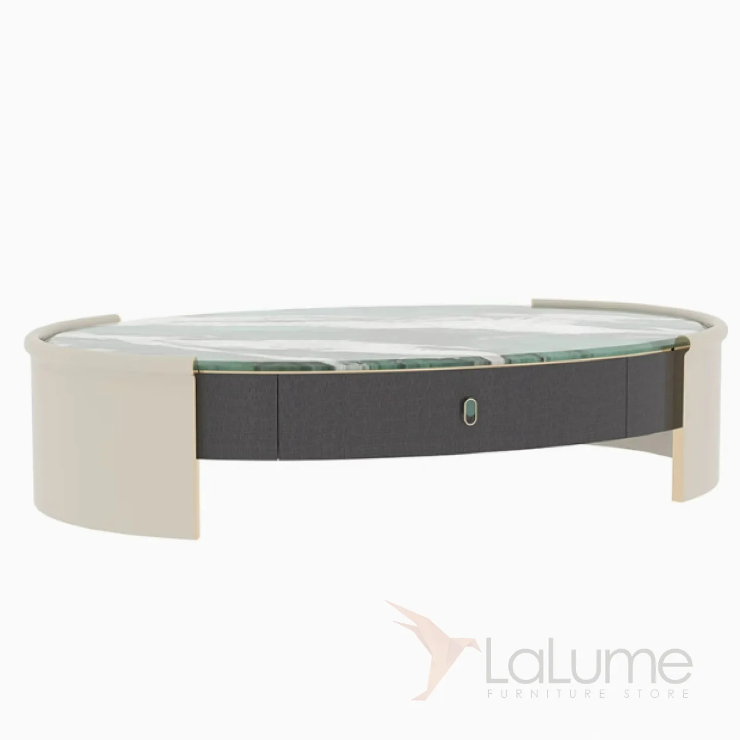 Элегантный овальный столик с столешницей из зелёного мрамора. Основание из дерева и шпона. Выдвижной ящик для хранения.
