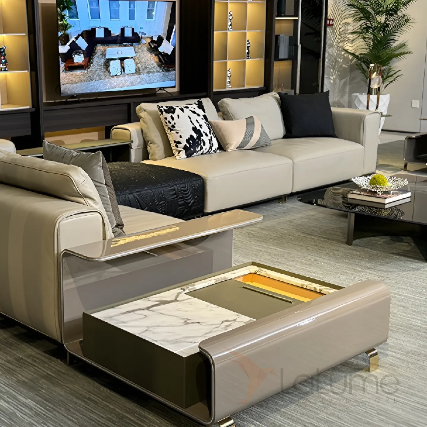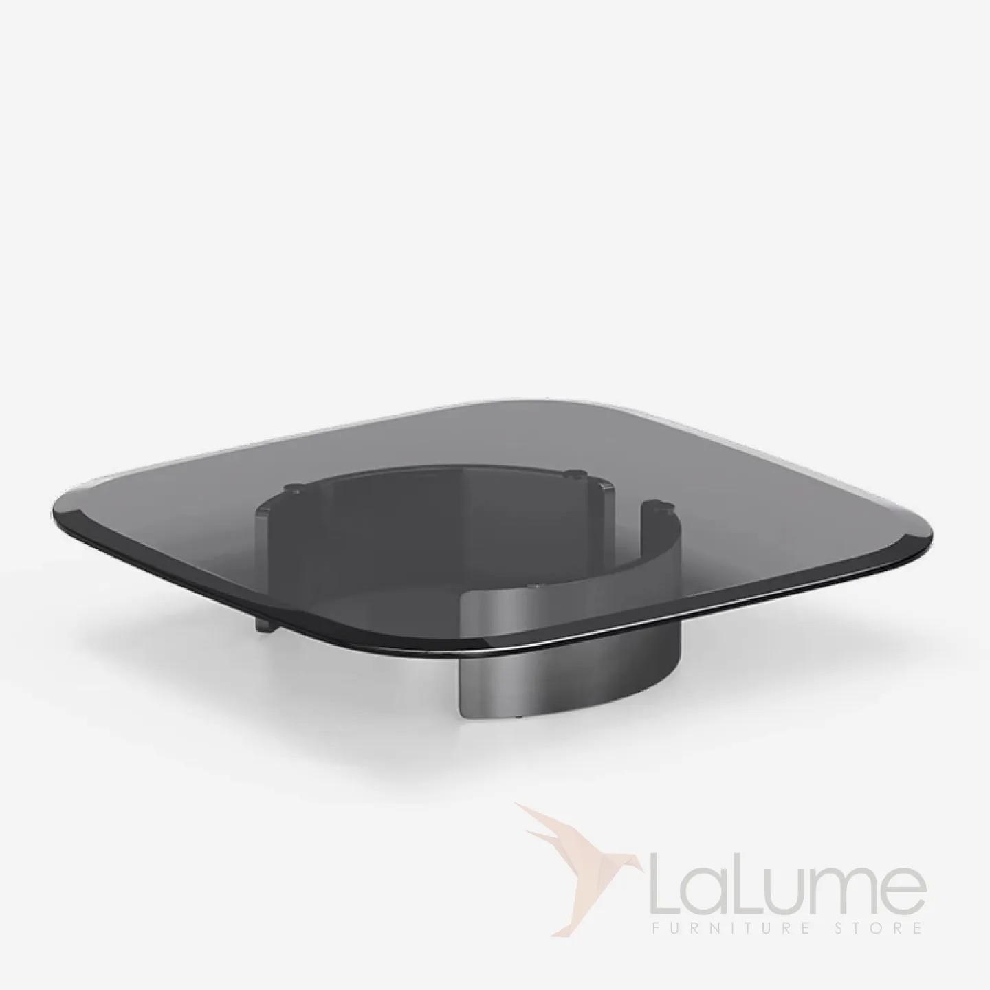 Стильный журнальный столик с необычным дизайном: корпус из нержавеющей стали, столешница из стекла.