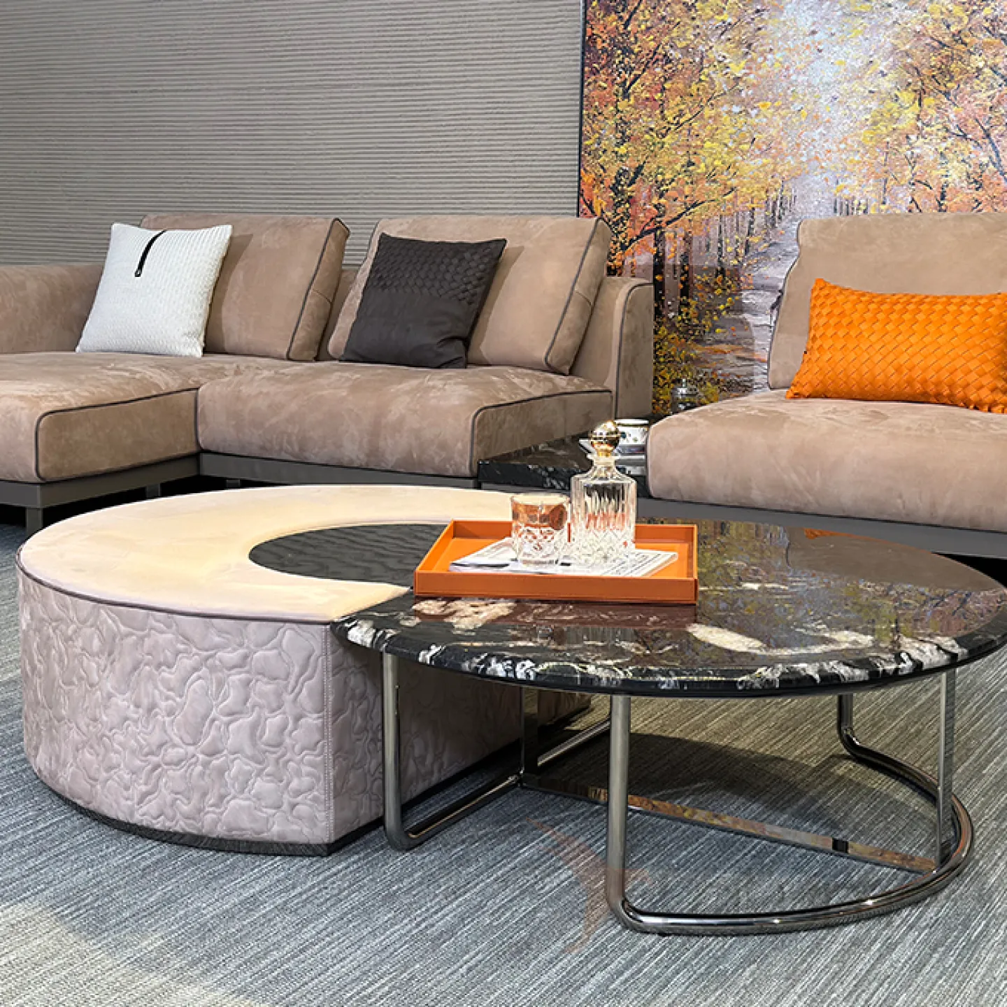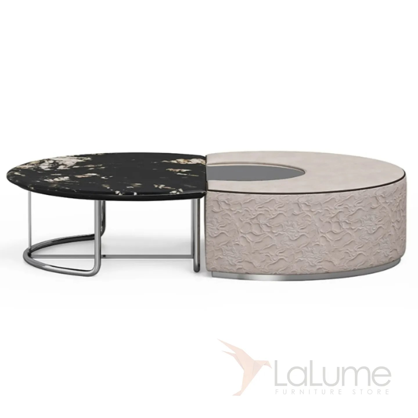 Этот журнальный столик сочетает в себе кожу, мрамор и зеркало. Столешница выполнена из этих материалов, создавая интересный визуальный эффект. Основание стола сделано из бука и нержавеющей стали, что обеспечивает прочность и долговечность.
