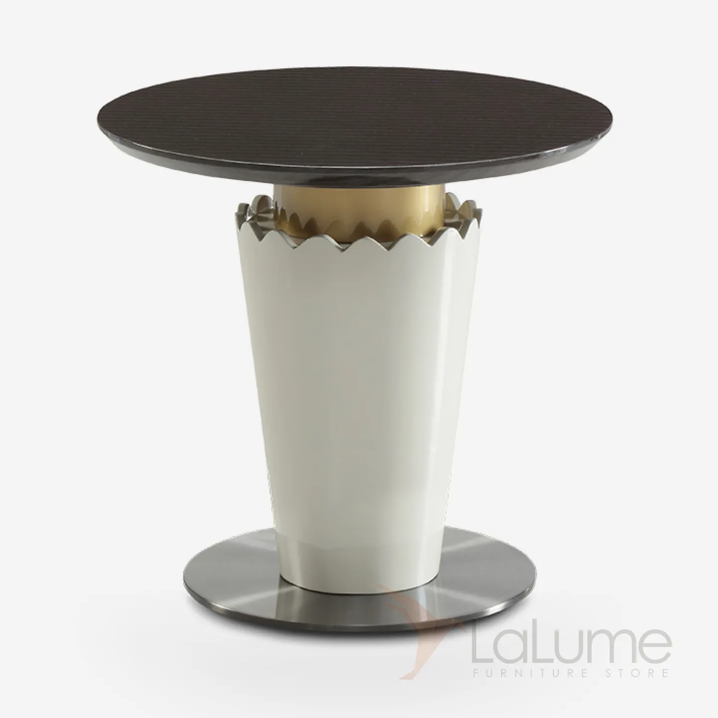 Круглый металлический столик с деревянным верхом из шпона, украшенный оригинальным подстольем.