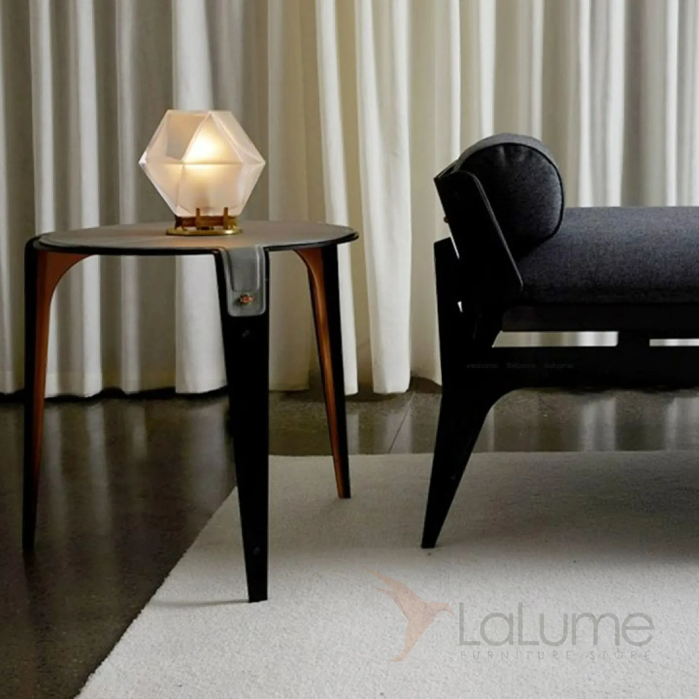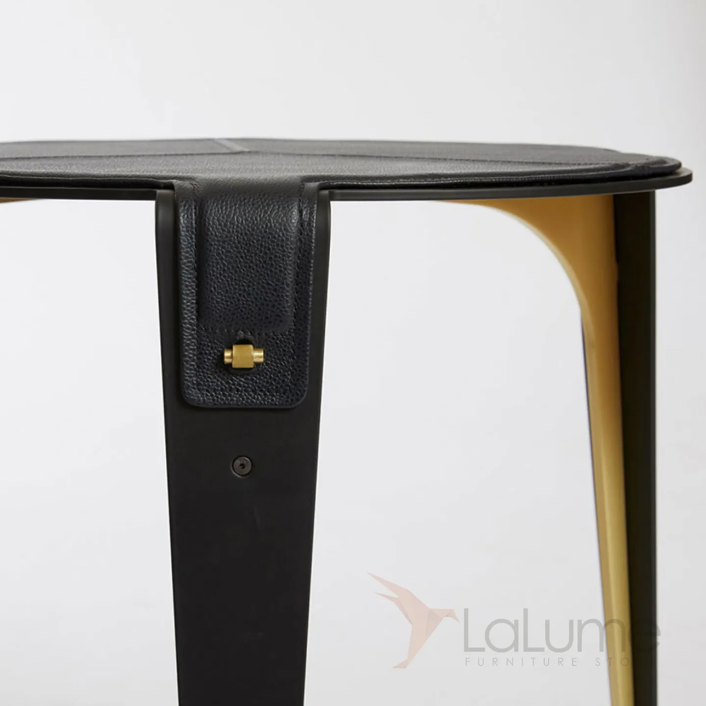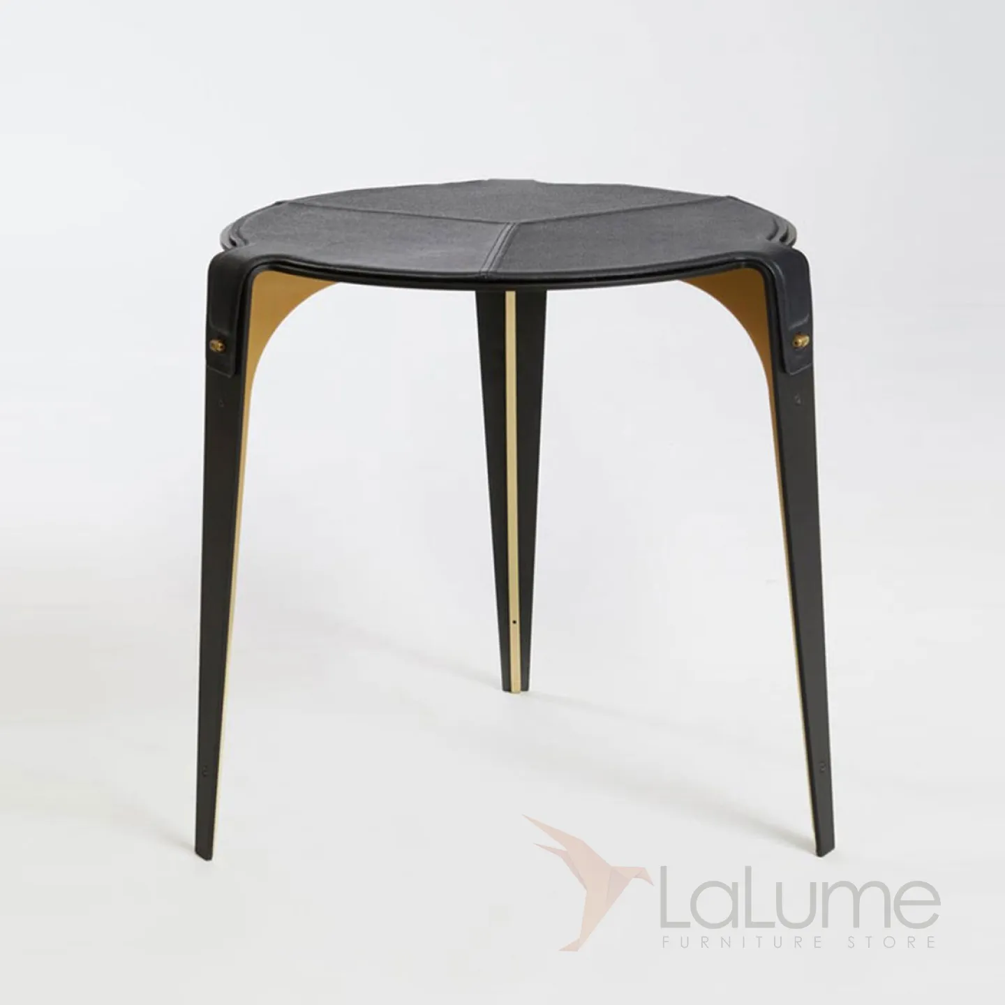 Стол из металла, выполненный из нержавеющей стали, с поверхностью, покрытой натуральной кожей.