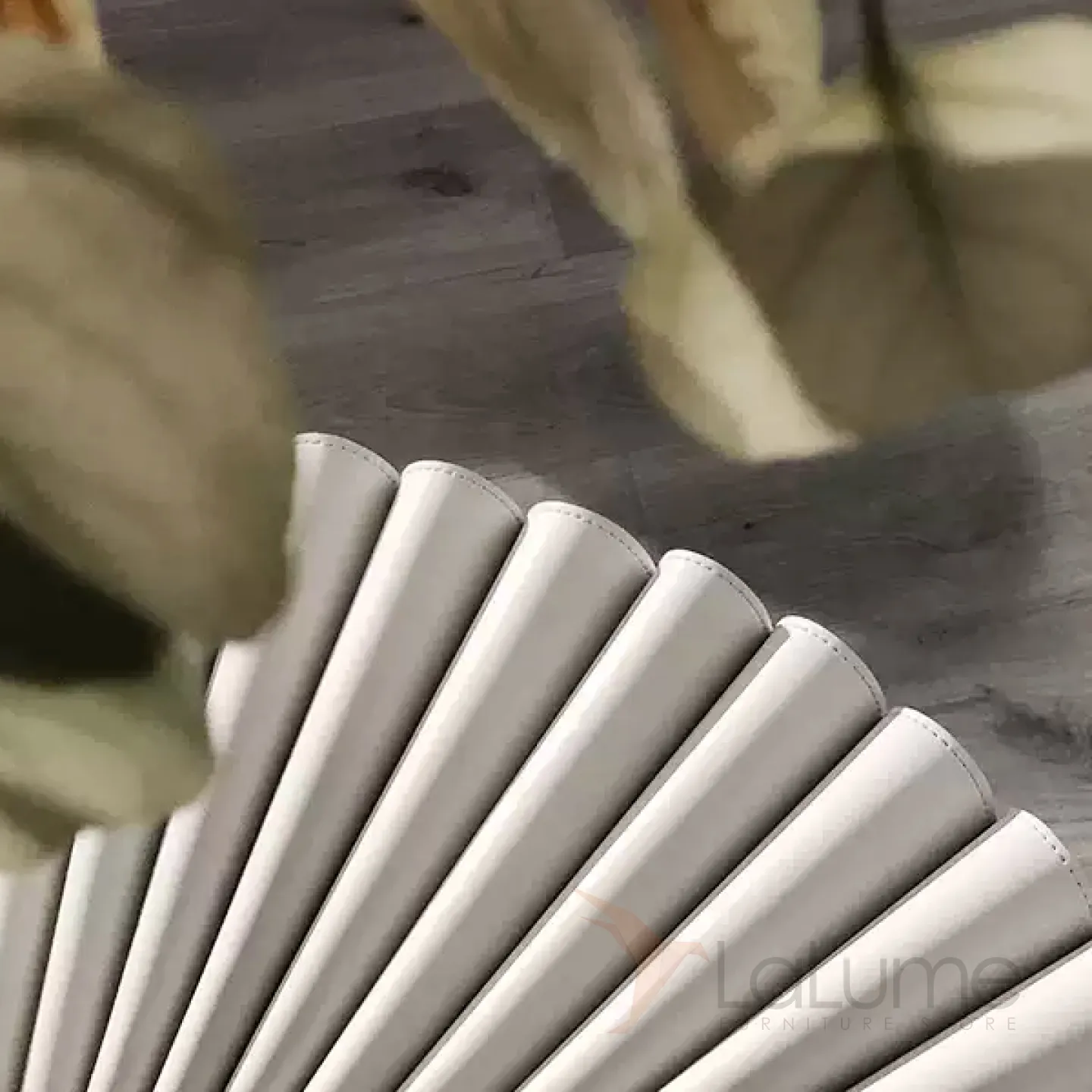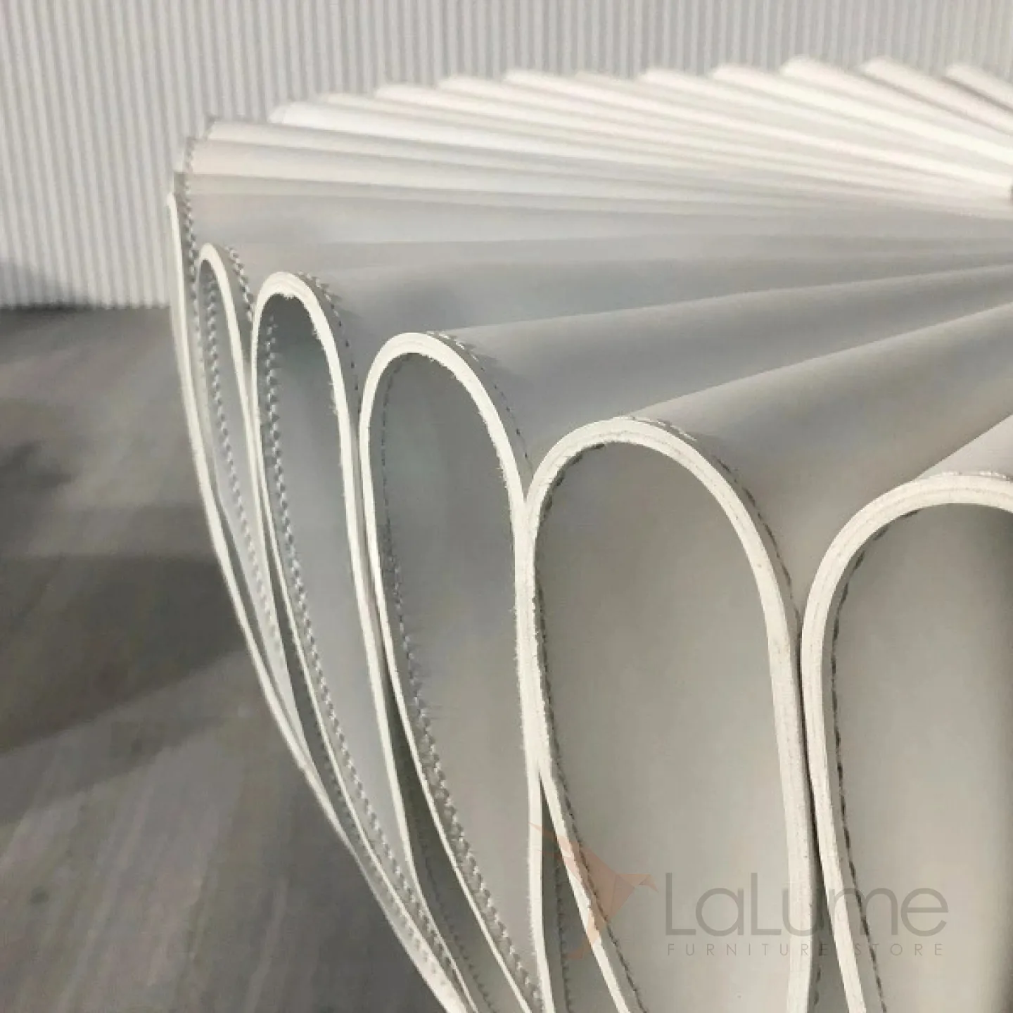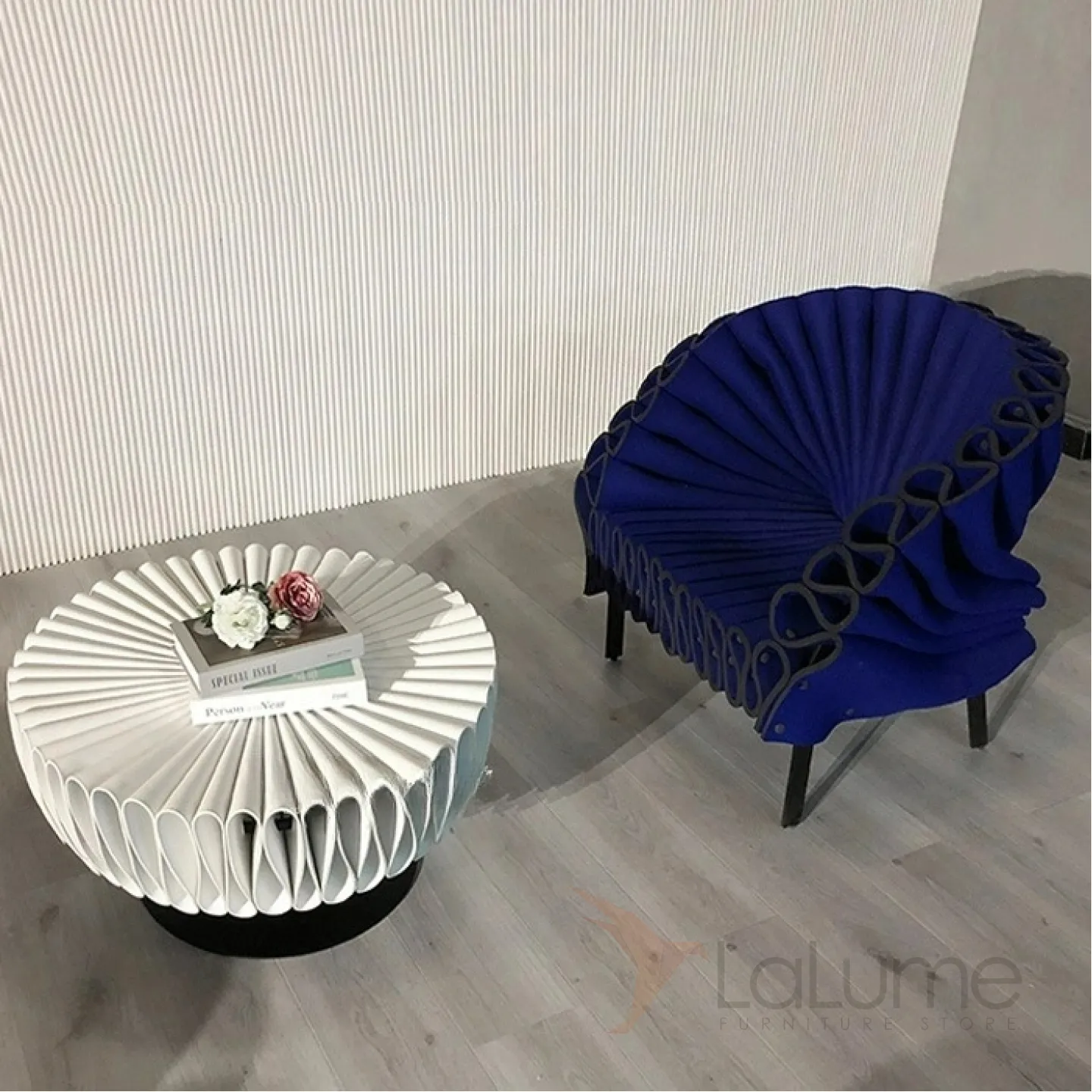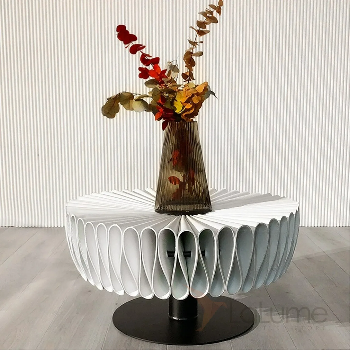 Журнальный столик в форме жабо, выполненный из жёсткой плиссированной кожи и украшенный металлическим каркасом.
