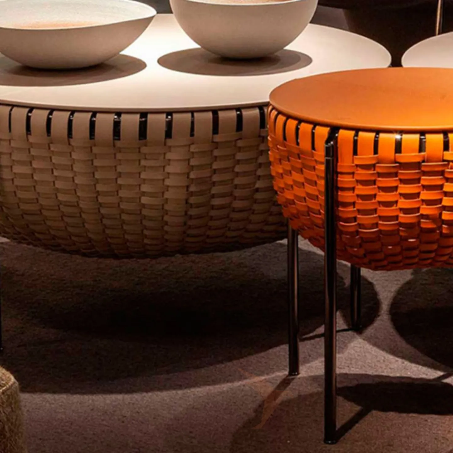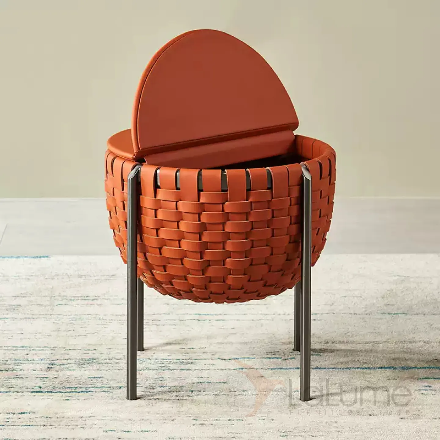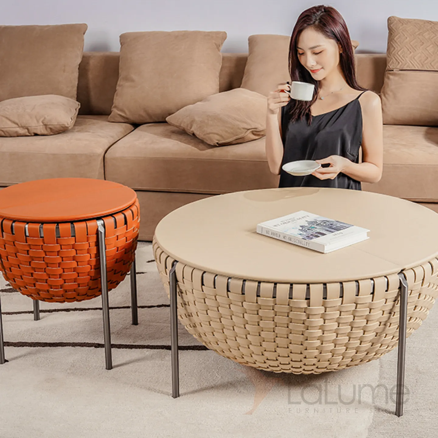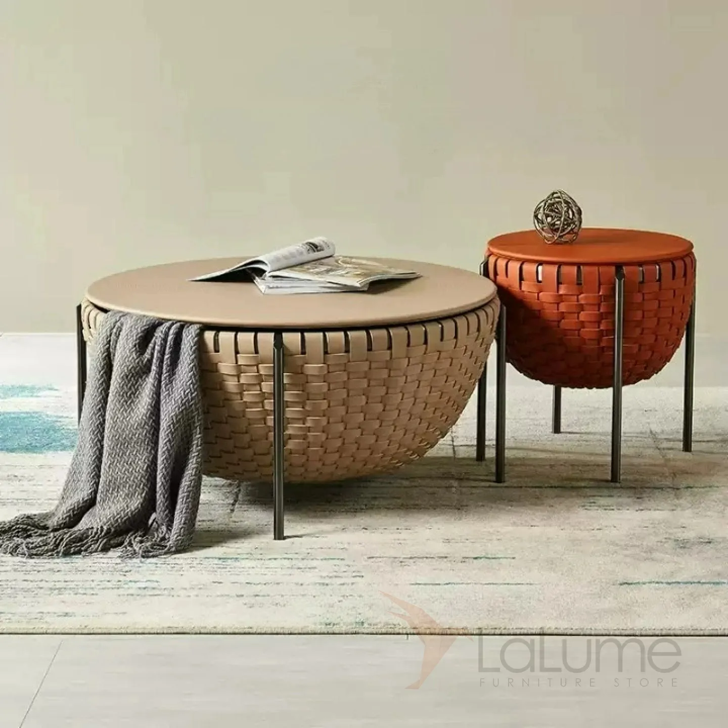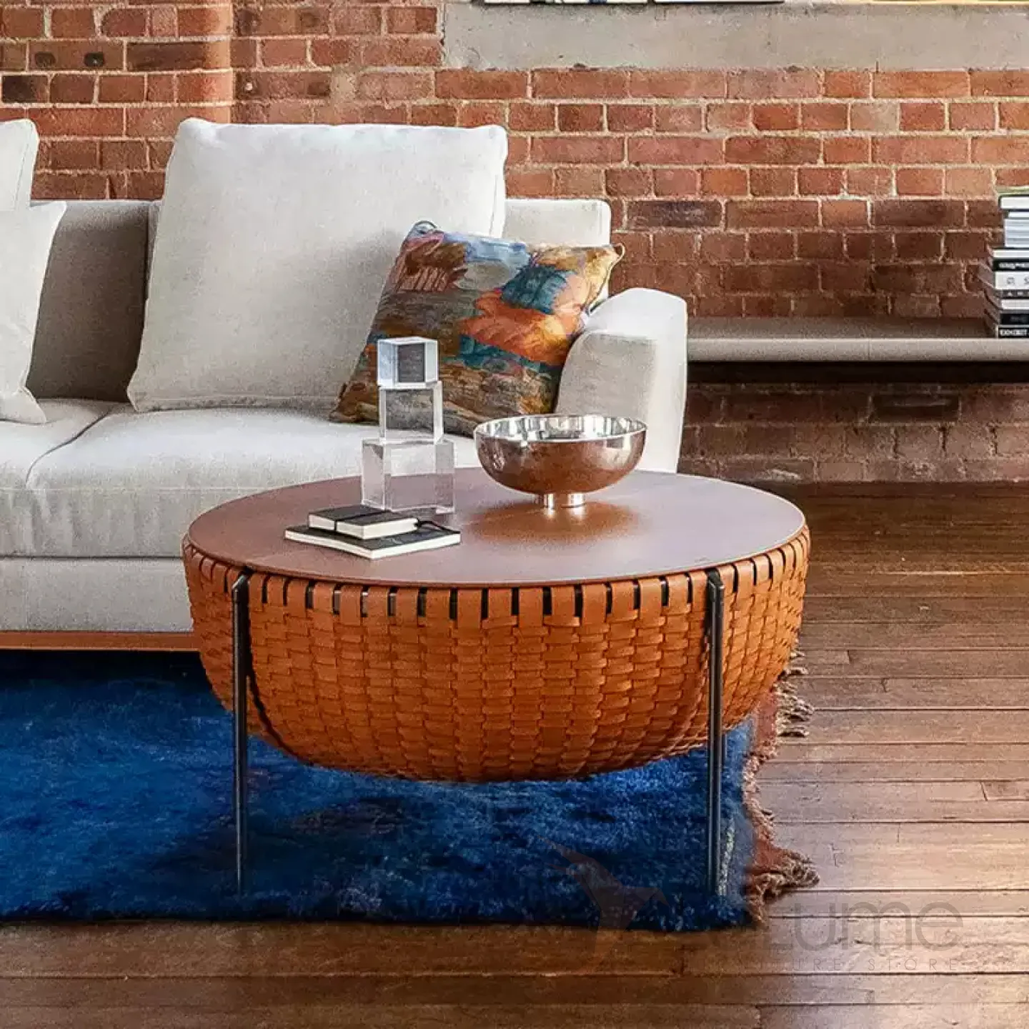 Журнальный столик с необычным дизайном. Каркас из матовой нержавеющей стали. Столешница и плетёная ниша под столом выполнены из качественной седельной кожи. Столешница разделена на две части, которые можно откинуть, открывая доступ к нише для хранения.