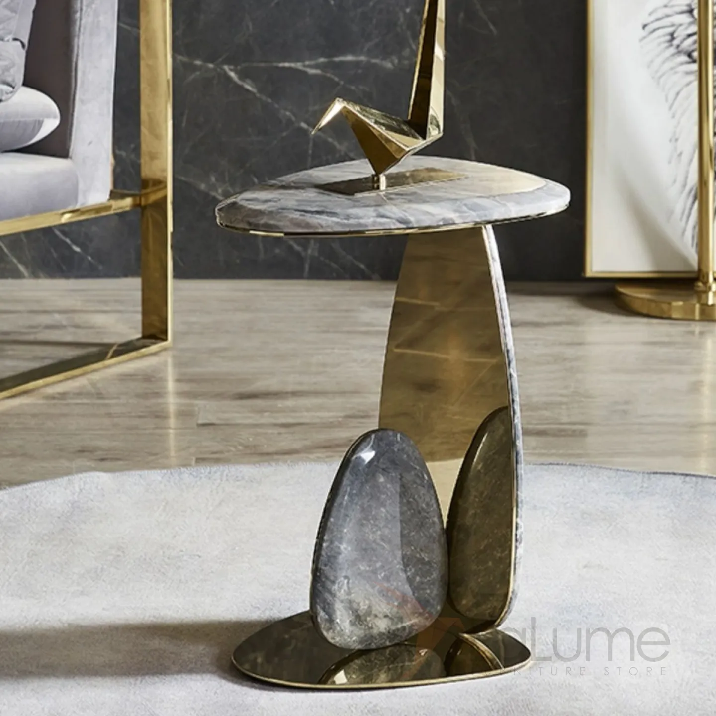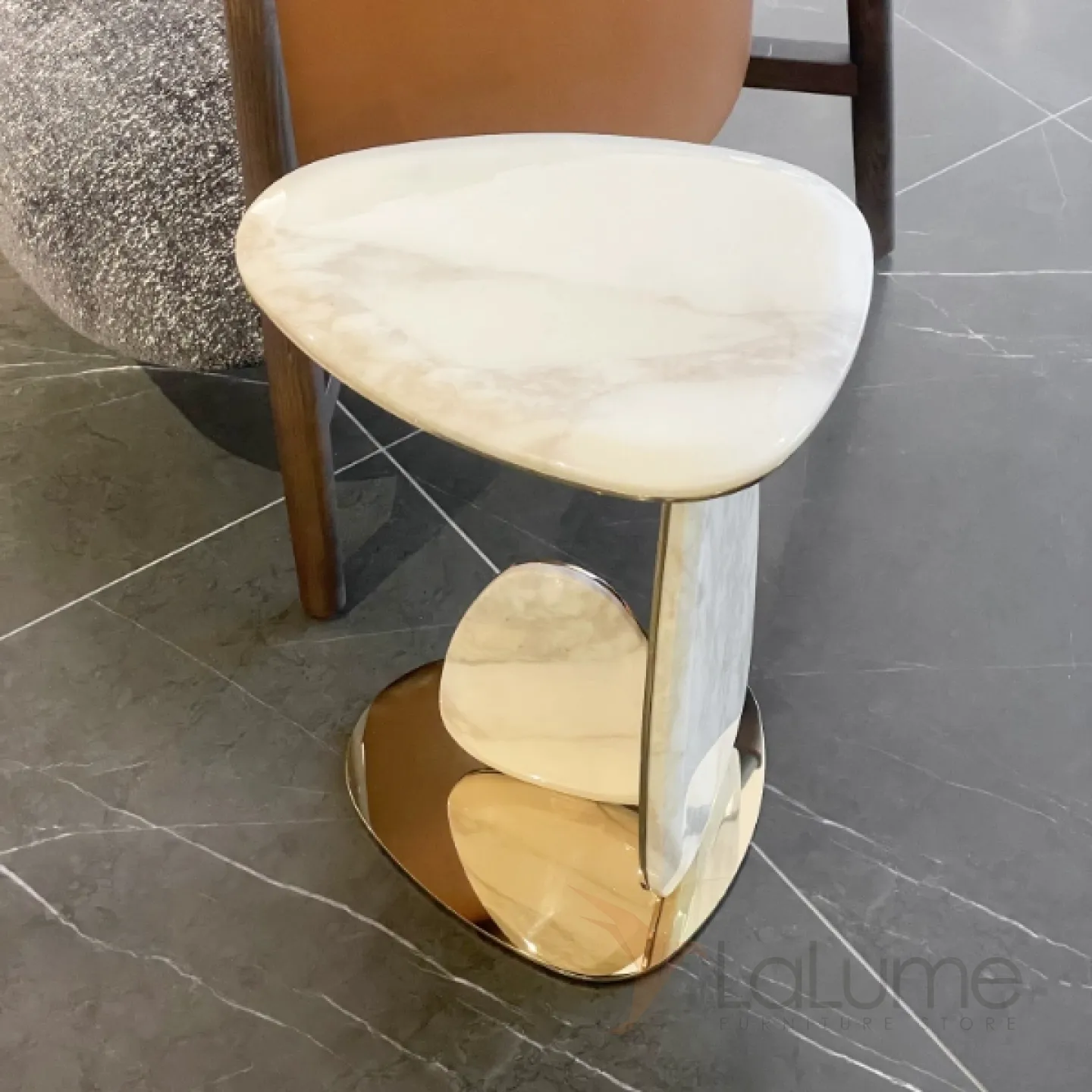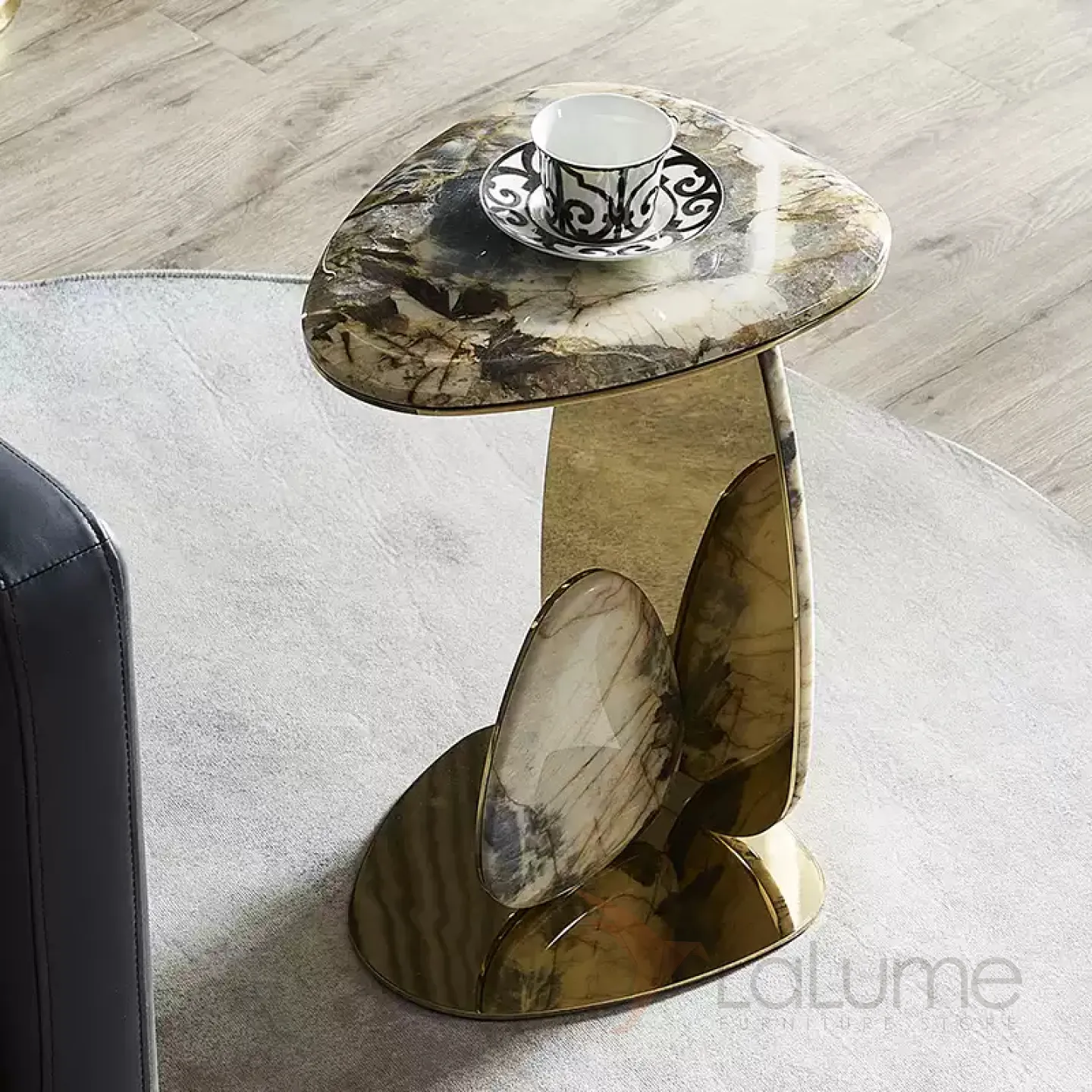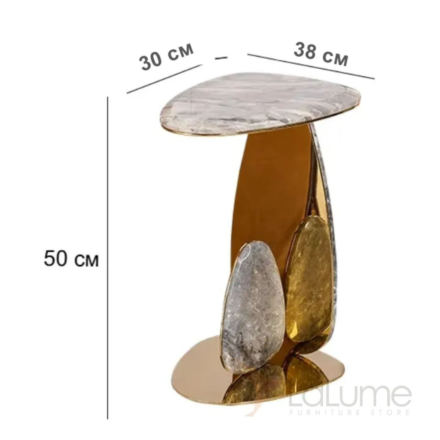 Компактный журнальный столик с основанием из нержавеющей стали и столешницей из натурального мрамора. Есть несколько вариантов цвета мрамора на выбор.