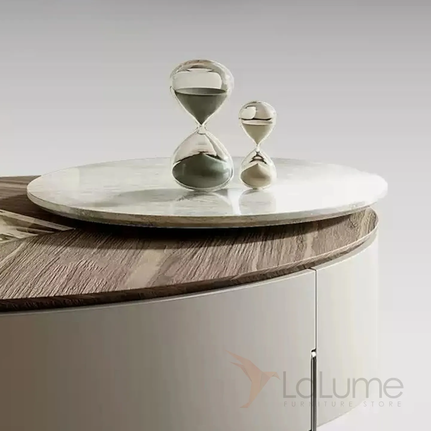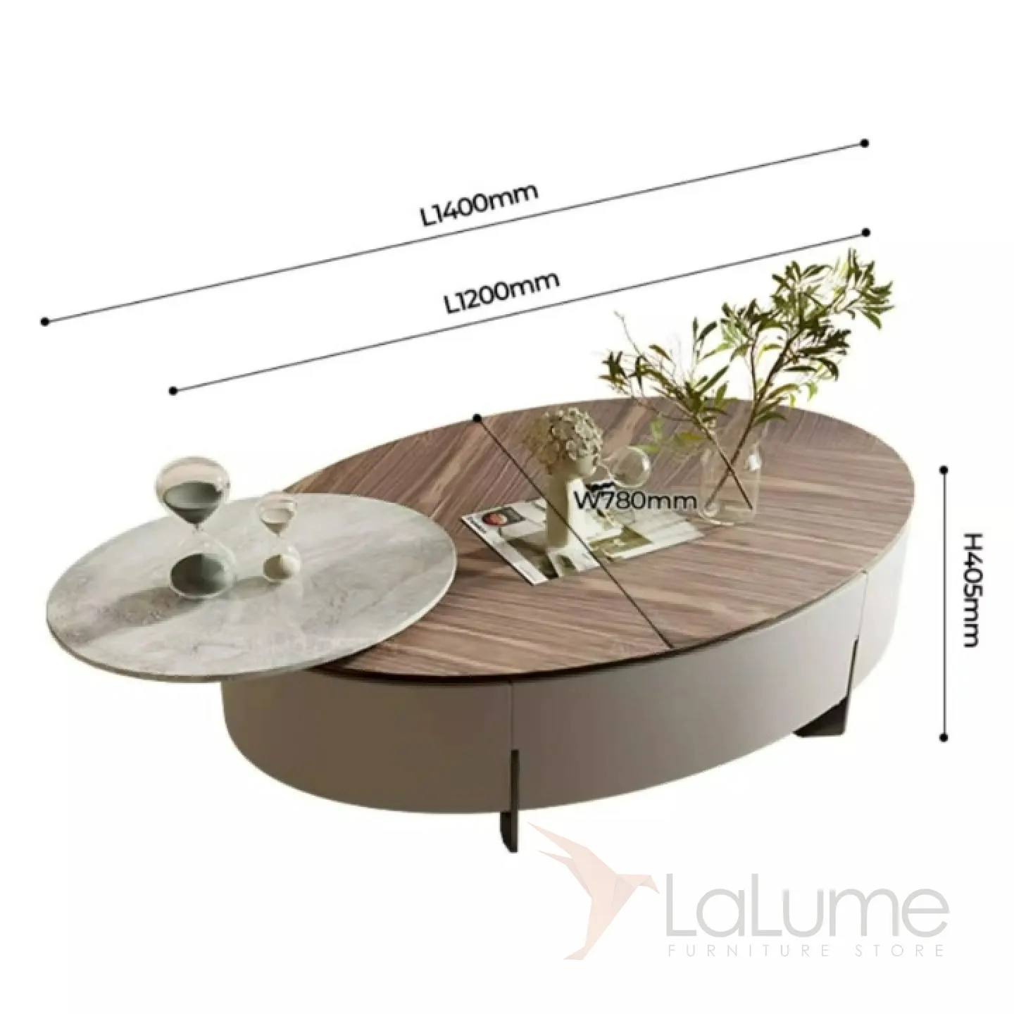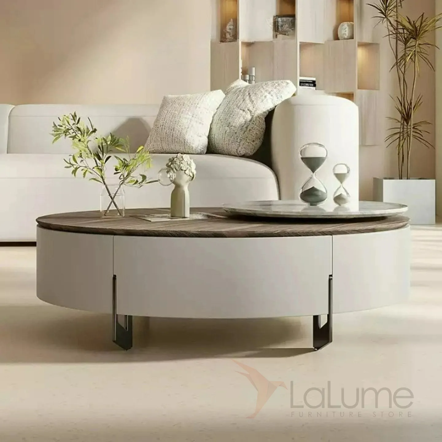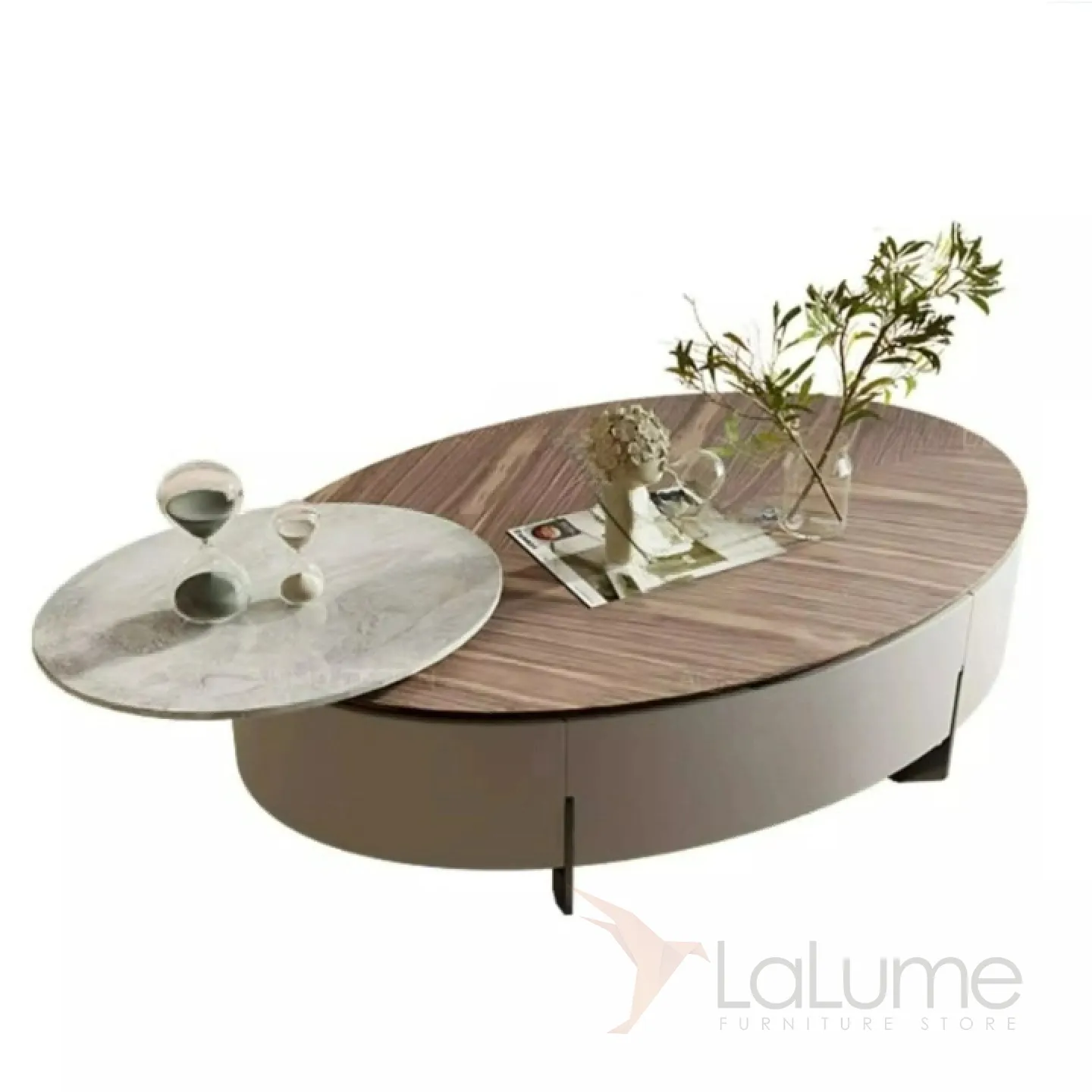 Изящный журнальный столик на стальных ножках. Каркас выполнен из дерева, столешница – из древесины с уникальной текстурой. В центре – поворотная мраморная поверхность. Для хранения есть выдвижной ящик.