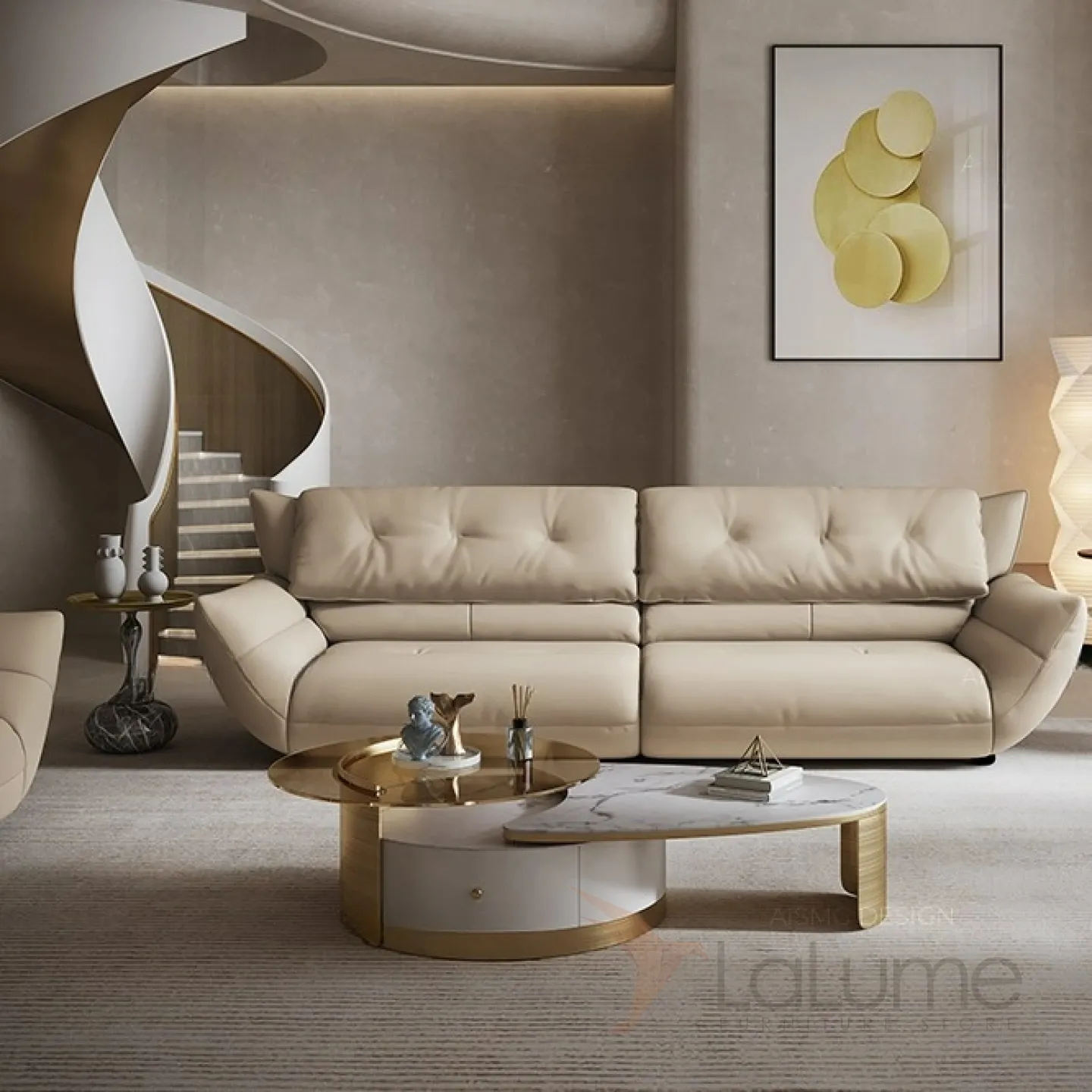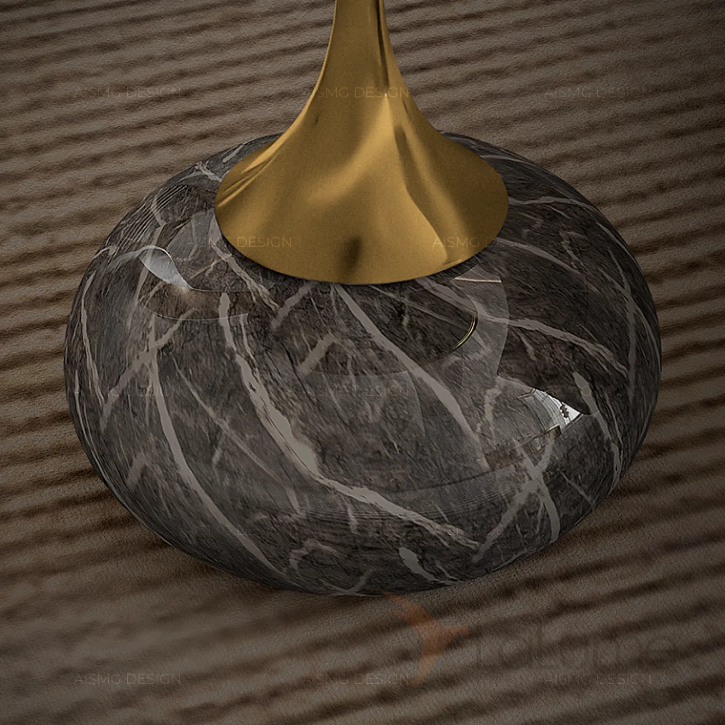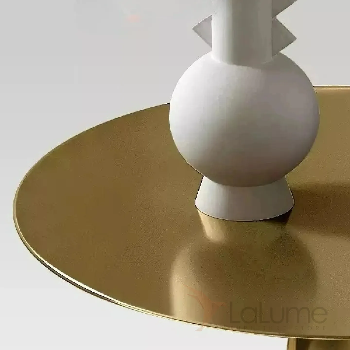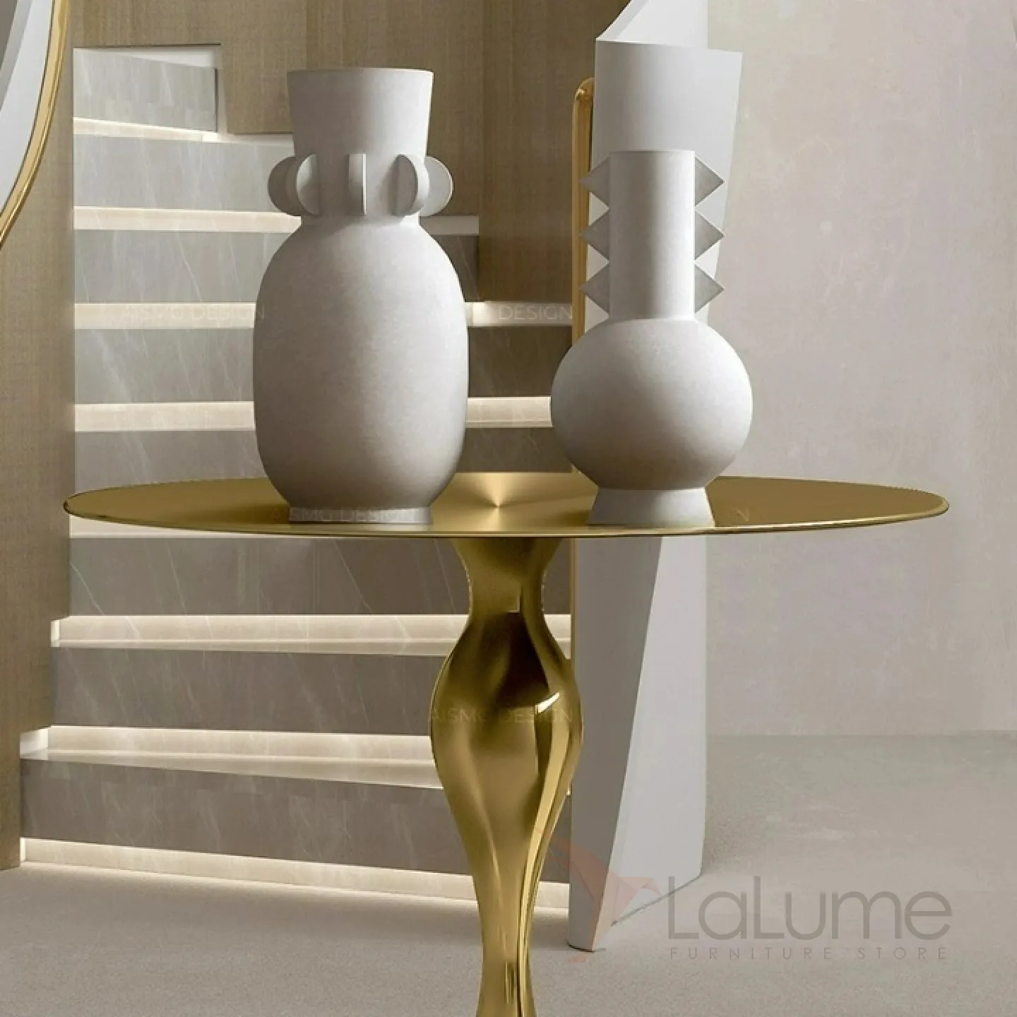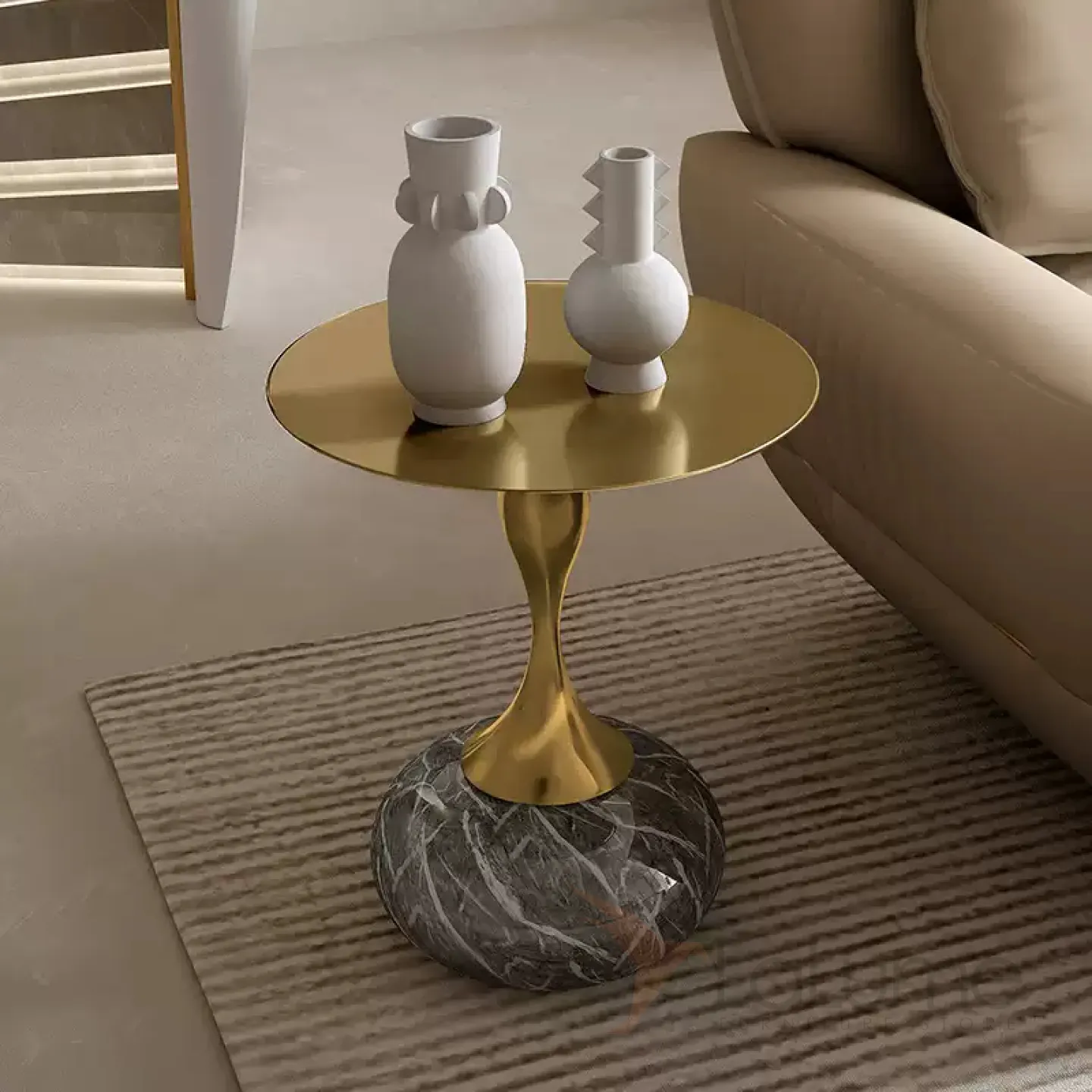 Журнальный столик, изготовленный из нержавеющей стали, характеризуется изысканной формой и элегантной ножкой, которая искусно имитирует текстуру и структуру мрамора.