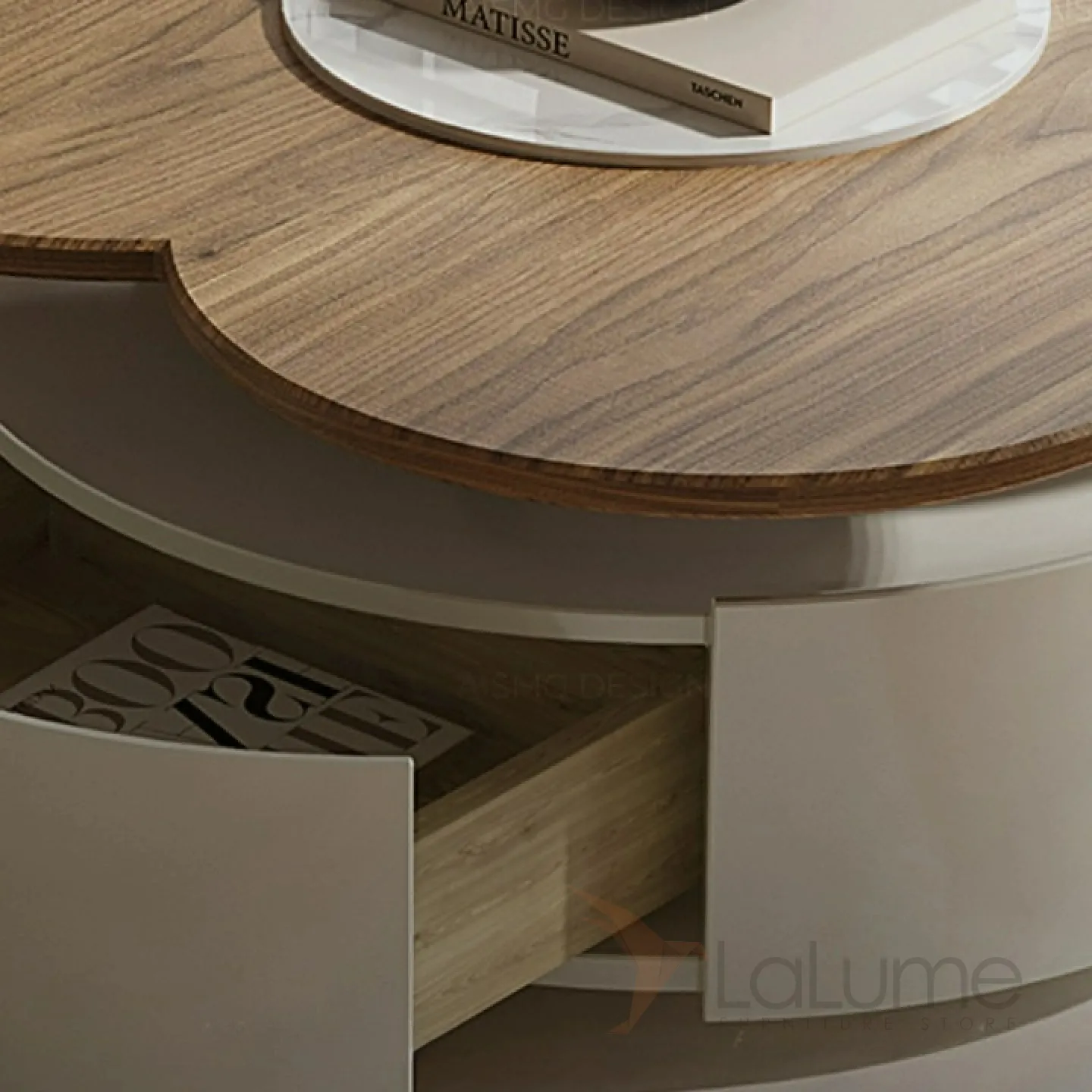 Низкий столик из дерева с шпоном. Оригинальная столешница выполнена из дерева. По бокам расположены два выдвижных ящика.