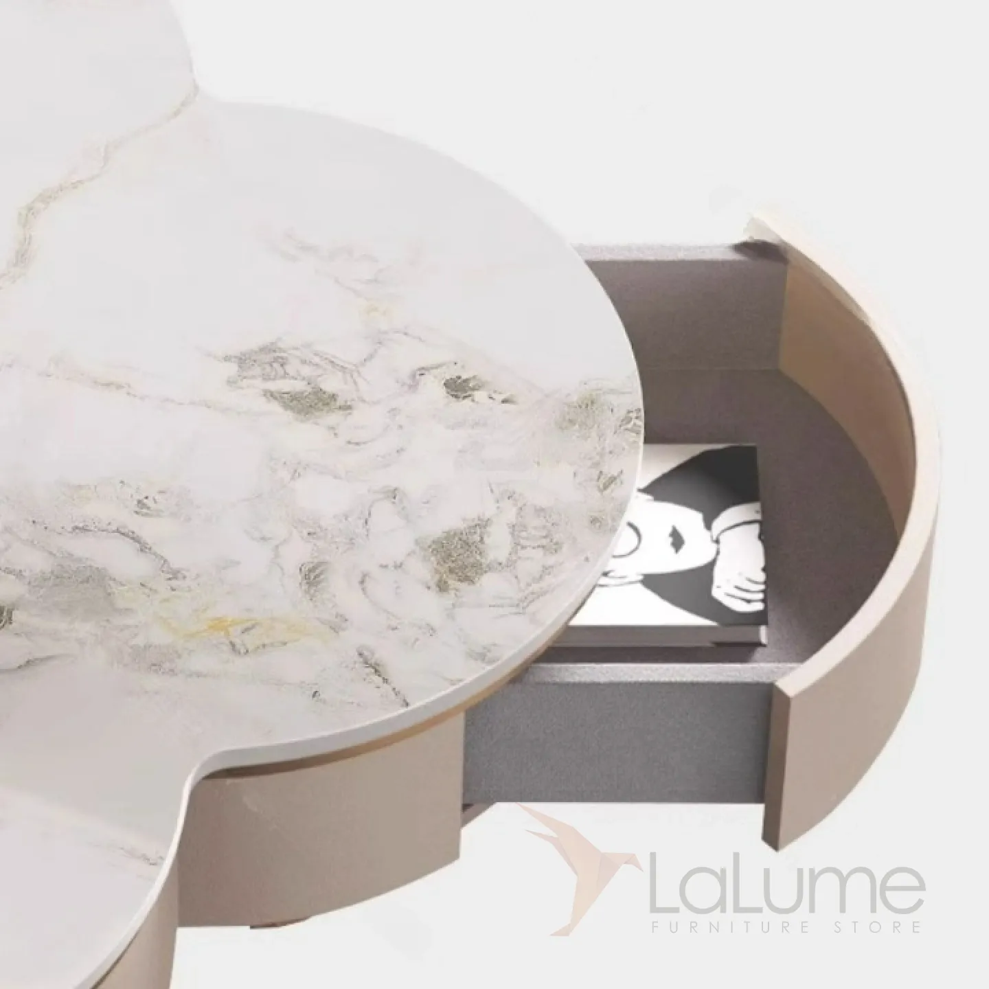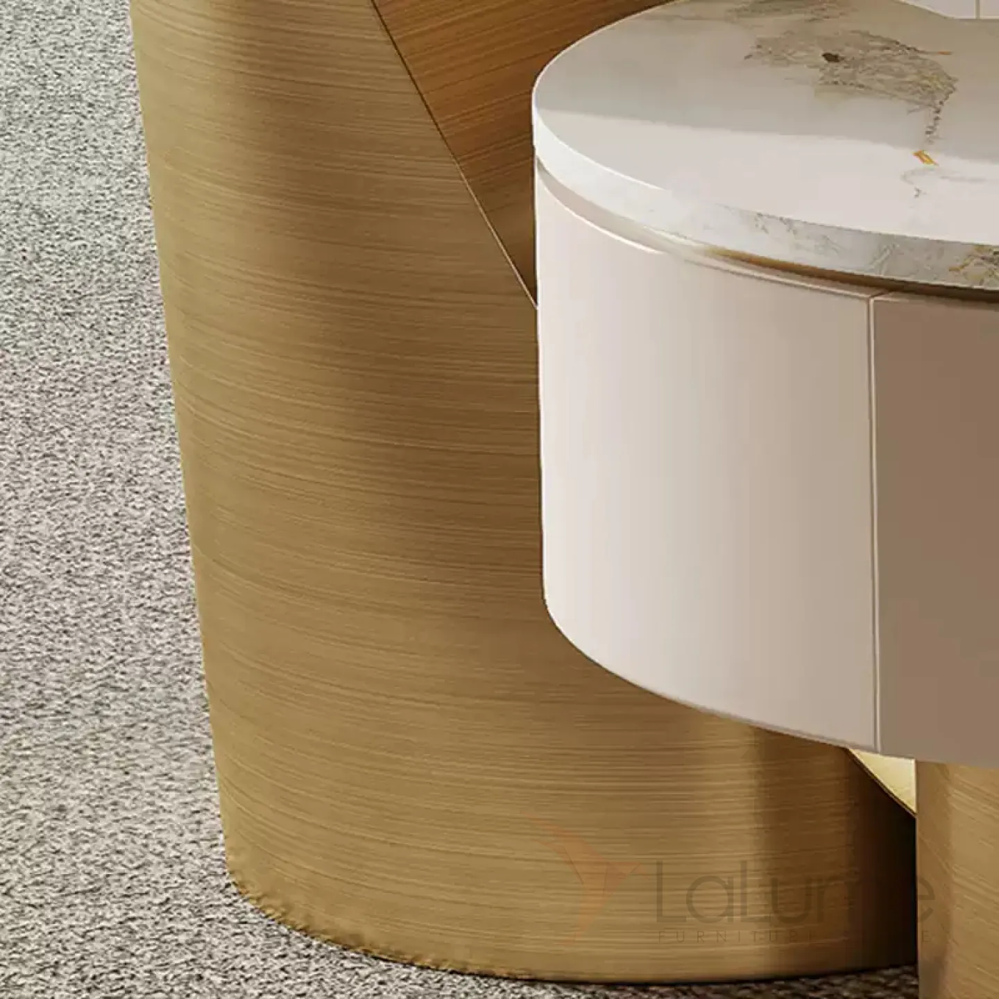 Низкий деревянный столик с шпоном, подстольем из нержавеющей стали и мраморной столешницей. По бокам — два выдвижных ящика.