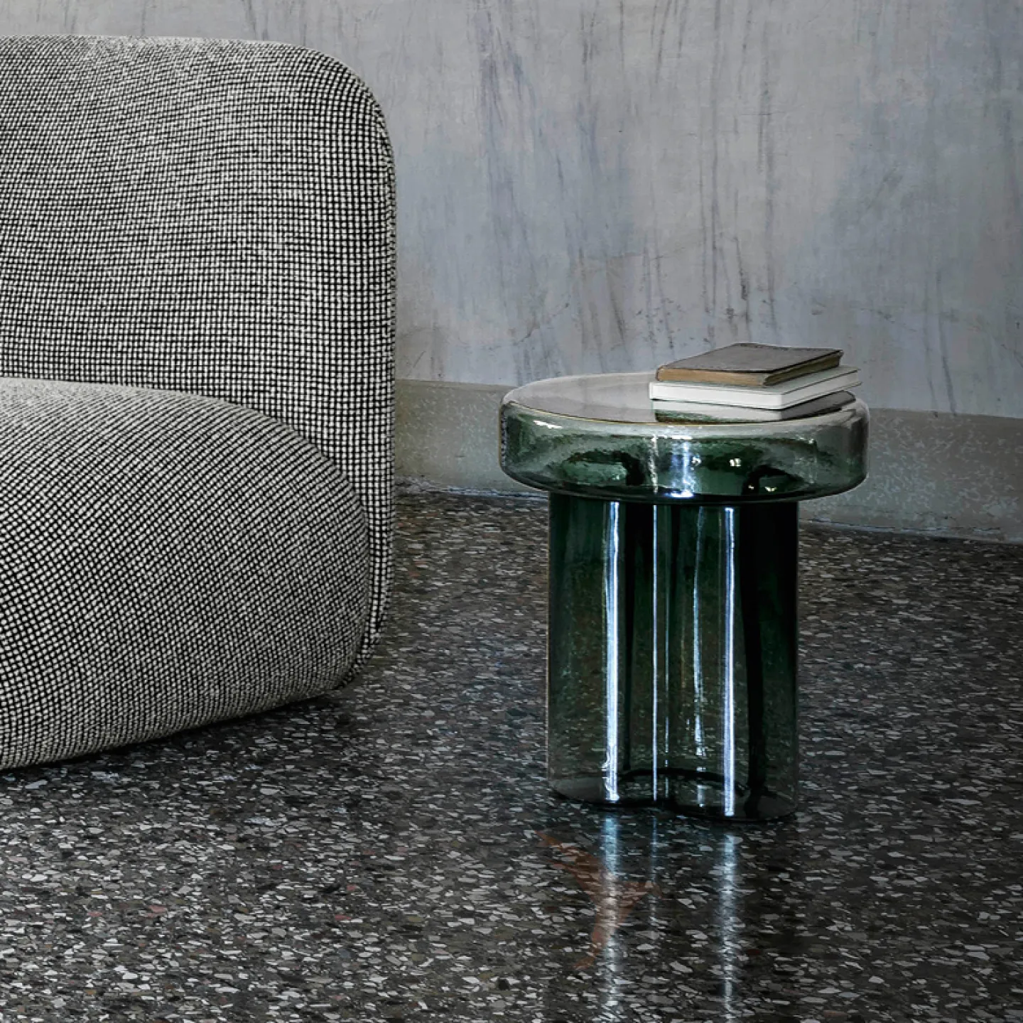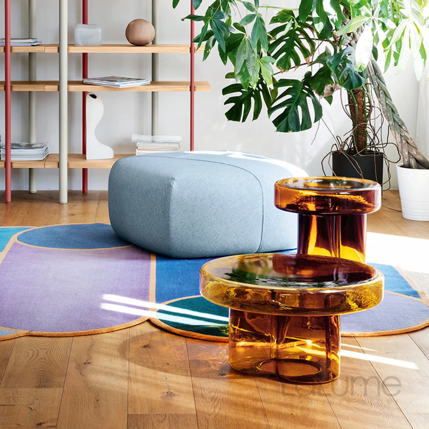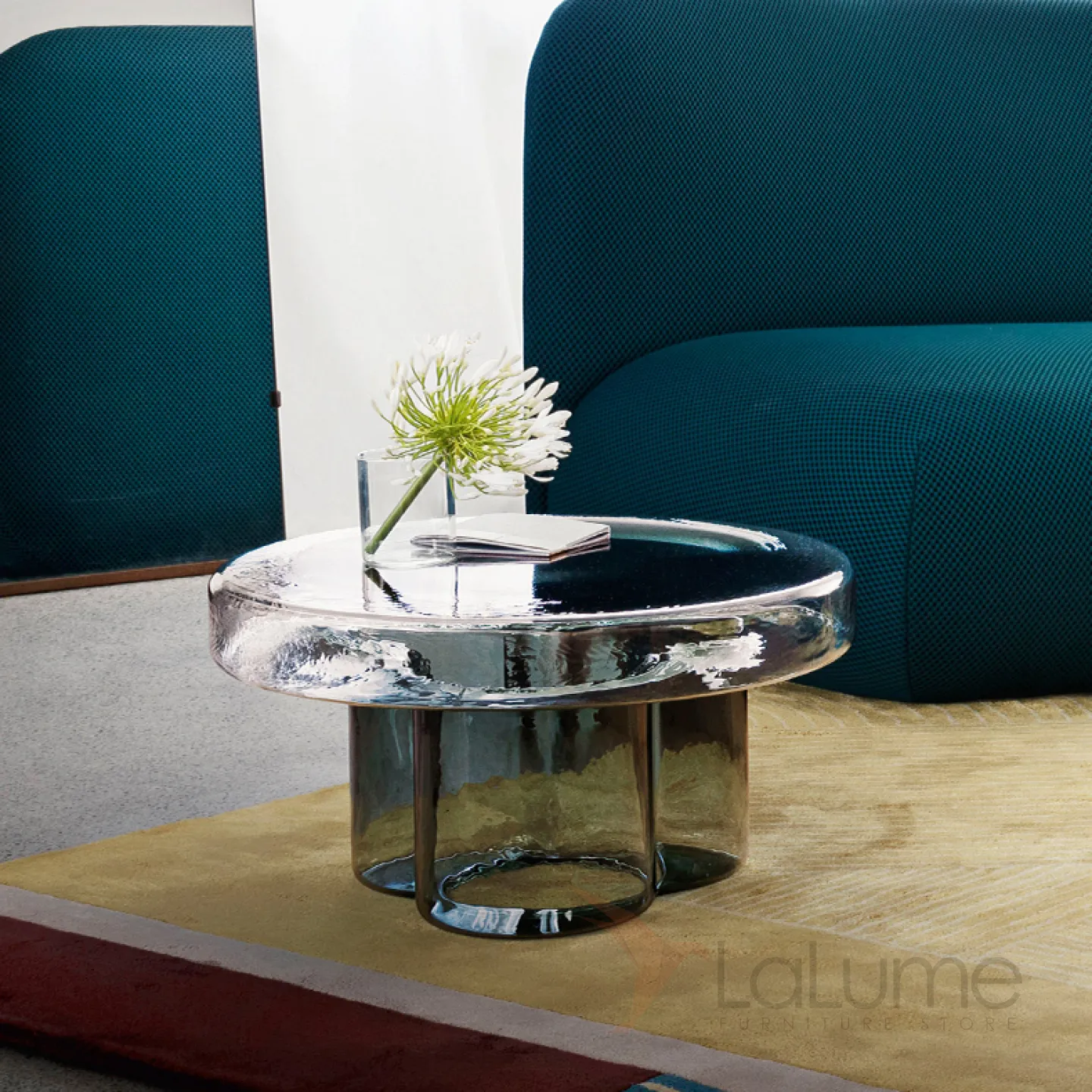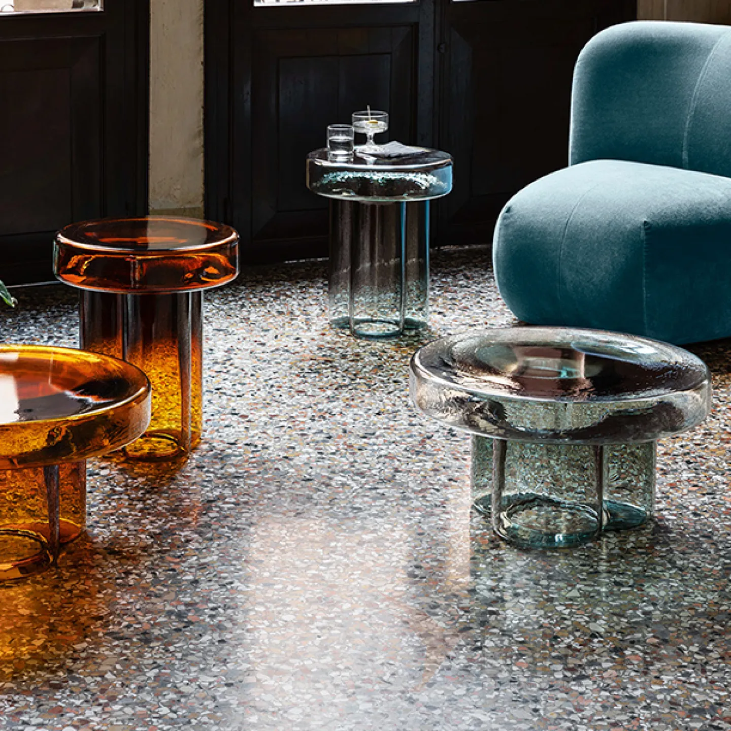 Элегантные журнальные столики из прозрачного стекла, изготовленные вручную методом выдувки. Доступны разные высоты и цвета.