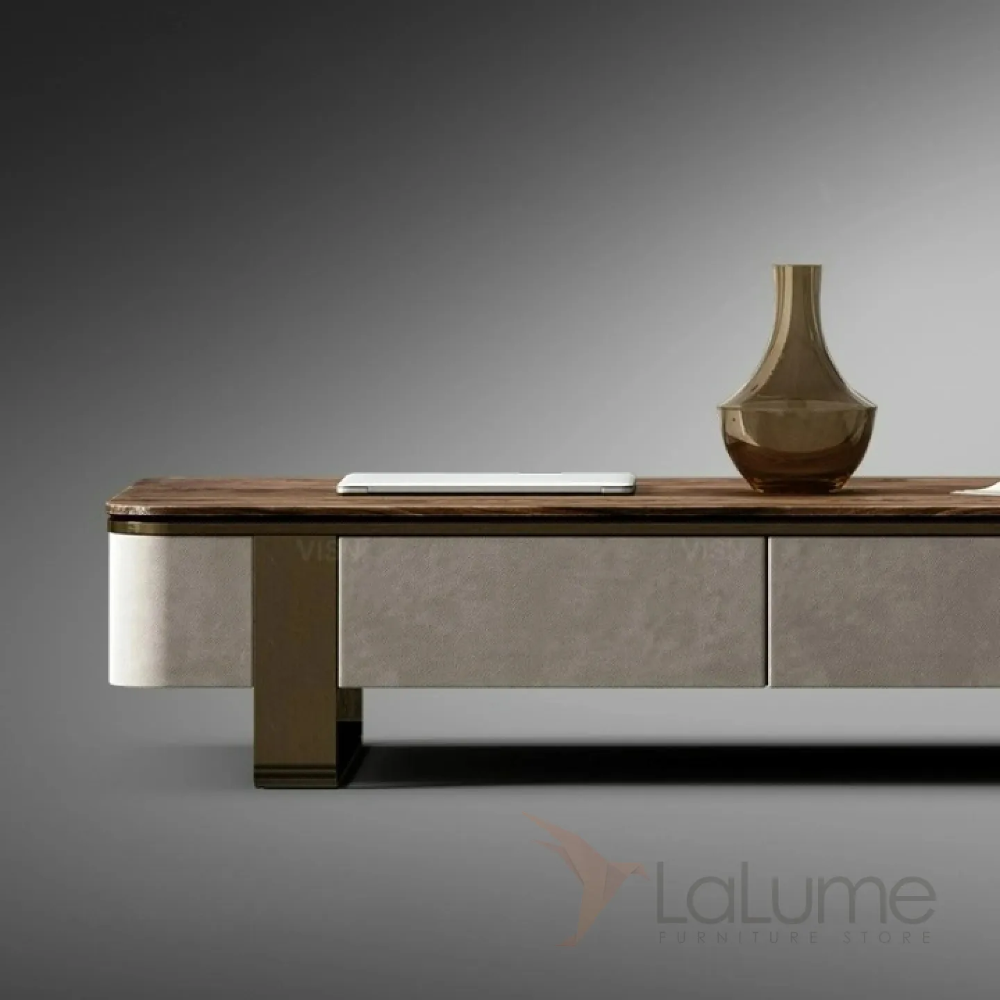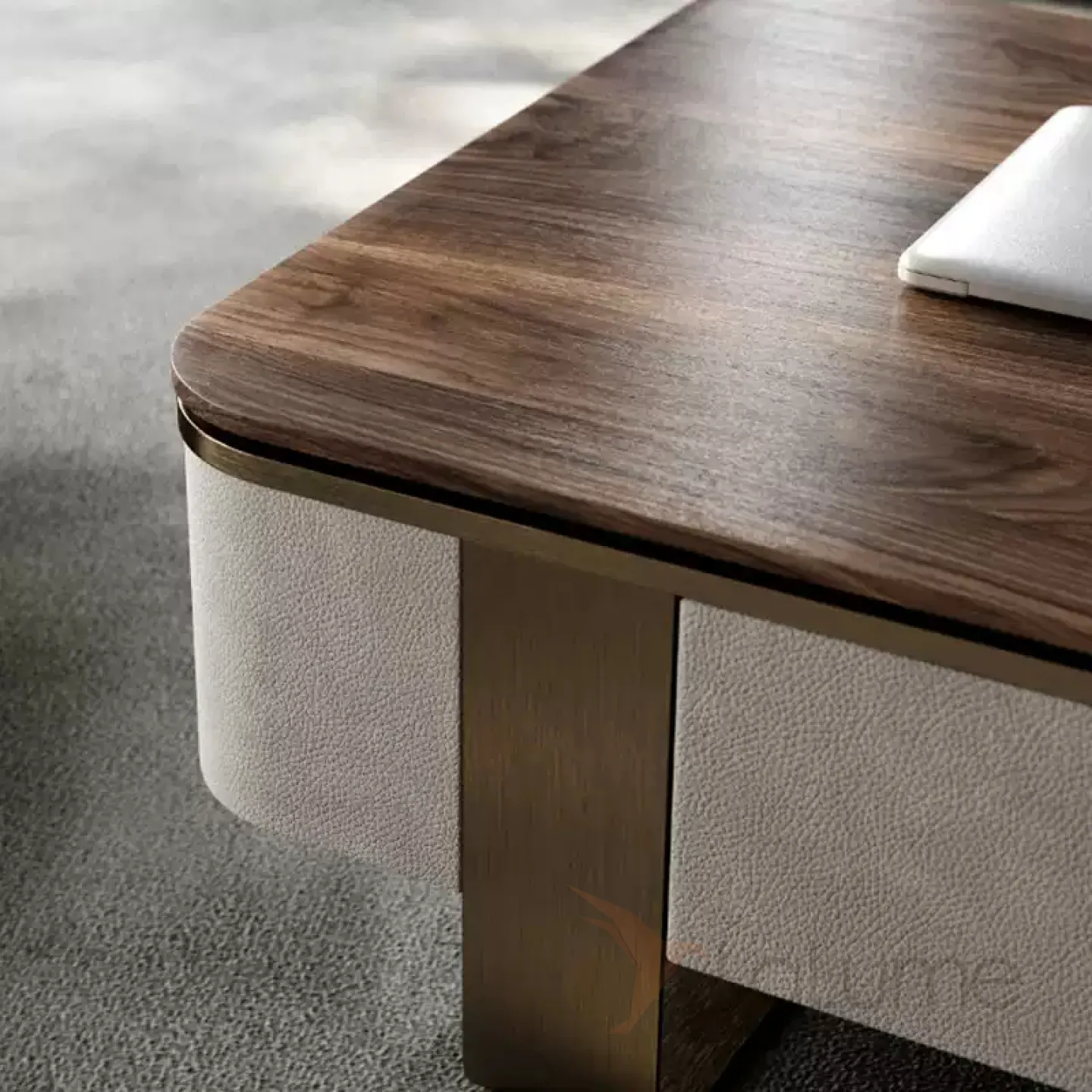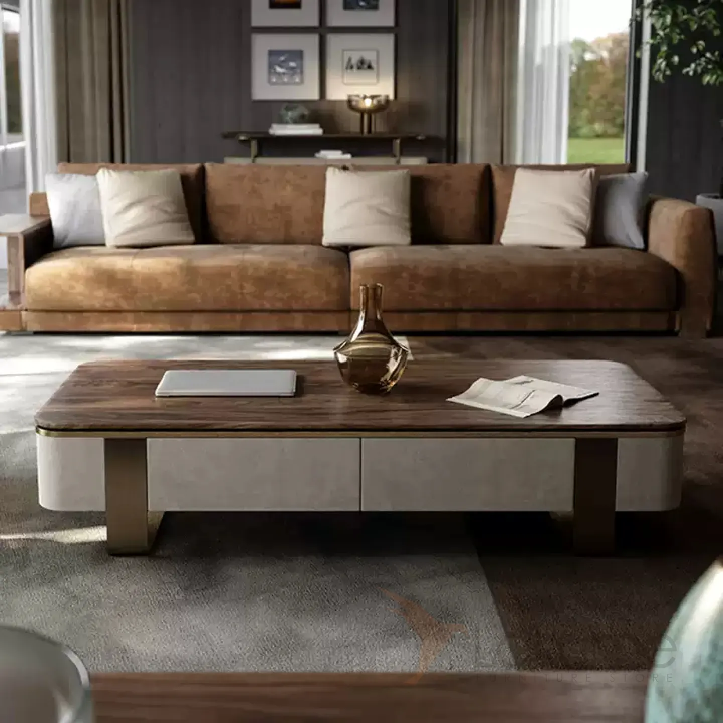 Журнальный столик из дерева с кожаной обивкой и столешницей из ореха. Ножки из нержавеющей стали, четыре вместительных ящика для хранения.