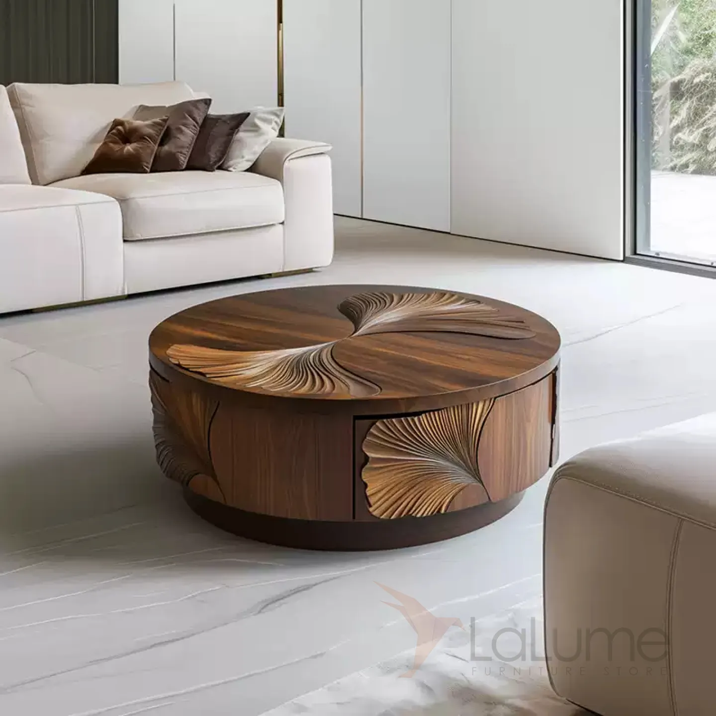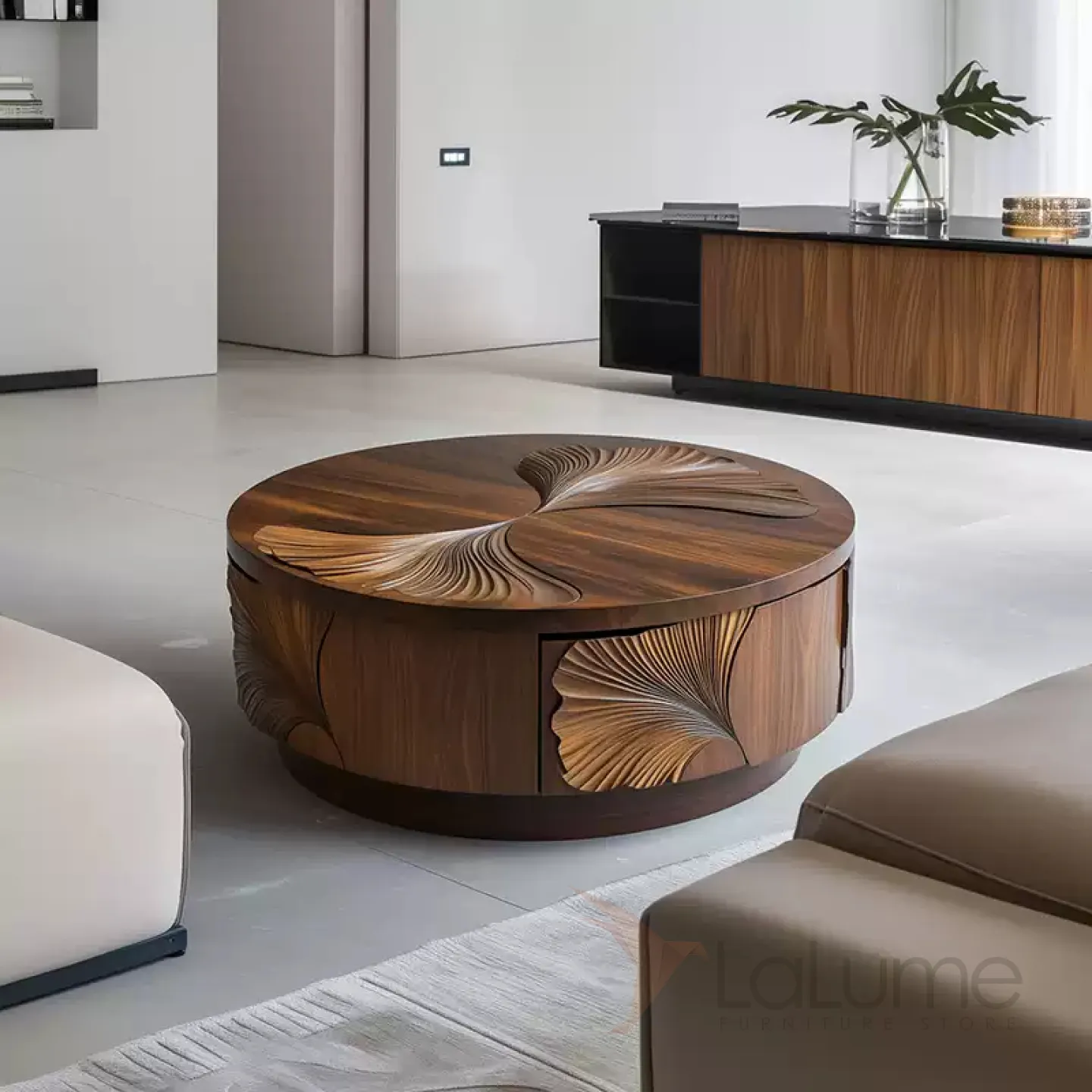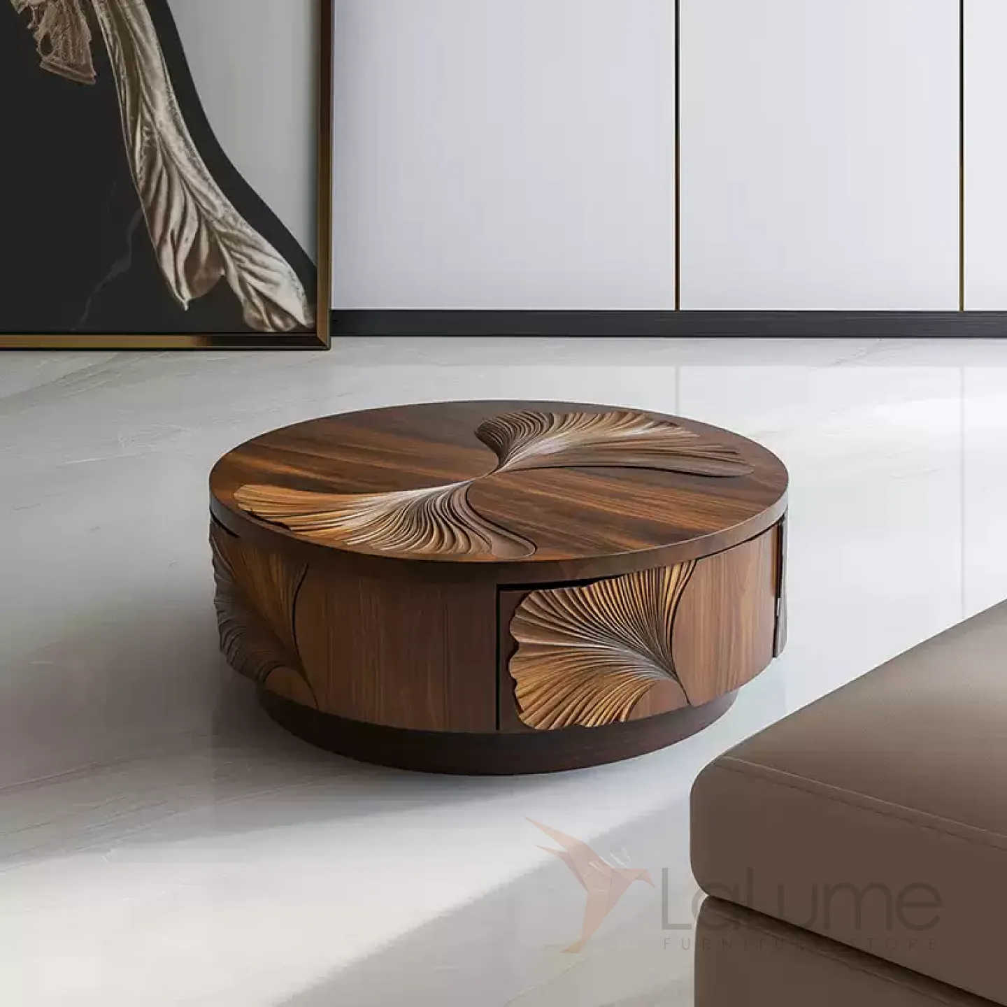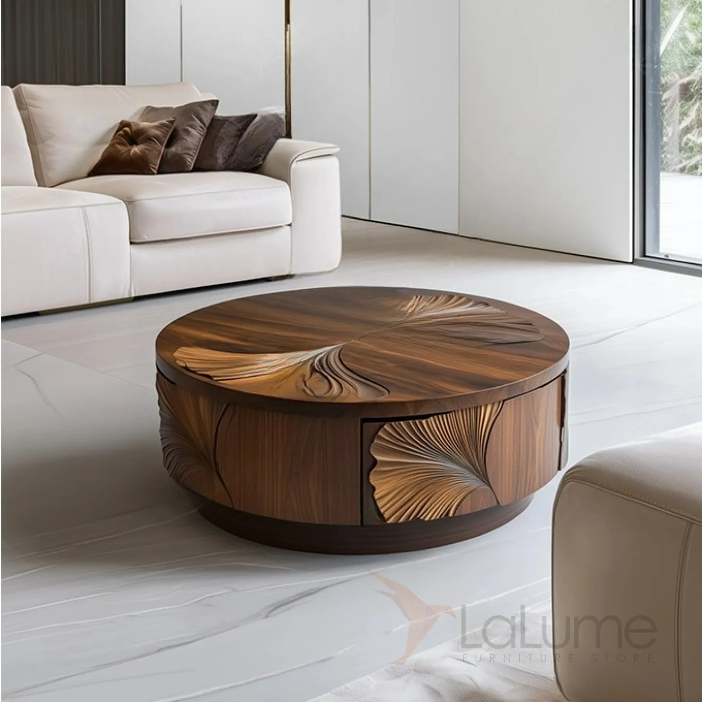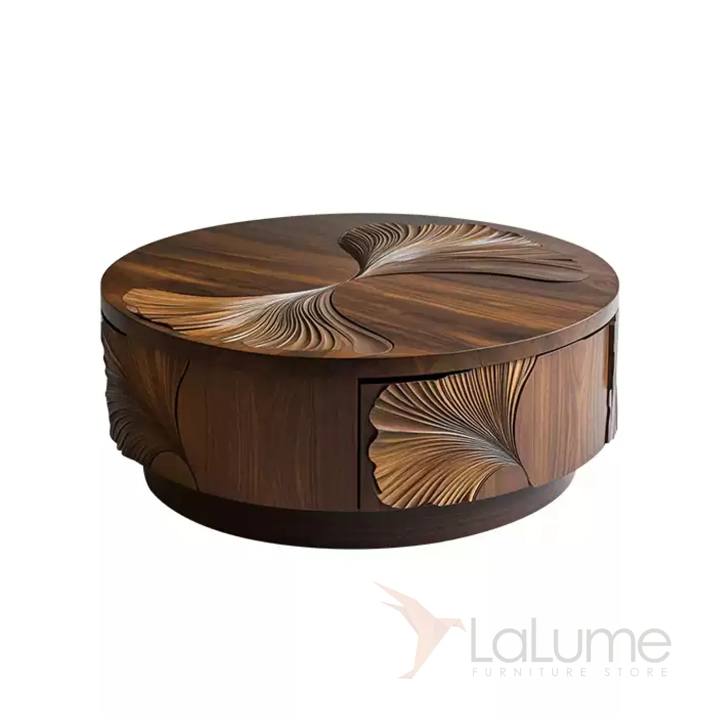 Журнальный столик из грецкого ореха ручной работы станет стильным акцентом в любом интерьере. Его основание выполнено из древесины павловнии. Изящная форма и резной декор подчеркнут индивидуальность вашего дома.